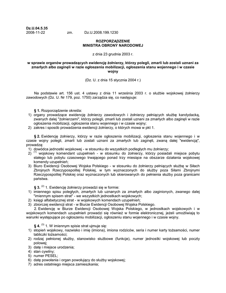 Dz.U.04.5.35 2008-11-22 zm. Dz.U.2008.199.1230 ROZPORZĄDZENIE MINISTRA OBRONY NARODOWEJ z dnia 23 grudnia 2003 r. w sprawie organów prowadzących ewidencję żołnierzy, którzy polegli, zmarli lub zostali uznani za zmarłych albo zaginęli w razie ogłoszenia mobilizacji, ogłoszenia stanu wojennego i w czasie wojny (Dz. U. z dnia 15 stycznia 2004 r.) Na podstawie art. 156 ust. 4 ustawy z dnia 11 września 2003 r. o służbie wojskowej żołnierzy zawodowych (Dz. U. Nr 179, poz. 1750) zarządza się, co następuje: § 1. Rozporządzenie określa: 1) organy prowadzące ewidencję żołnierzy zawodowych i żołnierzy pełniących służbę kandydacką, zwanych dalej "żołnierzami", którzy polegli, zmarli lub zostali uznani za zmarłych albo zaginęli w razie ogłoszenia mobilizacji, ogłoszenia stanu wojennego i w czasie wojny; 2) zakres i sposób prowadzenia ewidencji żołnierzy, o których mowa w pkt 1. § 2. Ewidencję żołnierzy, którzy w razie ogłoszenia mobilizacji, ogłoszenia stanu wojennego i w czasie wojny polegli, zmarli lub zostali uznani za zmarłych lub zaginęli, zwaną dalej "ewidencją", prowadzą: 1) dowódca jednostki wojskowej - w stosunku do wszystkich podległych mu żołnierzy; (1) 2) wojskowy komendant uzupełnień - w stosunku do żołnierzy, którzy posiadali miejsce pobytu stałego lub pobytu czasowego trwającego ponad trzy miesiące na obszarze działania wojskowej komendy uzupełnień; 3) Biuro Ewidencji Osobowej Wojska Polskiego - w stosunku do żołnierzy pełniących służbę w Siłach Zbrojnych Rzeczypospolitej Polskiej, w tym wyznaczonych do służby poza Siłami Zbrojnymi Rzeczypospolitej Polskiej oraz wyznaczonych lub skierowanych do pełnienia służby poza granicami państwa. (2) § 3. 1. Ewidencję żołnierzy prowadzi się w formie: 1) imiennego spisu poległych, zmarłych lub uznanych za zmarłych albo zaginionych, zwanego dalej "imiennym spisem strat" - we wszystkich jednostkach wojskowych; 2) księgi alfabetycznej strat - w wojskowych komendach uzupełnień; 3) zbiorczej ewidencji strat - w Biurze Ewidencji Osobowej Wojska Polskiego. 2. Ewidencję w Biurze Ewidencji Osobowej Wojska Polskiego, w jednostkach wojskowych i w wojskowych komendach uzupełnień prowadzi się również w formie elektronicznej, jeżeli umożliwiają to warunki występujące po ogłoszeniu mobilizacji, ogłoszeniu stanu wojennego i w czasie wojny. (3) 1) 2) 3) 4) 5) 6) 7) § 4. 1. W imiennym spisie strat ujmuje się: stopień wojskowy, nazwisko i imię (imiona), imiona rodziców, seria i numer karty tożsamości, numer tabliczki tożsamości; rodzaj pełnionej służby, stanowisko służbowe (funkcje), numer jednostki wojskowej lub poczty polowej; datę i miejsce urodzenia; stan cywilny; numer PESEL; datę powołania i organ powołujący do służby wojskowej; adres ostatniego miejsca zamieszkania; 8) nazwisko, imię i adres najbliższego członka rodziny; 9) datę, miejsce i okoliczności zgonu (znalezienia zwłok), uznania za zmarłego albo zaginięcia, ze wskazaniem dokładnego miejsca pochowania zwłok (przybliżone współrzędne topograficzne i skala mapy, położenie cmentarza, grobu wspólnego lub pojedynczego); 10) związek przyczynowy śmierci ze służbą wojskową (z wypadkiem przy pracy, chorobą zawodową, działaniami wojennymi); 11) adnotacje o przesłaniu zawiadomienia o poległym, zmarłym lub uznanym za zmarłego albo zaginionym. 2. Wzór imiennego spisu strat określa załącznik nr 1 do rozporządzenia. (4) 1) 2) 2a) 3) 4) 5) 6) 7) 8) § 5. 1. W księdze alfabetycznej strat ujmuje się: stopień wojskowy, nazwisko i imię (imiona), imiona rodziców, seria i numer karty tożsamości, numer tabliczki tożsamości; rodzaj pełnionej służby, stanowisko służbowe (funkcje), numer jednostki wojskowej (zmilitaryzowanej) lub poczty polowej; numer PESEL; datę i miejsce urodzenia; związek przyczynowy śmierci ze służbą wojskową (z wypadkiem przy pracy, chorobą zawodową, działaniami wojennymi); datę, miejsce i okoliczności zgonu (znalezienia zwłok), uznania za zmarłego albo zaginięcia, ze wskazaniem dokładnego miejsca pochowania zwłok (przybliżone współrzędne topograficzne i skala mapy, położenie cmentarza, grobu wspólnego lub pojedynczego); nazwisko, imię i adres najbliższego członka rodziny, któremu doręczono zawiadomienie (data i numer pisma wychodzącego); urząd stanu cywilnego, któremu przesłano zgłoszenie zgonu (data i numer pisma wychodzącego); adnotacje o odnalezieniu się żołnierza (podstawa, data i numer zawiadomienia przesłanego do rodziny). 2. Wzór księgi alfabetycznej strat określa załącznik nr 2 do rozporządzenia. § 6. Rozporządzenie wchodzi w życie z dniem 1 lipca 2004 r. ZAŁĄCZNIKI ZAŁĄCZNIK Nr 1 (5) WZÓR ................................ nazwa organu wojskowego (instytucji) lub poczty polowej Mu/82 IMIENNY SPIS POLEGŁYCH, ZMARŁYCH, UZNANYCH ZA ZMARŁYCH LUB ZAGINIONYCH za okres ...... Lp. Stopień wojskowy, nazwisko, imię (imiona), imiona rodziców, numer tabliczki tożsamości, seria i numer karty tożsamości Numer PESEL Status osoby, numer jednostki wojskowej (zmilitaryzowanej) lub poczty polowej Data powołania i organ powołujący do służby wojskowej Data i miejsce urodzenia Stan cywilny Adres ostatniego miejsca zamieszkania Naz imię najbl cz ro 1 2 3 m.p. 4 5 6 7 8 ........................... (podpis dowódcy jednostki wojskowej) UWAGA: W razie niemożności ustalenia danych personalnych poległych (zmarłych) żołnierzy i odnalezienia jedynie ich tabliczek lub kart tożsamości - należy w kolumnie "2" wpisać numery tabliczek tożsamości i/lub kart tożsamości, a pozostałe rubryki wypełnić w miarę posiadanych informacji. ZAŁĄCZNIK Nr 2 (6) WZÓR Mu/87 KSIĘGA ALFABETYCZNA STRAT ........................................................... (nazwa wojewódzkiego sztabu wojskowego, wojskowej komendy uzupełnień) Data założenia ...................... Data zakończen