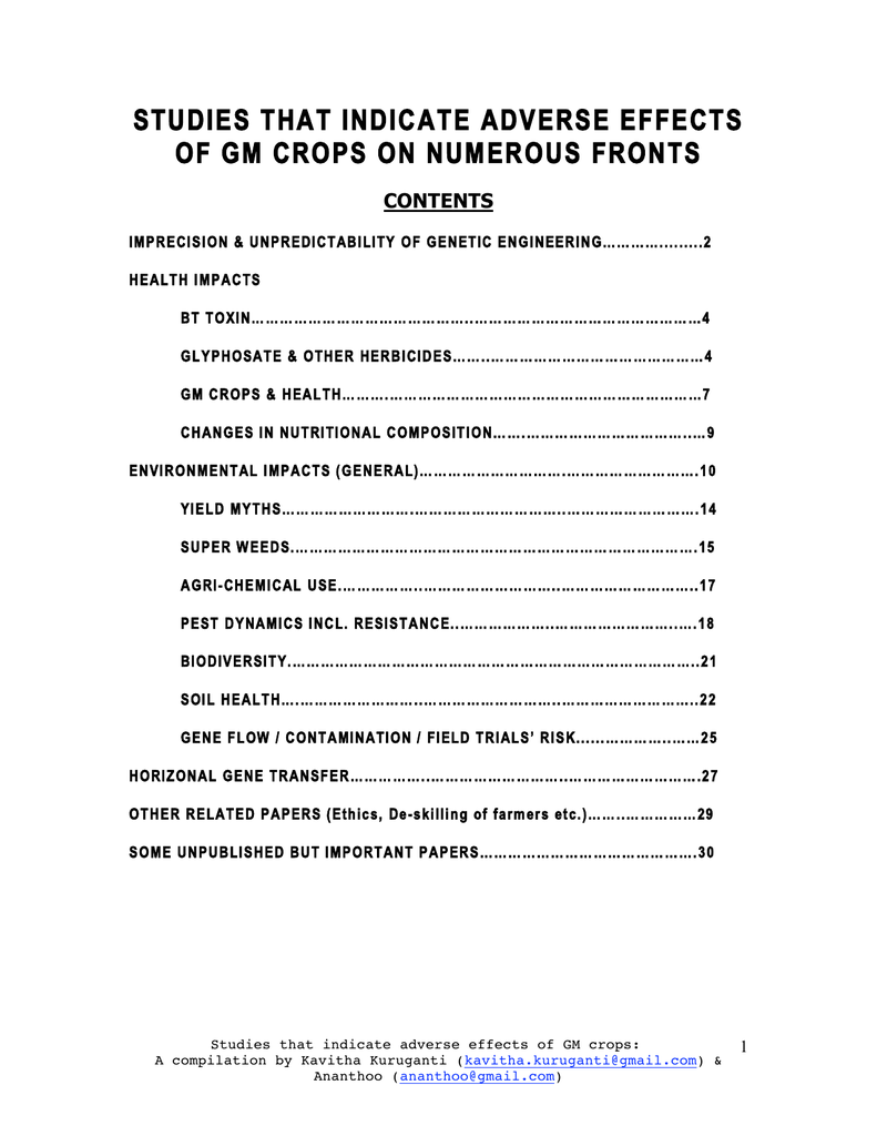 STUDIES THAT INDICATE ADVERSE EFFECTS OF GM CROPS ON NUMEROUS FRONTS CONTENTS IMPRECI SI ON & UNPREDI CTABI LI TY OF GENETIC ENGI NEERI NG…… ……. ... .... .2 HEALTH I MPACTS BT TOXI N… …… ……… …… ……… …… …….. …… …… ……… ……… …… ……… …4 GLYPHOSATE & OTHER HERBI CI DES…… ..… … ……… ……… …… ……… …… 4 GM CROPS & HEALTH… ……. …… ……… …… ……… ……… ……… …… ……… …7 CHANGES I N NUTRI TI ONAL COMPOSITI ON… …. ……… ……… …… ……… ..… 9 ENVI RONMENTAL I MPACTS ( GENERAL)… …… … ……… ……… .…… …… ……… ……. 10 YI ELD MYTHS…… …… ……… …… .…… …… ……… … …….. …… ……… …… ……. 14 SUPER W EEDS.… …… ……… …… ……… …… ……… ……… ……… …… ……… …. 15 AGRI - CHEMI CAL USE.… ……… ….. ……… …… …… …….. …… ……… …… …….. 17 PEST DYNAMI CS I NCL. RESI STANCE.. …… ……… …..… …… ……… ……. .…. 18 BI ODIVERSI TY. …… ……… …… ……… ……… …… … ……… ……… …… ……… ….. 21 SOI L HEALTH…. ……… …… ……… ..… …… ……… … …….. …… ……… …… …….. 22 GENE FLOW / CONTAMI NATI ON / FI ELD TRI ALS’ RI SK... ... ……… ….. …… 25 HORI ZONAL GENE TRANSFER……… ……. .… …… ……… ……… ..… …… ……… ……… .2 7 OTHER RELATED PAPERS ( Ethic s, De -ski lli ng of farm er s et c. )…… ..… …… …… 29 SOME UNPUBLI SHED BUT I MPORTANT PAPERS……… ……… …… ……… …… ……. 30 Studies that indicate adverse effects of GM crops: A compilation by Kavitha Kuruganti ([email protected]) & Ananthoo ([email protected]) 1 IMP RE CIS IO N & U NP RE D ICT A BIL ITY OF T HE S &T OF GE NET IC E NG INE E RIN G 1. Rawat Preeti, Amarjeet Kumar, Krishna Ray, Bhupendra Chaudhary, Sanjeev Kumar, Taru Gautam, Shaveta Kanoria, Gurpreet Kaur, Paritosh Kumar, Deepak Pental and Pradeep Kumar Burma (2011): Detrimental effect of expression of Bt endotoxin Cry1Ac on in vitro regeneration, in vivo growth and development of tobacco and cotton transgenics. Journal of Biosciences 36(2), June 2011, 363–376. 2. Jiao, Z., Si, X.X., Li, G.K., Zhang, Z.M., Xu, X.P. (2010): Unintended compositional changes in transgenic rice seeds (Oryza sativa L.) studied by spectral and chromatographic analysis coupled with chemometrics methods. J. Agric. Food Chem. 58, 1746–1754. 3. Zeller SL, Kalinina O, Brunner S, Keller B and Schmid B (2010): Transgene X environment interactions in genetically modified wheat. PLoS One. Jul 12; 5(7): e11405 4. Zolla, L., Rinalducci, S., Antonioli, P., Righetti, P.G. (2008): Proteomics as a complementary tool for identifying unintended side effects occurring in transgenic maize seeds as a result of genetic modifications. Journal of Proteome Research 7, 1850–1861. 5. Rosati A, Bogani P, Santarlasci A and Bulatti M (2008): Characterisation of 3’ transgene insertion site and derived mRNAs in MON810 YieldGard maize. Plant Mol Biol. 67 (3): 271-81. 6. Aguilera M, Querci M, Balla B, Prospero A, Ermolli M, Van den Eede G (2008): A Qualitative Approach for the Assessment of the Genetic Stability of the MON 810 Trait in Commercial Seed Maize Varieties. Food Anal. Methods (2008) 1:252–258 7. Dong HZ and Li WJ (2007): Variability of endotoxin expression in Bt transgenic cotton. J. Agron. Crop Sci. 193 (1), 21–29. 8. Manetti C, Bianchetti C, Casciani L, Castro C, Di Cocco ME, Miccheli A, Motto M, Conti F (2006): A metabonomic study of transgenic maize (Zea mays) seeds revealed variations in osmolytes and branched amino acids. J Exp Bot 57 (11):2613-2625 9. Wilson, A.K., Latham, J.R., Steinbrecher, R.A. (2006): Transformation-induced mutations in transgenic plants: Analysis and biosafety implications. Biotechnology and Genetic Engineering Reviews 23, 209–234. 10. Latham, J.R. Wilson, A.K., Steinbrecher, R.A. (2006): The mutational consequences of plant transformation. J. of Biomedicine and Biotechnology 2006, 1–7. 11. Prescott, V.E., Campbell, P.M., Moore, A., Mattes, J., Rothenberg, M.E., Foster, P.S., Higgins, T.J., Hogan, S.P. (2005): Transgenic expression of bean α-amylase inhibitor Studies that indicate adverse effects of GM crops: A compilation by Kavitha Kuruganti ([email protected]) & Ananthoo ([email protected]) 2 in peas results in altered structure and immunogenicity. Journal of Agricultural and Food Chemistry 53, 9023–9030. 12. Rang, A., Linke, B., Jansen, B. (2005): Detection of RNA variants transcribed from the transgene in Roundup Ready soybean. Eur Food Res Technol 220, 438–43. 13. Windels, P., Taverniers, I., Depicker, A., Van Bockstaele, E., De Loose, M. (2001): Characterisation of the Roundup Ready soybean insert. Eur Food Res Technol 213, 107–112. 14. Horvath H, Jensen L G, Wong O T, Kohl E, Ullrich S E, Cochran J, Kannangara C G, von Wettstein D (2001): Stability of transgene expression, field performance and recombination breeding of transformed barley lines, Theoretical and Applied Genetics, Vol 102 (1), 1-11. 15. Tax FE, Vernon D M (2001): T-DNA-associated duplication/translocations in Arabidopsis. Implications for mutant analysis and functional genomics. Plant Physiol. 2001 Aug 126 (4): 1527-38. 16. Svitashev S, Ananiev E, Pawlowski W P, Somers D A (2000): Association of transgene integration sites with chromosome rearrangements in hexaploid oat. Theor Appl Genet 100, 872-880. 17. Kumpatla S P, Chandrasekharan MB, Iyer ML, Li G, Hall TC (1998): Genome intruder scanning and modulation systems and transgene silencing. Trends in Plant Science, Vol 3, Issue 3, March 1998. 97-104. 18. Pawlowski WP, Somers DA (1996): Transgene inheritance in plants genetically engineered by microprojectile bombardment. Mol Biotechnol. 6 (1): 17