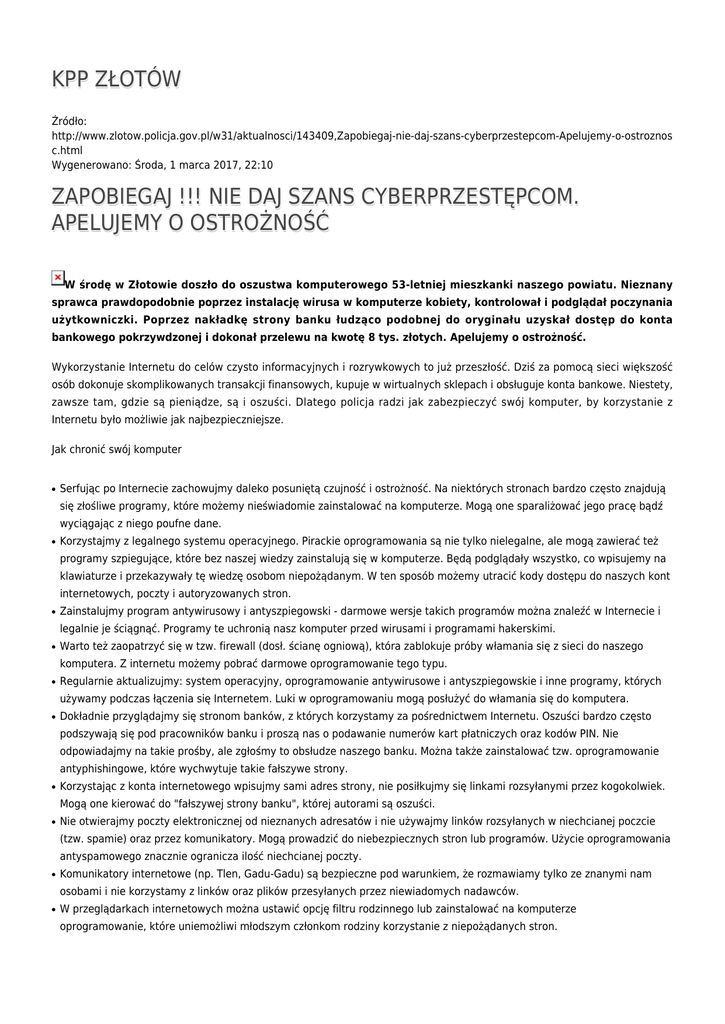 KPP ZŁOTÓW Źródło: http://www.zlotow.policja.gov.pl/w31/aktualnosci/143409,Zapobiegaj-nie-daj-szans-cyberprzestepcom-Apelujemy-o-ostroznos c.html Wygenerowano: Środa, 1 marca 2017, 22:10 ZAPOBIEGAJ !!! NIE DAJ SZANS CYBERPRZESTĘPCOM. APELUJEMY O OSTROŻNOŚĆ W środę w Złotowie doszło do oszustwa komputerowego 53-letniej mieszkanki naszego powiatu. Nieznany sprawca prawdopodobnie poprzez instalację wirusa w komputerze kobiety, kontrolował i podglądał poczynania użytkowniczki. Poprzez nakładkę strony banku łudząco podobnej do oryginału uzyskał dostęp do konta bankowego pokrzywdzonej i dokonał przelewu na kwotę 8 tys. złotych. Apelujemy o ostrożność. Wykorzystanie Internetu do celów czysto informacyjnych i rozrywkowych to już przeszłość. Dziś za pomocą sieci większość osób dokonuje skomplikowanych transakcji finansowych, kupuje w wirtualnych sklepach i obsługuje konta bankowe. Niestety, zawsze tam, gdzie są pieniądze, są i oszuści. Dlatego policja radzi jak zabezpieczyć swój komputer, by korzystanie z Internetu było możliwie jak najbezpieczniejsze. Jak chronić swój komputer ● Serfując po Internecie zachowujmy daleko posuniętą czujność i ostrożność. Na niektórych stronach bardzo często znajdują się złośliwe programy, które możemy nieświadomie zainstalować na komputerze. Mogą one sparaliżować jego pracę bądź wyciągając z niego poufne dane. ● Korzystajmy z legalnego systemu operacyjnego. Pirackie oprogramowania są nie tylko nielegalne, ale mogą zawierać też programy szpiegujące, które bez naszej wiedzy zainstalują się w komputerze. Będą podglądały wszystko, co wpisujemy na klawiaturze i przekazywały tę wiedzę osobom niepożądanym. W ten sposób możemy utracić kody dostępu do naszych kont internetowych, poczty i autoryzowanych stron. ● Zainstalujmy program antywirusowy i antyszpiegowski - darmowe wersje takich programów można znaleźć w Internecie i legalnie je ściągnąć. Programy te uchronią nasz komputer przed wirusami i programami hakerskimi. ● Warto też zaopatrzyć się w tzw. firewall (dosł. ścianę ogniową), która zablokuje próby włamania się z sieci do naszego komputera. Z internetu możemy pobrać darmowe oprogramowanie tego typu. ● Regularnie aktualizujmy: system operacyjny, oprogramowanie antywirusowe i antyszpiegowskie i inne programy, których używamy podczas łączenia się Internetem. Luki w oprogramowaniu mogą posłużyć do włamania się do komputera. ● Dokładnie przyglądajmy się stronom banków, z których korzystamy za pośrednictwem Internetu. Oszuści bardzo często podszywają się pod pracowników banku i proszą nas o podawanie numerów kart płatniczych oraz kodów PIN. Nie odpowiadajmy na takie prośby, ale zgłośmy to obsłudze naszego banku. Można także zainstalować tzw. oprogramowanie antyphishingowe, które wychwytuje takie fałszywe strony. ● Korzystając z konta internetowego wpisujmy sami adres strony, nie posiłkujmy się linkami rozsyłanymi przez kogokolwiek. Mogą one kierować do "fałszywej strony banku", której autorami są oszuści. ● Nie otwierajmy poczty elektronicznej od nieznanych adresatów i nie używajmy linków rozsyłanych w niechcianej poczcie (tzw. spamie) oraz przez komunikatory. Mogą prowadzić do niebezpiecznych stron lub programów. Użycie oprogramowania antyspamowego znacznie ogranicza ilość niechcianej poczty. ● Komunikatory internetowe (np. Tlen, Gadu-Gadu) są bezpieczne pod warunkiem, że rozmawiamy tylko ze znanymi nam osobami i nie korzystamy z linków oraz plików przesyłanych przez niewiadomych nadawców. ● W przeglądarkach internetowych można ustawić opcję filtru rodzinnego lub zainstalować na komputerze oprogramowanie, które uniemożliwi młodszym członkom rodziny korzystanie z niepożądanych stron. Jak działają internetowi oszuści? Pierwszy ze sposobów : użytkownik loguje się do konta bankowego, a zainstalowany wcześniej przez cyberprzestępcę, wirus czyta dane logowania (to pierwszy krok cyberprzestępcy). Drugi krok to podstawienie użytkownikowi jakiegoś fałszywego komunikatu, po to, żeby zawnioskował o przesłanie kodu SMS i wpisał go we wskazanym miejscu (na "nakładce", podsuniętej na ekran komputera, dzięki czemu klient potwierdza, że zatwierdza inną transakcję, niż myśli. Faktycznie tym SMS-em definiuje nowego odbiorcę przelewów. Potem złodziej jeszcze raz loguje się na konto, zbiera pieniądze ze wszystkich rachunków i zaczyna wysyłać przelewy na rachunki "słupów". Drugi sposób jest nieco bardziej skomplikowany. Złodziej ustala "szpieguje" numer telefonu klienta (można podsunąć mu jakiś komunikat z żądaniem wpisania numeru telefonu na ekranie obserwowanego komputera), a potem zdalnie wysłać wirusa (pod pozorem aktualizacji aplikacji), który ma za zadanie przekierowywać SMS-y autoryzacyjne do złodziei. Sposób trzeci: na komputerze złodziej instaluje oprogramowanie, które potrafi "podmieniać" numer konta w tzw. schowku na komputerze. Czyli w sytuacji, w której przenosimy (na zasadzie copy-paste) numer rachunku z jakiegoś dokumentu, żeby go wpisać do formatki przelewu. Autoryzujemy prawdziwy przelew, tylko na nieprawdziwe konto. Bądźmy ostrożni również na oszustwa sms Jest to zwykłe oszustwo polegające na wyłudzeniu pieniędzy poprzez sms. Na ogół użytkownicy wchodzą na stronę www, gdzie można wysłać e-kartkę do znajomych, rodziny, albo zapłacić wróżce za wróżbę, obejrzeć zdjęcia, zrobić test iq itd. Kombinacji jest wiele, które są uzależnione tylko od fantazji oszustów. Na ogół jest napisane, że wysłanie sms kosztuje 1pln, a później się okazuje, że z konta telefonicznego ubyło wam 20pln, 25pln, czy 30, albo i więcej. To już nie jest oszustwo internetowe, ale wiąże się z tym tematem. Wiele z nas otrzymuje sms typu: wygrałeś, odpisz TAK, aby odebrać nagrodę, albo: ostatnie 