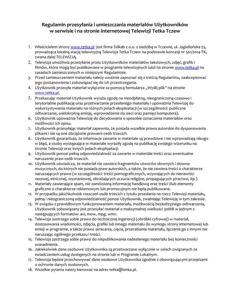 Regulamin przesyłania i umieszczania materiałów Użytkowników w serwisie i na stronie internetowej Telewizji Tetka Tczew 1. Właścicielem strony www.tetka.pl jest firma Telkab z o.o. z siedzibą w Tczewie, ul. Jagiellońska 55, 2. 3. 4. 5. 6. 7. 8. 9. 10. 11. 12. 13. 14. 15. 16. 17. 18. prowadząca lokalną stację telewizyjną Telewizja Tetka Tczew na podstawie koncesji nr 561/2014-TK, zwana dalej TELEWIZJĄ. Telewizja umożliwia przesyłanie przez Użytkowników materiałów tekstowych, zdjęć, grafik i filmów, które mogą być publikowane w programie telewizyjnych lub/i na stronie www.tetka.pl na zasadach zamieszczonych w niniejszym Regulaminie. Przed zamieszczeniem materiału należy uważnie zapoznać się z treścią Regulaminu, zaakceptować jego postanowienia i zobowiązać się do ich przestrzegania. Użytkownik przesyła materiał wyłącznie za pomocą formularza „Wyślij plik” na stronie www.tetka.pl. Przekazując materiał Użytkownik wyraża zgodę na nieodpłatną, nieograniczoną czasowo i terytorialnie publikację oraz przetwarzanie przesłanego materiału i upoważnia Telewizję do wykorzystywania materiału na różnych polach eksploatacji (w szczególności: publiczne odtwarzanie, wielokrotną emisję, wprowadzenie do sieci oraz pamięci komputera). Użytkownik upoważnia Telewizję do decydowania o sposobie oznaczenia materiałów oraz możliwości ich opisu. Użytkownik przesyłając materiał zapewnia, że posiada wszelkie prawa autorskie do dysponowania plikami i nie są one obciążone prawami osób trzecich. Użytkownik gwarantuje, że informacje zawarte w materiale są prawdziwe i nie wprowadzają nikogo w błąd, a osoby występujące w materiale wyraziły zgodę na publikację swojego wizerunku na stronie Telewizji oraz innych polach eksploatacji. Użytkownik ponosi pełną odpowiedzialność za zawarte w materiale treści oraz ewentualne naruszenie praw osób trzecich. Użytkownik oświadcza, że materiał nie zawiera fragmentów utworów słownych i słownomuzycznych, do których nie posiada praw autorskich, a także, że nie zawiera treści o charakterze naruszających prawo (w szczególności: treści pornograficznych, wzywających do nienawiści rasowej, etnicznej, wyznaniowej, obrażających uczucia religijne, propagujących piractwo, itp.) Materiały zawierające spam, nie zamówioną informację handlową oraz treści i/lub elementy graficzne o charakterze reklamowym lub promocyjnym nie będą publikowane. W przypadku jakichkolwiek roszczeń osób trzecich z tytułu przesłania na rzecz Telewizji materiału, pełną i nieograniczoną odpowiedzialność ponosi Użytkownik, zwalniając Telewizję w tym zakresie. W związku z prawidłowym funkcjonowaniem materiału, możliwością bezkolizyjnego odtwarzania, Użytkownik zobowiązany jest przesyłać materiał o maksymalnej wielkości 30MB w jednym z następujących formatów: avi, mow, mpg, wmv. Telewizja zastrzega sobie prawo do technicznej ingerencji (obróbki cyfrowej) w materiał, dostosowania wiadomości, zdjęcia, grafiki lub innego materiału do wymogu strony internetowej lub emisji w programie, a także prawo skracania, cięcia, przerabiania materiału, łączenia go z innymi nie naruszając ogólnego przekazu i treści. Telewizja zastrzega sobie prawo do niepublikowania nadesłanego materiału bez konieczności uzasadnienia. Jakiekolwiek dane osobowe Użytkownika są przetwarzane wyłącznie w celach związanych ze świadczeniem usług dostępnych na stronie lub w Programie Lokalnym. Telewizja będzie przechowywać dane osobowe Użytkownika zgodnie z obowiązującymi przepisami o ochronie danych osobowych. Wszelkie pytania należy kierować na adres [email protected].