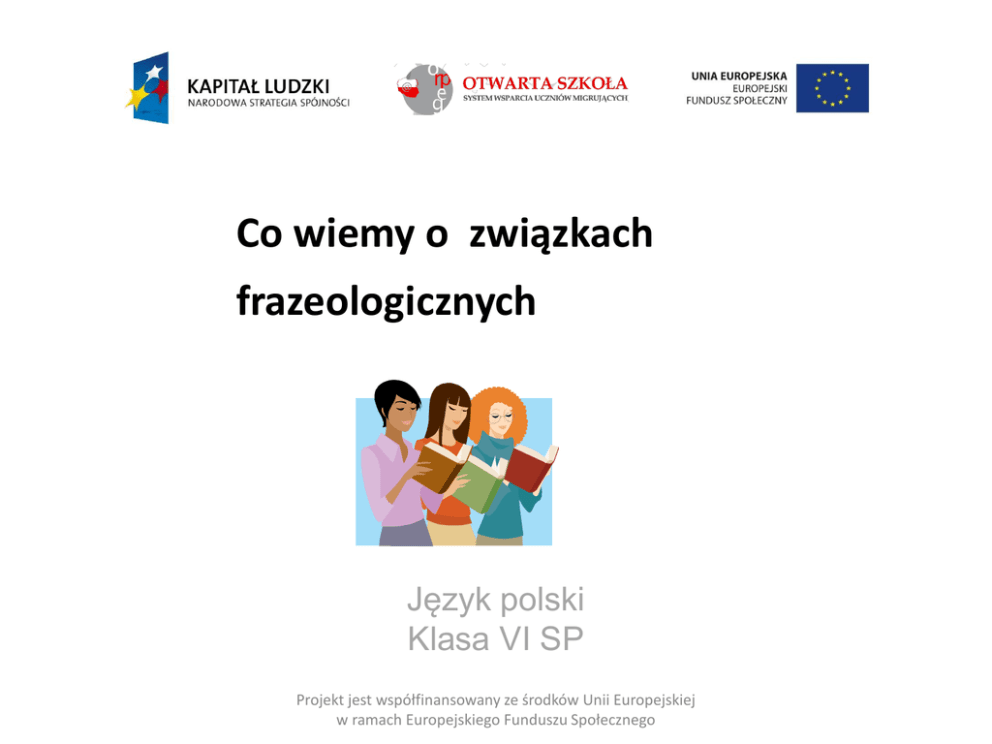 Co wiemy o związkach frazeologicznych Język polski Klasa VI SP Projekt jest współfinansowany ze środków Unii Europejskiej w ramach Europejskiego Funduszu Społecznego Plan 1. 2. 3. 4. 5. 6. Definicja związku frazeologicznego. Przykłady frazeologizmów. Znaczenie związku frazeologicznego (złote serce, biały kruk). Rodzaje związków frazeologicznych (stałe i łączliwe). Źródła wyrażeń frazeologicznych (Biblia, mitologia, język potoczny, reklama). Ciekawostka - związek frazeologiczny jako slogan reklamowy, czyli „najdroższe zdanie świata”. Projekt jest współfinansowany ze środków Unii Europejskiej w ramach Europejskiego Funduszu Społecznego Definicja Związek frazeologiczny Jest to połączenie dwóch lub więcej wyrazów: • złote serce • biały kruk • czuć się jak ryba w wodzie Projekt jest współfinansowany ze środków Unii Europejskiej w ramach Europejskiego Funduszu Społecznego Przykłady Wyjaśnianie znaczeń związków frazeologicznych • kłamać jak z nut • niedźwiedzia przysługa • węzeł gordyjski • celowo kłamać , oszukiwać • przysługa przynosząca szkodę temu , komu chciano przysłużyć • zagadka trudna do rozwiązania; skomplikowany problem • czarna polewka • odmowa • pięta Achillesa • oznaczający słaby punkt kogoś lub czegoś Projekt jest współfinansowany ze środków Unii Europejskiej w ramach Europejskiego Funduszu Społecznego Znaczenie /1/ Znaczenie związku frazeologicznego • nie wynika ze znaczeń poszczególnych słów • nie jest ich prostą sumą • jest zatem znaczeniem przenośnym Projekt jest współfinansowany ze środków Unii Europejskiej w ramach Europejskiego Funduszu Społecznego Znaczenie /2/ Złote serce? złote + serce = • Dlatego związku frazeologicznego złote serce nie odczytujemy dosłownie. Mieć złote serce oznacza być dobrym, wrażliwym, uczuciowym człowiekiem. Projekt jest współfinansowany ze środków Unii Europejskiej w ramach Europejskiego Funduszu Społecznego Znaczenie /3/ Biały kruk ? biały + kruk = Związek frazeologiczny biały kruk oznacza: • bardzo rzadki egzemplarz książki lub publikacji • człowieka o nietypowych dla danego społeczeństwa poglądach, sposobie życia Przykłady: Biblioteka nie wypożycza białych kruków do domu, można je jedynie przeglądać na miejscu. Był białym krukiem pośród malarzy, bo nie pijał napojów wyskokowych. Projekt jest współfinansowany ze środków Unii Europejskiej w ramach Europejskiego Funduszu Społecznego Podział związków frazeologicznych ze względu na budowę • wyrażenie – związek frazeologiczny składający najczęściej się z rzeczownika i przymiotnika np. żelazny repertuar, wilczy bilet • zwrot – związek frazeologiczny będący połączeniem czasownika np. cienko prząść, mieć dwie lewe ręce • fraza – związek frazeologiczny, będący zdaniem lub wypowiedzeniem bez orzeczenia, np. Gdzie kucharek sześć, tam nie ma co jeść. Projekt jest współfinansowany ze środków Unii Europejskiej w ramach Europejskiego Funduszu Społecznego Rodzaje /1/ Związki frazeologiczne Stałe Wyrazów nie można zmieniać ani modyfikować, np. wpaść z deszczu pod rynnę Łączliwe Dopuszczalna jest zmiana elementów w obrębie pewnej grupy żywić nadzieję, pogardę, obawę (ale nie: miłość, strach, złość) Projekt jest współfinansowany ze środków Unii Europejskiej w ramach Europejskiego Funduszu Społecznego Rodzaje /2/ Czy można zmienić którykolwiek z podanych związków, aby nadal znaczył to samo? • • • • • • • spłakać się jak bóbr uparty jak osioł walczyć z wiatrakami wyszło szydło z worka NIE nie można zmienić formy gramatycznej wyrazów ani szyku związek frazeologiczny to stałe połączenie wyrazów Projekt jest współfinansowany ze środków Unii Europejskiej w ramach Europejskiego Funduszu Społecznego Rodzaje /3/ W każdym z tych związków frazeologicznych złośliwy chochlik zmienił jeden lub kilka wyrazów. Twoim zadaniem jest odgadnąć, które i podać poprawną odpowiedź. • • • • • siedzieć jak mąż pod miotłą skoczyć po rozum do wdowy kruk krukowi krzywdy nie zrobi jedna sroka nie uczyni wiosny obiecywać jabłka na wierzbie • na wagę srebra Projekt jest współfinansowany ze środków Unii Europejskiej w ramach Europejskiego Funduszu Społecznego Źródła /1/ MITOLOGIA REKLAMY I FILMY BIBLIA ŹRÓDŁA ZWIĄZKÓW FRAZEOLOGICZNYCH LITERATURA JĘZYK POTOCZNY HISTORIA Projekt jest współfinansowany ze środków Unii Europejskiej w ramach Europejskiego Funduszu Społecznego Źródła /2/ Mitologia • paniczny strach • puszka Pandory • nieuzasadniony lęk • źródło wielkich nieszczęść ; kłopot • syzyfowa praca • praca bez końca ciężka , bezskuteczna , bezcelowa , żmudna, niedająca żadnych efektów Projekt jest współfinansowany ze środków Unii Europejskiej w ramach Europejskiego Funduszu Społecznego Źródła /3/ Biblia • plagi egipskie • nieszczęścia spadające na ludzi, zwykle masowo, często interpretowane jako kara boża • miłosierny samarytanin • altruista, dobra dusza, dobroczyńca • kainowe znamię piętno • znamię zabójcy brata lub rodaka Projekt jest współfinansowany ze środków Unii Europejskiej w ramach Europejskiego Funduszu Społecznego Język potoczny Źródła /4/ Ułóż po trzy związki frazeologiczne do wyrazu oczy • przemykać oczy na coś • tolerować coś nagannego • świecić oczyma • wstydzić się • na ładne oczy • na wyrost Projekt jest współfinansowany ze środków Unii Europejskiej w ramach Europejskiego Funduszu Społecznego Język potoczny Źródła /5/ Ułóż po trzy związki frazeologiczne do wyrazu nogi • dać nogę • uciec • stanąć na nogi • dorobić się • wyciągnąć nogi • umrzeć • wyciągać nogi • spieszyć się Projekt jest współfinansowany ze środków Unii Europejskiej w ramach Europejsk