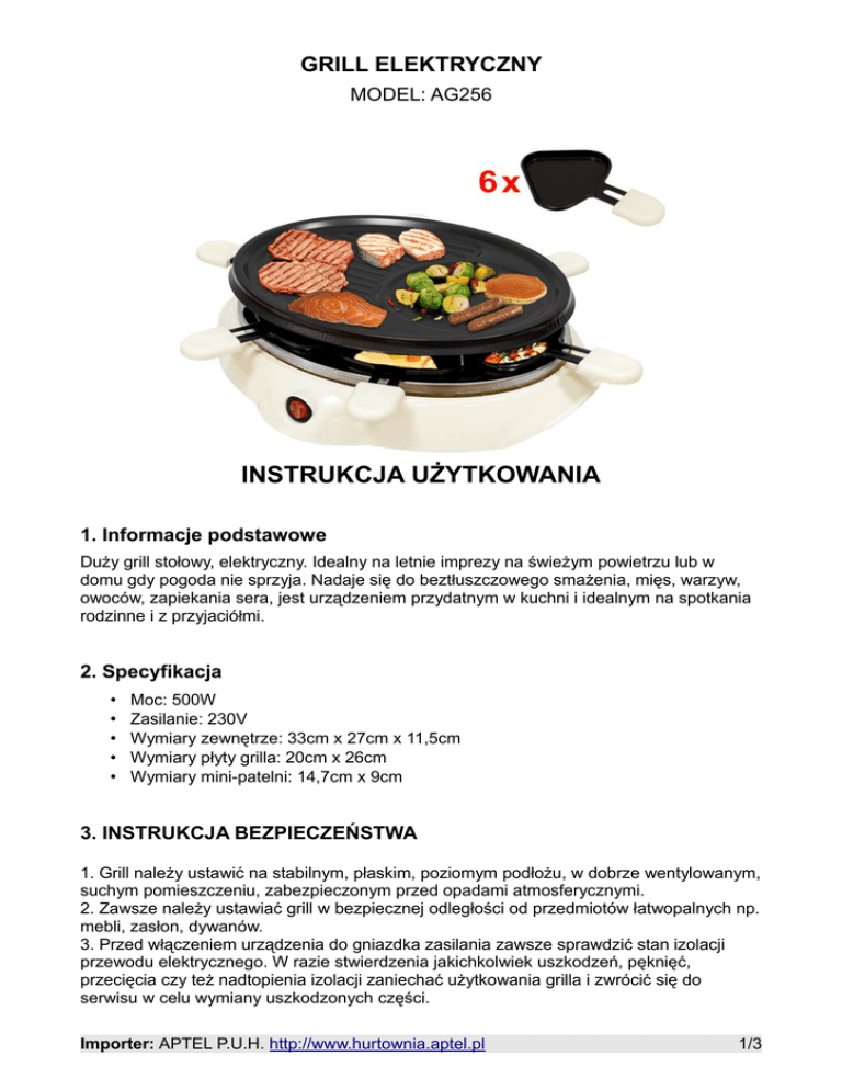 GRILL ELEKTRYCZNY MODEL: AG256 INSTRUKCJA UŻYTKOWANIA 1. Informacje podstawowe Duży grill stołowy, elektryczny. Idealny na letnie imprezy na świeżym powietrzu lub w domu gdy pogoda nie sprzyja. Nadaje się do beztłuszczowego smażenia, mięs, warzyw, owoców, zapiekania sera, jest urządzeniem przydatnym w kuchni i idealnym na spotkania rodzinne i z przyjaciółmi. 2. Specyfikacja • • • • • Moc: 500W Zasilanie: 230V Wymiary zewnętrze: 33cm x 27cm x 11,5cm Wymiary płyty grilla: 20cm x 26cm Wymiary mini-patelni: 14,7cm x 9cm 3. INSTRUKCJA BEZPIECZEŃSTWA 1. Grill należy ustawić na stabilnym, płaskim, poziomym podłożu, w dobrze wentylowanym, suchym pomieszczeniu, zabezpieczonym przed opadami atmosferycznymi. 2. Zawsze należy ustawiać grill w bezpiecznej odległości od przedmiotów łatwopalnych np. mebli, zasłon, dywanów. 3. Przed włączeniem urządzenia do gniazdka zasilania zawsze sprawdzić stan izolacji przewodu elektrycznego. W razie stwierdzenia jakichkolwiek uszkodzeń, pęknięć, przecięcia czy też nadtopienia izolacji zaniechać użytkowania grilla i zwrócić się do serwisu w celu wymiany uszkodzonych części. Importer: APTEL P.U.H. http://www.hurtownia.aptel.pl 1/3 4. Nigdy nie dotykać metalowych części grilla, gdy urządzenie jest pod napięciem! 5. Przed rozpoczęciem użytkowania sprawdzić czy napięcie zasilania jest zgodne z napięciem podanym na tabliczce znamionowej. Gniazdko zasilania musi być wyposażone w bolec uziemiający. 6. Nie używać urządzenia, gdy jest wilgotne lub gdy jest narażone na bezpośrednie działanie wilgoci bądź opadów atmosferycznych. Nie schładzać gorącego grilla wodą. 7. UWAGA! Grill może być gorący, nie przesuwać podczas pracy! 8. Nigdy nie pozostawiać włączonego grilla bez dozoru. Dzieci i zwierzęta muszą przebywać w bezpiecznej odległości od grilla. 9. Po zakończeniu grillowania ustawić przełącznik w pozycji „OFF” i odłączyć wtyczkę urządzenia od sieci. 10. Nie dokonywać samowolnych napraw oprócz czynności obsługowych opisanych w niniejszej instrukcji, bądź modyfikacji urządzenia. W razie potrzeby zwrócić się do serwisu. 11. Przed zakończeniem pracy zawsze należy upewnić się, że grill jest całkowicie zimny. Nie pozostawiać urządzenia na noc na zewnątrz pomieszczeń. 12. Należy zwrócić szczególną ostrożność na gorące lub ostre części grilla. Zaleca się używanie rękawic ochronnych podczas przygotowywania potraw. 13. W przypadku poparzenia: odłączyć urządzenie od sieci, natychmiast schłodzić oparzone miejsce zimną wodą i skontaktować się z lekarzem. 14. Podczas użytkowania grilla elektrycznego nie stosować nigdy do podnoszenia temperatury środków łatwopalnych (węgla drzewnego, rozpałek, rozpuszczalników itp.)! 4. Przeznaczenie Grill elektryczny przeznaczony wyłącznie do przygotowywania potraw. Inne zastosowania urządzenia nie są dopuszczalne! Użytkować wewnątrz pomieszczeń, w miejscach dobrze wentylowanych i na utwardzonym, niepalnym podłożu, gdzie dostępne jest zasilanie elektryczne 230V zgodne z klasą ochronności I- wyposażone w instalację z przewodem uziemiającym. Urządzenie posiada grzałkę elektryczną wraz z wyłącznikiem zabezpieczającym. Pod grzałką umieszczona jest metalowa tacka do ustawiania minipatelni. 5. Pierwsze podłączenie Przed pierwszym użyciem należy postawić grill na płaskiej powierzchni w dobrze wentylowanym pomieszczeniu. Włożyć wtyk kabla zasilającego w gniazdko elektryczne i włączyć grilla przełącznikiem na jego obudowie (zapalenie się lampki sygnalizuje pracę grzałki). Podczas pierwszego rozgrzewania może wydobywać się dym oraz nieprzyjemny zapach z okolic grzałki grilla. Jest to zjawisko normalne, które niedługo minie. Pozostawić grill do wygrzania na 10-15 minut. Następne rozgrzewania grilla do temperatury roboczej będą trwały około 3 minut. 6. Czyszczenie urządzenia 1. Zawsze odłączaj zasilanie od urządzenia przed czyszczenia grilla. Upewnij się czy grill jest zimny. Nigdy nie czyść urządzenia, które jest gorące! 2. Rozłóż poszczególne elementy grilla. 3. Oczyść grzałkę za pomocą wilgotnej miękkiej tkaniny. Nie używaj wody do czyszczenia grilla! Uważaj aby wilgoć nie pozostała na żadnych z części grilla mających kontakt z napięciem elektrycznym: grzałce, elementach termostatu, przewodzie zasilającym, itp. 4. Następnie oczyść misę, ruszt, tackę do zbierania tłuszczu itp. za pomocą wody z niewielką ilością środka do mycia naczyń. 5. Do czyszczenia nie używaj drucianych szczotek, myjek aluminiowych lub proszku Importer: APTEL P.U.H. http://www.hurtownia.aptel.pl 2/3 czyszczącego. Upewnij się że elementy elektryczne i ich osłony nie są wilgotne. 7. Przechowywanie Po skończonej pracy należy upewnić się, czy grill jest zimny. Grill przechowywać w czystym i niezawilgoconym pomieszczeniu. Nie obciążać nadmiernie grilla, aby nie spowodować uszkodzenia nóżek lub tacy! Importer: APTEL P.U.H. http://www.hurtownia.aptel.pl 3/3
