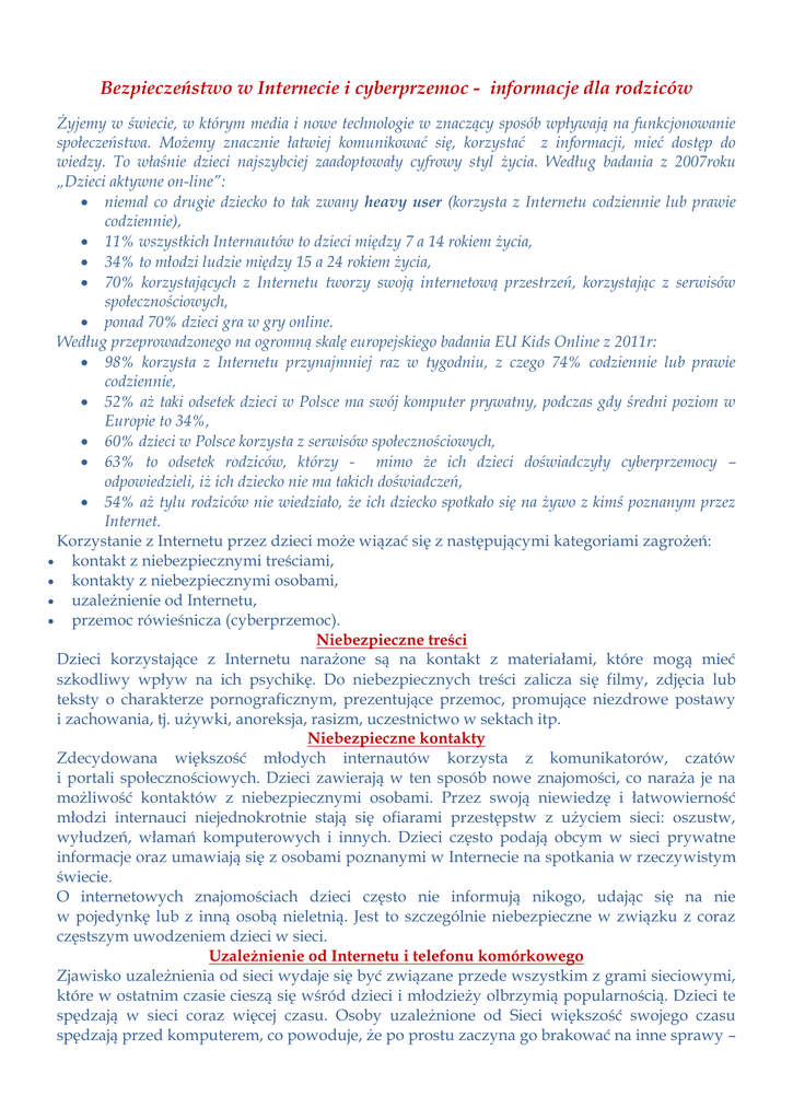 Bezpieczeństwo w Internecie i cyberprzemoc - informacje dla rodziców Żyjemy w świecie, w którym media i nowe technologie w znaczący sposób wpływają na funkcjonowanie społeczeństwa. Możemy znacznie łatwiej komunikować się, korzystać z informacji, mieć dostęp do wiedzy. To właśnie dzieci najszybciej zaadoptowały cyfrowy styl życia. Według badania z 2007roku „Dzieci aktywne on-line”: niemal co drugie dziecko to tak zwany heavy user (korzysta z Internetu codziennie lub prawie codziennie), 11% wszystkich Internautów to dzieci między 7 a 14 rokiem życia, 34% to młodzi ludzie między 15 a 24 rokiem życia, 70% korzystających z Internetu tworzy swoją internetową przestrzeń, korzystając z serwisów społecznościowych, ponad 70% dzieci gra w gry online. Według przeprowadzonego na ogromną skalę europejskiego badania EU Kids Online z 2011r: 98% korzysta z Internetu przynajmniej raz w tygodniu, z czego 74% codziennie lub prawie codziennie, 52% aż taki odsetek dzieci w Polsce ma swój komputer prywatny, podczas gdy średni poziom w Europie to 34%, 60% dzieci w Polsce korzysta z serwisów społecznościowych, 63% to odsetek rodziców, którzy - mimo że ich dzieci doświadczyły cyberprzemocy – odpowiedzieli, iż ich dziecko nie ma takich doświadczeń, 54% aż tylu rodziców nie wiedziało, że ich dziecko spotkało się na żywo z kimś poznanym przez Internet. Korzystanie z Internetu przez dzieci może wiązać się z następującymi kategoriami zagrożeń: kontakt z niebezpiecznymi treściami, kontakty z niebezpiecznymi osobami, uzależnienie od Internetu, przemoc rówieśnicza (cyberprzemoc). Niebezpieczne treści Dzieci korzystające z Internetu narażone są na kontakt z materiałami, które mogą mieć szkodliwy wpływ na ich psychikę. Do niebezpiecznych treści zalicza się filmy, zdjęcia lub teksty o charakterze pornograficznym, prezentujące przemoc, promujące niezdrowe postawy i zachowania, tj. używki, anoreksja, rasizm, uczestnictwo w sektach itp. Niebezpieczne kontakty Zdecydowana większość młodych internautów korzysta z komunikatorów, czatów i portali społecznościowych. Dzieci zawierają w ten sposób nowe znajomości, co naraża je na możliwość kontaktów z niebezpiecznymi osobami. Przez swoją niewiedzę i łatwowierność młodzi internauci niejednokrotnie stają się ofiarami przestępstw z użyciem sieci: oszustw, wyłudzeń, włamań komputerowych i innych. Dzieci często podają obcym w sieci prywatne informacje oraz umawiają się z osobami poznanymi w Internecie na spotkania w rzeczywistym świecie. O internetowych znajomościach dzieci często nie informują nikogo, udając się na nie w pojedynkę lub z inną osobą nieletnią. Jest to szczególnie niebezpieczne w związku z coraz częstszym uwodzeniem dzieci w sieci. Uzależnienie od Internetu i telefonu komórkowego Zjawisko uzależnienia od sieci wydaje się być związane przede wszystkim z grami sieciowymi, które w ostatnim czasie cieszą się wśród dzieci i młodzieży olbrzymią popularnością. Dzieci te spędzają w sieci coraz więcej czasu. Osoby uzależnione od Sieci większość swojego czasu spędzają przed komputerem, co powoduje, że po prostu zaczyna go brakować na inne sprawy – naukę, obowiązki, odpoczynek, życie rodzinne czy kontakty towarzyskie. Pojawia się tu również obsesyjne myślenie, a nawet sny o tym, co może zdarzyć się w Internecie, a także napady niekontrolowanej złości i agresji lub depresja przy próbach ograniczania korzystania z Internetu lub telefonu komórkowego. Cyberprzemoc Cyberprzemoc to przemoc z użyciem technologii informacyjnych i komunikacyjnych. Technologie te to głównie Internet oraz telefony komórkowe. Specyfika Internetu i telefonów komórkowych powoduje, że nawet pozornie błahe akty cyberprzemocy stanowią dla ich ofiar poważny problem, z którym często nie potrafią sobie poradzić. Problem cyberprzemocy w oczywisty sposób dotyczy szkół. W klasie, szatni, czy na boisku szkolnym dochodzi do aktów przemocy z użyciem telefonów komórkowych lub Internetu. Coraz częściej też „tradycyjne” konflikty rówieśnicze ze szkoły przenoszą się do sieci. Bardzo ważną rolę w przeciwdziałaniu cyberprzemocy pełni najbliższe otoczenie dziecka. Każde dziecko, które doświadczało cyberprzemocy – ofiara, sprawca i świadek potrzebują reakcji ze strony dorosłych. Muszą usłyszeć, że cyberprzemoc jest krzywdzeniem kogoś. Nie jest żartem działanie, które powoduje czyjeś cierpienie. Dorośli powinni także informować o konsekwencjach, które grożą sprawcom przemocy, oraz sugerować reakcje ze strony dzieci – świadków sytuacji. W przypadku cyberprzemocy dostępne są dwie drogi ochrony prawnej: karna i cywilna. Jest to istotne rozróżnienie ze względu na fakt, iż mnogość możliwości działań przemocy przy użyciu nowych technologii powoduje, że przestępstwa zawarte w Kodeksie karnym nie obejmują ich swoim zakresem. W związku z tym, w niektórych przypadkach, niemożliwe jest skierowanie sprawy do postępowania karnego (zgłoszenia jako przestępstwa). W takich sytuacjach konieczne jest posłużenie się drogą cywilną, czyli drogą roszczeń odszkodowawczych. Formy cyberprzemocy wykorzystanie czyjegoś wizerunku umieszczenie w Internecie bez czyjejś wiedzy lub wbrew woli zdjęcia lub filmu przedstawiającego kogoś; rozesłanie zdjęcia przedstawiającego kogoś lub filmiku z czyimś udziałem mailem, telefonem komórkowym; zniesławienie, znieważenie - wszelkie zachowania uwłaczające czyjejś godności, stanowiące przejaw lekceważenia oraz pogardy; pomówienie (oszczerstwo) o takie postępowanie lub właściwości, które mogą daną osobę poniżyć w opinii publicznej; wypowiadanie pod czyimś adresem znieważających wulgaryzmów lub epitetów; włamania - włamania na konto mailowe, profil w serwisie społecznościowym i każde miejsce strzeżone hasłem