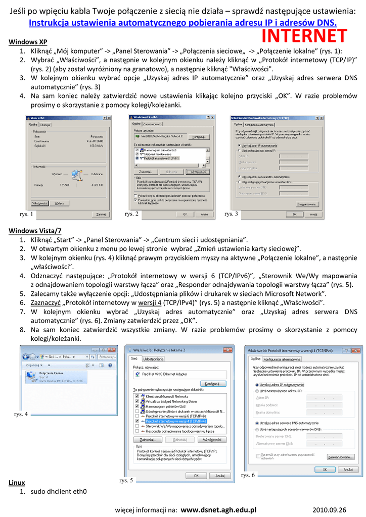Jeśli po wpięciu kabla Twoje połączenie z siecią nie działa – sprawdź następujące ustawienia: Instrukcja ustawienia automatycznego pobierania adresu IP i adresów DNS. INTERNET Windows XP 1. Kliknąć „Mój komputer” -> „Panel Sterowania” -> „Połączenia sieciowe„ -> „Połączenie lokalne” (rys. 1): 2. Wybrać „Właściwości”, a następnie w kolejnym okienku należy kliknąć w „Protokół internetowy (TCP/IP)” (rys. 2) (aby został wyróżniony na granatowo), a następnie kliknąć "Właściwości". 3. W kolejnym okienku wybrać opcje „Uzyskaj adres IP automatycznie” oraz „Uzyskaj adres serwera DNS automatycznie” (rys. 3) 4. Na sam koniec należy zatwierdzić nowe ustawienia klikając kolejno przyciski „OK”. W razie problemów prosimy o skorzystanie z pomocy kolegi/koleżanki. rys. 1 rys. 2 rys. 3 Windows Vista/7 1. Kliknąć „Start” -> „Panel Sterowania” -> „Centrum sieci i udostępniania”. 2. W otwartym okienku z menu po lewej stronie wybrać „Zmień ustawienia karty sieciowej”. 3. W kolejnym okienku (rys. 4) kliknąć prawym przyciskiem myszy na aktywne „Połączenie lokalne”, a następnie „właściwości”. 4. Odznaczyć następujące: „Protokół internetowy w wersji 6 (TCP/IPv6)”, „Sterownik We/Wy mapowania z odnajdowaniem topologii warstwy łącza” oraz „Responder odnajdywania topologii warstwy łącza” (rys. 5). 5. Zalecamy także wyłączenie opcji: „Udostępniania plików i drukarek w sieciach Microsoft Network”. 6. Zaznaczyć „Protokół internetowy w wersji 4 (TCP/IPv4)” (rys. 5) a następnie kliknąć „Właściwości”. 7. W kolejnym okienku wybrać „Uzyskaj adres automatycznie” oraz „Uzyskaj adres serwera DNS automatycznie” (rys. 6). Zmiany zatwierdzić przez „OK”. 8. Na sam koniec zatwierdzić wszystkie zmiany. W razie problemów prosimy o skorzystanie z pomocy kolegi/koleżanki. rys. 4 Linux 1. sudo dhclient eth0 rys. 5 rys. 6 więcej informacji na: www.dsnet.agh.edu.pl 2010.09.26