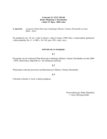 Uchwała Nr XXV/181/04 Rady Miejskiej w Drezdenku z dnia 15 lipca 2004 roku w sprawie: przyjęcia Planu Rozwoju Lokalnego Miasta i Gminy Drezdenko na lata 2004 - 2010 Na podstawie art. 18 ust. 2 pkt 6 ustawy z dnia 8 marca 1990 roku o samorządzie gminnym ( tekst jednolity Dz. U. z 2001 r. Nr 142, poz.1591 z póź. zm.), uchwala się co następuje: §1 Przyjmuje się do realizacji Plan Rozwoju Lokalnego Miasta i Gminy Drezdenko na lata 2004 –2010, stanowiący załącznik nr 1 do niniejszej uchwały. §2 Wykonanie uchwały powierza się Burmistrzowi Miasta i Gminy Drezdenko. §3 Uchwała wchodzi w życie z dniem podjęcia. Przewodniczący Rady Miejskiej /-/ Jerzy Skrzypczyński Załącznik nr 1 do uchwały Nr XXV/181/04 z dnia 15 lipca 2004 roku PLAN ROZWOJU LOKALNEGO MIASTA I GMINY DREZDENKO NA LATA 2004 - 2010 2 DREZDENKO, LIPIEC 2004 SPIS TREŚCI I. II. MAPA GMINY DREZDENKO ...............3 Prognozowana alokacja funduszy strukturalnych w województwie lubuskim.....4 Teren realizacji „PRL” ...............4 1. Delimitacja obszaru realizacji planu 2. Charakterystyka obecnej sytuacji społeczno – ekonomicznej SFERA SPOŁECZNA 2.1. Demografia 2.2. Rynek pracy i bezrobocie 2.3. Kultura i sport 2.4. Oświata i wychowanie 2.5. Ochrona zdrowia 2.6. Mieszkalnictwo 2.7. Pomoc społeczna 2.8. Bezpieczeństwo publiczne SFERA GOSPODARCZA 2.9. Podmioty gospodarcze 2.10. Rolnictwo ...............32 2.11. Inwestycje 2.12. Finanse gminy 2.13. Infrastruktura lokalna 2.14. Wodociągi i kanalizacja 2.15. Łączność 2.16. Sieć gazowa 2.17. Komunikacja SFERA EKOLOGICZNA 2.18. Emisja zanieczyszczeń wód 2.19. Emisja zanieczyszczeń atmosfery 2.20. Odpady III. IV. V. VI. VII. VIII. ...............4 ...............5 ...............5 ...............6 ...............9 ...............17 ...............21 ...............23 ...............25 ...............26 ...............30 ...............34 ...............34 ...............36 ...............36 ...............37 ...............37 ...............37 ...............38 ...............39 ...............39 Powiązanie projektu z celami strategicznymi dokumentów rozwoju przestrzenno – społecznego – gospodarczego MiG Drezdenko ...............40 Powiązanie projektu z innymi działaniami realizowanymi na terenie gminy Drezdenko ...............41 Planowane inwestycje w świetle ZPORR ...............42 Wybrane wskaźniki monitorowania „PRL” MiG Drezdenko ...............45 System wdrażania ...............48 Sposoby monitorowania, oceny i komunikacji społecznej ...............49 3 4 5 I. PROGNOZOWANA STRUKTURANYCH LUBUSKIM ALOKACJA FUNDUSZY W WOJEWÓDZTWIE Prognozowaną alokację funduszy w ramach Zintegrowanego Programu Operacyjnego Rozwoju Regionalnego w podziale na priorytety i działania (euro w cenach z 2004r) dla województwa lubuskiego przedstawia tabela stanowiąca załącznik nr 1 do niniejszego Planu Rozwoju Lokalnego. II. TEREN REALIZACJI LOKALNEGO PLANU ROZWOJU 1. DELIMITACJA OBSZARU REALIZACJI PLANU Gmina Drezdenko liczy 17733 mieszkańców, w tym w samym Drezdenku zamieszkuje 10790 osób. Powierzchnia gminy wynosi 400km2 z tego powierzchnia miasta Drezdenko – 10 km2 i 390 km2 terenów wiejskich. Jest to jedna z największych gmin pod względem powierzchni w województwie lubuskim a była pierwszą w województwie gorzowskim. Na terenie gminy położone są 33 miejscowości w tym 27 o statusie sołectw. Lasy zajmują 265,2 km2 powierzchni – 66,3% użytki rolne w tym łąki – 100,4 km2 – 25,1% wody i nieużytki – 34,4 km2 – 8,6% Położona jest na skraju Puszczy Drawskiej i Noteckiej. Od 1 stycznia 1999 roku w wyniku reformy administracyjnej - stanowi część powiatu strzelecko-drezdeneckiego, znajdującego się w województwie lubuskim. Od strony wschodniej sąsiaduje z gminą Krzyż, która obecnie należy do województwa wielkopolskiego. Ponadto graniczy z gminami: Drawsko, Sieraków, Międzychód, Skwierzyna, Santok, Zwierzyń, Stare Kurowo, Dobiegniew. Teren gminy w większości rozciąga się w poprzek Pradoliny Noteci, zajmując środkową część Kotliny Gorzowskiej, pozostały obszar wkracza na wschodnią część Pojezierza 6 Myśliborskiego. Lasy Puszczy Drawskiej i Noteckiej stanowią aż 66,3% jej powierzchni, a liczne czyste jeziora i inne akweny wodne zajmują powierzchnię 780 ha. Miasto i gmina Drezdenko położone są na pograniczu dwóch wielkich, odmiennych pod wieloma względami krain: Wielkopolski i Pomorza. Drezdenko leży w Pradolinie Toruńsko-Eberswaldzkiej. W kierunku wschodnim i zachodnim przez cały obszar gminy rozciągają się łąki i pola urozmaicone zakolami Noteci, niewielkimi wzniesieniami, pozostałościami dawnych wydm. Od północy rozciąga się silnie sfałdowany, morenowy obszar Puszczy Drawskiej. Południowa część gminy Drezdenko międzyrzecze Warciańsko-Noteckie - to bory Puszczy Noteckiej. Gmina usytuowana jest w odległości 100 km od granicy z Niemcami, 100 km od Poznania, 140 km od Zielonej Góry – ważnych ośrodków administracyjnych, przemysłowych i akademickich. Posiada również dogodne połączenia komunikacyjne zarówno drogowe, kolejowe, jak i wodne (Noteć) z innymi większymi miastami, co stwarza możliwość rozwoju gospodarczego i przestrzennego. Miasto i Gmina Drezdenko utrzymuje stosunki partnerskie z niemieckimi miastami Wörth am Rhein i Winsen (Luhe). Umowa partnerska z miastem Worth podpisana w 1993r owocuje wymianą mieszkańców, współpracą straży pożarnych, wymianą kulturalną. Partnerstwo z Winsen zapoczątkowane zostało już pod koniec lat osiemdziesiątych. Początkowo polegało ono na pomocy charytatywnej dla tut. szpitala oraz wymianie młodzieży szkoły podstawowej. W chwili obecnej gmina ma podpisany oficjalny dokument partnerstwa, a współpraca między miastami obejmuje również współpracę kulturalną oraz współpracę straży pożarnych. 2. CHARAKTERYSTYKA OBECNEJ SYTUACJI SPOŁECZNO EKONOMICZNEJ SFERA SPOŁECZNA 2.1. DEMOGRAFIA