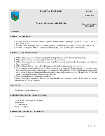 K A R TA U S Ł U G I Urząd Miejski USC-02 Wersja Nr 2 Zgłoszenie urodzenia dziecka Data zatwierdzenia: 08.03.2013 w Złotowie 1. PODSTAWA PRAWNA 1. Ustawa z dnia 29 września 1986 r. - prawo o aktach stanu cywilnego (t.j. Dz.U. z 2011 r., Nr 212, poz. 1264 ze zm.). 2. Ustawa z dnia 25 lutego 1964 r. - kodeks rodzinny i opiekuńczy (t.j. Dz.U. z 2012 r., poz. 788 ze zm.). 3. Ustawa 16 listopada 2006 r. - o opłacie skarbowej (t.j. Dz.U. z 2014 r. poz. 1628 ze zm.). 2. WYMAGANE DOKUMENTY 1. Odpis skróconego aktu małżeństwa i jego kserokopia (jeżeli matka dziecka jest mężatką). 2. Odpis skrócony aktu urodzenia (gdy matka dziecka jest panną). 3. Odpis aktu małżeństwa z adnotacją o rozwodzie lub separacji (jeżeli matka dziecka jest rozwiedziona lub w separacji). 4. Odpis aktu małżeństwa oraz odpis aktu zgonu męża (gdy matka dziecka jest wdową). 5. W przypadku uznania dziecka przez ojca, konieczna jest obecność obojga rodziców!! Uznanie może być przyjęte w przypadku matki: panny, rozwiedzionej, gdy upłynęło 300 dni od daty uprawomocnienia się wyroku do dnia urodzenia dziecka, natomiast w przypadku matki wdowy, gdy upłynęło 300 dni od śmierci współmałżonka do dnia urodzenia dziecka. 6. Do wglądu dokumenty tożsamości rodziców. Osoba zgłaszająca urodzenie dziecka nie przedstawia ww. odpisów aktów, jeżeli akty te zostały sporządzone w USC w Złotowie. 3. OPŁATY Zwolnione z opłaty skarbowej. 4. MIEJSCE ZŁOŻENIA DOKUMENTÓW Urząd Stanu Cywilnego w Złotowie Aleja Piasta 1 77 – 400 Złotów pokój 25, I piętro. 5. SPOSÓB I TERMIN ZAŁATWIENIA Niezwłocznie. Strona 1/2 K A R TA U S Ł U G I Urząd Miejski USC-02 Wersja Nr 2 Zgłoszenie urodzenia dziecka Data zatwierdzenia: 08.03.2013 w Złotowie 6. TRYB ODWOŁAWCZY Nie przysługuje. 7. OSOBY DO KONTAKTU tel. 67 263 25 46 lub 263 26 40 wew. 34 Barbara Narloch – Kierownik USC Małgorzata Maczan – Z-ca Kierownika USC Eugenia Wrzeszcz – Inspektor e-mail: [email protected] e-mail: [email protected] e-mail: [email protected] 8. INFORMACJE DODATKOWE 1. Urodzenie dziecka należy zgłosić w terminie 14 dni od daty urodzenia. 2. Urodzenie dziecka rejestruje się w Urzędzie Stanu Cywilnego w miejscu zdarzenia (urodzenia). 3. Zgłoszenie urodzenia dziecka może być dokonane również za pośrednictwem USC stałego miejsca zameldowania jednego z rodziców. 4. Podstawę sporządzenia aktu urodzenia stanowi pisemne zgłoszenie urodzenie dziecka, wystawione przez lekarza, położną lub zakład opieki zdrowotnej, potwierdzające fakt urodzenia dziecka oraz datę i miejsce urodzenia. 9. WZORY WNIOSKÓW Brak. Imię i nazwisko Data Opracował Małgorzata Maczan 08.03.2013 Zatwierdził Barbara Narloch 08.03.2013 Osoba odpowiedzialna za aktualizację karty Małgorzata Maczan Strona 2/2