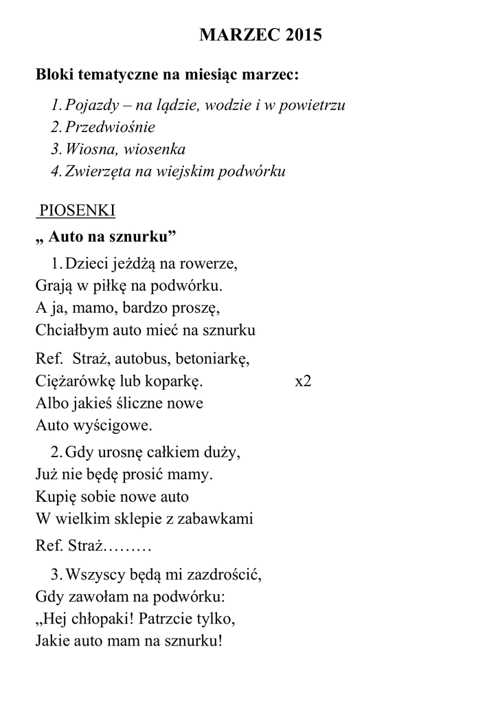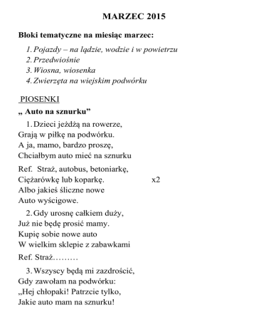 MARZEC 2015 Bloki tematyczne na miesiąc marzec: 1. Pojazdy – na lądzie, wodzie i w powietrzu 2. Przedwiośnie 3. Wiosna, wiosenka 4. Zwierzęta na wiejskim podwórku PIOSENKI „ Auto na sznurku” 1. Dzieci jeżdżą na rowerze, Grają w piłkę na podwórku. A ja, mamo, bardzo proszę, Chciałbym auto mieć na sznurku Ref. Straż, autobus, betoniarkę, Ciężarówkę lub koparkę. Albo jakieś śliczne nowe Auto wyścigowe. 2. Gdy urosnę całkiem duży, Już nie będę prosić mamy. Kupię sobie nowe auto W wielkim sklepie z zabawkami Ref. Straż……… 3. Wszyscy będą mi zazdrościć, Gdy zawołam na podwórku: „Hej chłopaki! Patrzcie tylko, Jakie auto mam na sznurku! x2 „Marzec - czarodziej” 1. Chodzi marzec - czarodziej, po chmurach, po lodzie. Aż tu nagle hokus - pokus: i już pączki na patyku i już trawka na śnieżniku. Och , ten marzec - czarodziej! 2. Chodzi marzec- czarodziej, Po chmurach, po lodzie. Aż tu nagle hokus - pokus: słońce rzuca swe błyskotki, że aż mruczą bazie -kotki Och, ten marzec -czarodziej! 3. Chodzi marzec- czarodziej, po chmurach, po lodzie. Aż tu nagle hokus - pokus : przez kałuże skaczą kaczki, żółte kaczki -przedszkolaczki . Och, ten marzec -czarodziej ! „Wkrótce wiosna” 1. Pierwszy obudził się pierwiosnek Potem chochoły spadły z róż. Skowronek śpiewem wołał wiosnę, żeby na pole przyszła już! Ref. Bo zima, bo zima każdemu obrzydła! Niech słońce jej da pstryczka w nos! Niech wiosnę, niech wiosnę przyniosą na skrzydłach bociek, jaskółka, szpak i kos. 2. Złoto błysnęło na leszczynach Zapach obudził senny ul. Wiosenną orkę chcą zaczynać głodne gawrony z pustych pól. Ref: Bo zima, bo zima... „Zwierzęta wiejskie” 1. Królik chrupie marchew, myszka zjada serek. Kotek pije mleko, kości je Azorek. Teraz spytam: Czy ktoś wie, co baranek je? Ref: Baś, baś baranku, chodź na śniadanko, mam tu dla ciebie trawę i sianko. Baś, baś baranku, pachnące sianko. Nie mów: mee, nie mów: bee tylko jedz! 2. Misie lubią miodek, Ziarna kurka dziobie. Dzieci kaszkę z mlekiem zajadają sobie. Teraz spytam: Czy ktoś wie, co baranek je? Baś, baś baranku, chodź na śniadanko, mam tu dla ciebie trawę i sianko. Baś, baś baranku, pachnące sianko. Nie mów: mee, nie mów: bee tylko jedz!