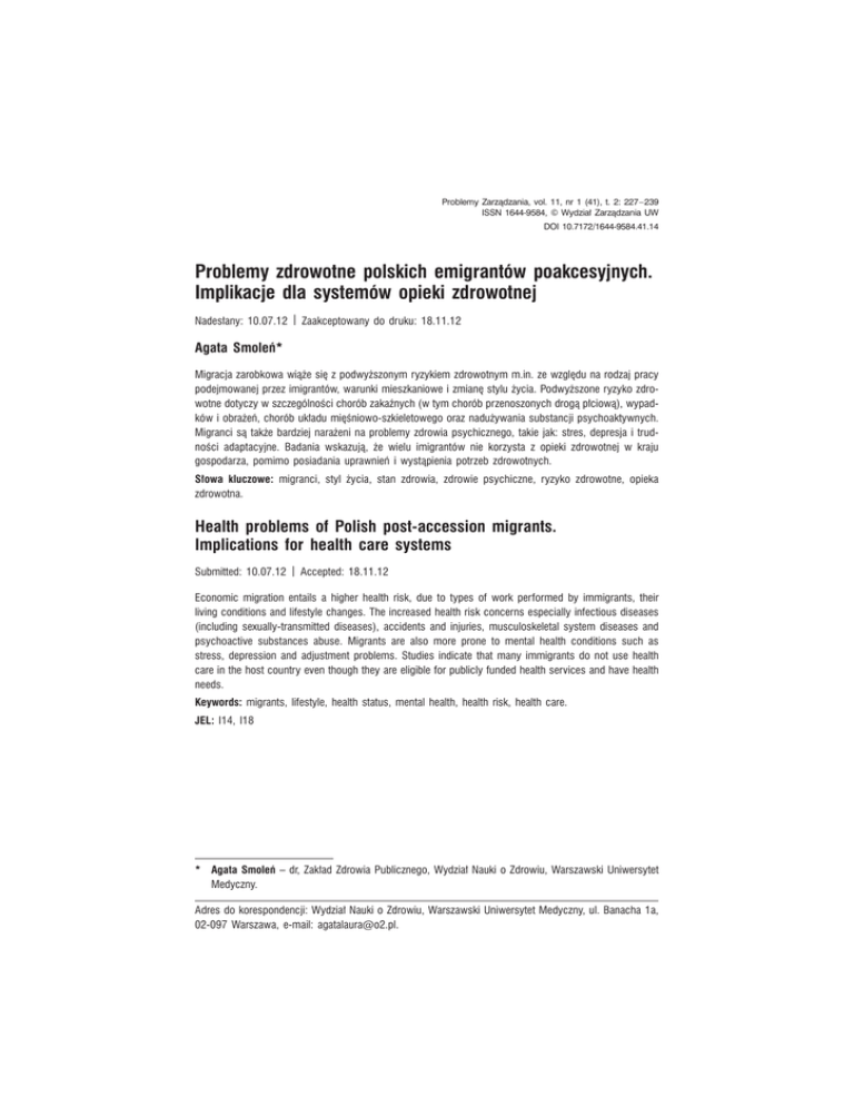 Problemy ZarzÈdzania, vol. 11, nr 1 (41), t. 2: 227 – 239 ISSN 1644-9584, © Wydziaï ZarzÈdzania UW DOI 10.7172/1644-9584.41.14 Problemy zdrowotne polskich emigrantów poakcesyjnych. Implikacje dla systemów opieki zdrowotnej Nadesïany: 10.07.12 | Zaakceptowany do druku: 18.11.12 Agata Smoleñ* Migracja zarobkowa wiÈĝe siÚ z podwyĝszonym ryzykiem zdrowotnym m.in. ze wzglÚdu na rodzaj pracy podejmowanej przez imigrantów, warunki mieszkaniowe i zmianÚ stylu ĝycia. Podwyĝszone ryzyko zdrowotne dotyczy wbszczególnoĂci chorób zakaěnych (w tym chorób przenoszonych drogÈ pïciowÈ), wypadków i obraĝeñ, chorób ukïadu miÚĂniowo-szkieletowego oraz naduĝywania substancji psychoaktywnych. Migranci sÈ takĝe bardziej naraĝeni na problemy zdrowia psychicznego, takie jak: stres, depresja ibtrudnoĂci adaptacyjne. Badania wskazujÈ, ĝe wielu imigrantów nie korzysta z opieki zdrowotnej w kraju gospodarza, pomimo posiadania uprawnieñ i wystÈpienia potrzeb zdrowotnych. Sïowa kluczowe: migranci, styl ĝycia, stan zdrowia, zdrowie psychiczne, ryzyko zdrowotne, opieka zdrowotna. Health problems of Polish post-accession migrants. Implications for health care systems Submitted: 10.07.12 | Accepted: 18.11.12 Economic migration entails a higher health risk, due to types of work performed by immigrants, their living conditions and lifestyle changes. The increased health risk concerns especially infectious diseases (including sexually-transmitted diseases), accidents and injuries, musculoskeletal system diseases and psychoactive substances abuse. Migrants are also more prone to mental health conditions such as stress, depression and adjustment problems. Studies indicate that many immigrants do not use health care in the host country even though they are eligible for publicly funded health services and have health needs. Keywords: migrants, lifestyle, health status, mental health, health risk, health care. JEL: I14, I18 * Agata Smoleñ – dr, Zakïad Zdrowia Publicznego, Wydziaï Nauki o Zdrowiu, Warszawski Uniwersytet Medyczny. Adres do korespondencji: Wydziaï Nauki o Zdrowiu, Warszawski Uniwersytet Medyczny, ul. Banacha 1a, 02-097 Warszawa, e-mail: [email protected]. Agata Smoleñ Skala emigracji poakcesyjnej do Wielkiej Brytanii Skala polskiej emigracji poakcesyjnej, która wedïug róĝnych szacunków wyniosïa okoïo 1,5–2 mln osób w ciÈgu pierwszych lat czïonkostwa Polski wbUnii Europejskiej, jest zjawiskiem bezprecedensowym w historii najnowszej. Emigracja po 1 maja 2004 roku ma przede wszystkim charakter ekonomiczny, a z kraju wyjeĝdĝali i nadal wyjeĝdĝajÈ przewaĝnie ludzie mïodzi, do 35. roku ĝycia. Jednym z gïównych kierunków odpïywu mïodych Polaków jest Wielka Brytania, która obok Irlandii i Szwecji w peïni otworzyïa swój rynek pracy dla obywateli 10 pañstw akcesyjnych od momentu rozszerzenia UE. OkreĂlenie dokïadnej skali emigracji poakcesyjnej stanowi powaĝny problem. Migracje sÈ przedmiotem analiz wielu polskich i zagranicznych instytucji i organizacji, stosujÈcych róĝnorodne metody i narzÚdzia badawcze. W efekcie powstaje pewien „chaos informacyjny”, poniewaĝ dane uzyskiwane z poszczególnych ěródeï sÈ niejednokrotnie rozbieĝne lub wzajemnie wykluczajÈce siÚ. Wedïug najnowszych danych opublikowanych w raporcie Office for National Statistics (odpowiednika polskiego GUS) (ONS, 2012, tab. 1.3, 1.4), w okresie od stycznia do grudnia 2011 roku na Wyspach przebywaïo na staïe 643 tysiÈce osób urodzonych w Polsce i posiadajÈcych status brytyjskich rezydentów. Obywatele polscy stanowili drugÈ pod wzglÚdem liczebnoĂci grupÚ imigrantów w Wielkiej Brytanii (po Hindusach, których liczbÚ oszacowano na poziomie 729 tys.). Naleĝy zwróciÊ jednak uwagÚ, ĝe powyĝsze dane dotyczÈ wyïÈcznie Polaków posiadajÈcych status rezydenta, a wiÚc takich, którzy przebywajÈ i pracujÈ na Wyspach co najmniej odbroku (oraz mieszkajÈcych z nimi czïonków rodzin). Dane opublikowane przez ONS nie obejmujÈ migrantów krótkookresowych, osób bÚdÈcych w trakcie ubiegania siÚ o rezydenturÚ anib osób przebywajÈcych w Wielkiej Brytanii nielegalnie. Moĝe to oznaczaÊ, ĝe faktyczna liczba Polaków mieszkajÈcych na Wyspach jest znacznie wiÚksza. Problemy zdrowotne emigrantów zarobkowych Stanisïawa Golinowska zwraca uwagÚ, ĝe migranci zarobkowi zaliczajÈ siÚ do grup o podwyĝszonym ryzyku zdrowotnym, co wynika m.in. z rodzaju podejmowanej pracy. Emigranci sÈ czÚsto zatrudniani w zawodach wymagajÈcych intensywnej aktywnoĂci fizycznej i odpornoĂci psychicznej (np.b jako opiekunowie osób starszych). Wielu podejmuje pracÚ w godzinach nocnych (m.in. w fabrykach i agencjach ochrony) oraz w warunkach szkodliwych bÈdě uciÈĝliwych dla zdrowia (np. na farmach, w ubojniach, na budowach, w zakïadach chemicznych). Autorzy raportu pt. „Health in the European Union. Trends and analysis”, opracowanego na zlecenie ¥wiatowej Organizacji Zdrowia, wskazujÈ, ĝe zïe warunki zatrudnienia i niski standard ĝycia stanowiÈ znacznie wiÚksze zagroĝenie dla zdrowia migrantów niĝbmieszkañców kraju przyjmujÈcego. Podwyĝszone ryzyko zdrowotne dotyczy wbszcze228 DOI 10.7172/1644-9584.41.14 Problemy zdrowotne polskich emigrantów poakcesyjnych... gólnoĂci chorób zakaěnych (w tym chorób przenoszonych drogÈ pïciowÈ), wypadków, obraĝeñ, chorób ukïadu miÚĂniowo-szkieletowego oraz naduĝywania substancji psychoaktywnych (Mladovsky, Allin, Masseria, Hernández-Quevedo, McDaid i Mossialos, 2009, s. 122). W wiÚkszoĂci publikacji poĂwiÚconych tematyce zdrowia migrantów gïówny nacisk kïadzie siÚ na problemy zdrowia psychicznego, takie jak: stres, depresja, trudnoĂci adaptacyjne oraz szok kulturowy. Znacznie mniejszÈ wagÚ przykïada siÚ do kwestii zdrowia somatycznego, co moĝe wynikaÊ zbfaktu, iĝ na emigracjÚ (szczególnie „zabchlebem”) decydujÈ siÚ przewaĝnie osoby mïode i w peïni siï, przekona