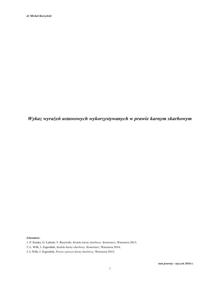 dr Michał Kurzyński Wykaz wyrażeń ustawowych wykorzystywanych w prawie karnym skarbowym Literatura: 1. P. Kardas, G. Łabuda, T. Razowski, Kodeks karny skarbowy. Komentarz, Warszawa 2012; 2. L. Wilk, J. Zagrodnik, Kodeks karny skarbowy. Komentarz, Warszawa 2014; 3. L Wilk, J. Zagrodnik, Prawo i proces karny skarbowy, Warszawa 2015; stan prawny - styczeń 2016 r. 1 I. Wyrażenia ustawowe wskazane w art. 53 Kodeku karnego skarbowego: § 1. Czyn zabroniony jest to zachowanie o znamionach określonych w kodeksie, chociażby nie stanowiło ono przestępstwa skarbowego lub wykroczenia skarbowego (okoliczności wyłączające winę, znikomy stopień społecznej szkodliwości). Określenie czynu zabronionego jako przestępstwa skarbowego lub wykroczenia skarbowego może nastąpić tylko w niniejszym kodeksie. Warunkiem realizacji znamion czynu zabronionego jest naruszenie normy sankcjonowanej - zakazującej zachowania stypizowanego w przepisie kodeksu. § 2. Przestępstwo skarbowe jest to czyn zabroniony przez kodeks pod groźbą kary grzywny w stawkach dziennych, kary ograniczenia wolności lub kary pozbawienia wolności (zob. art. 20-45 k.k.s.). § 3. Wykroczenie skarbowe jest to czyn zabroniony przez kodeks pod groźbą kary grzywny określonej kwotowo, jeżeli kwota uszczuplonej lub narażonej na uszczuplenie należności publicznoprawnej albo wartość przedmiotu czynu nie przekracza pięciokrotnej wysokości minimalnego wynagrodzenia w czasie jego popełnienia. Wykroczeniem skarbowym jest także inny czyn zabroniony, jeżeli kodeks tak stanowi (np. wypadek mniejszej wagi, zob. art. 46-52 k.k.s.). § 4. Minimalne wynagrodzenie jest to wynagrodzenie za pracę ustalone na podstawie ustawy z dnia 10 października 2002 r. o minimalnym wynagrodzeniu za pracę (Dz. U. Nr 200, poz. 1679, z 2004 r. Nr 240, poz. 2407 oraz z 2005 r. Nr 157, poz. 1314). Zgodnie z art. 2 ust. 4 ustawy, wysokość minimalnego wynagrodzenia, podlega ogłoszeniu w Dzienniku Urzędowym Rzeczypospolitej Polskiej "Monitor Polski", w drodze obwieszczenia Prezesa Rady Ministrów, w terminie do dnia 15 września każdego roku. Wysokość minimalnego wynagrodzenia służy jako miernik do ustalania kwot uszczerbku finansowego, w sytuacjach: a) kwalifikacji czynu jako przestępstwo skarbowe lub wykroczenie skarbowe, b) w których w grę wchodzą rozmaite instytucje, np. nadzwyczajne obostrzenie kary (zob. art. 37 § 1 pkt 1 i art. 38 § 2 k.k.s.), dobrowolne poddanie się odpowiedzialności (zob. art. 17 § 2 pkt 1 k.k.s.), c) na podstawie minimalnego wynagrodzenia określa się również wysokość zagrożenia karą grzywny (zob. art. 23 § 3 i art. 48 § 1 k.k.s.). Od 1 stycznia 2016 r. wysokość minimalnego wynagrodzenia wynosi 1850 zł. Od 1996 r. jest to kwota podawana brutto. § 5. Zagrożenie karne jest to zagrożenie karą przewidziane w odpowiednim przepisie tytułu I działu II - Część szczególna, określającym dany typ przestępstwa skarbowego lub wykroczenia skarbowego. Wskazuje się tam wysokość i rodzaj odpowiedzialności dotyczącej zindywidualizowanego typu przestępstwa skarbowego lub wykroczenia skarbowego. 2 § 6. Ustawowy próg, o którym mowa w tytule I w dziale II - Część szczególna, jest to wysokość kwoty określonej w § 3 zdanie pierwsze. Pojęcie służy, zgodnie z zasadą kontrawencjonalizacji (depenalizacji częściowej), rozgraniczeniu czynu jako przestępstwo skarbowe lub wykroczenie skarbowe. Ustawowym progiem jest wysokość kwoty nieprzekraczającej pięciokrotnej wysokości minimalnego wynagrodzenia. § 7. Przy ocenie stopnia społecznej szkodliwości czynu zabronionego bierze się pod uwagę rodzaj i charakter zagrożonego lub naruszonego dobra, wagę naruszonego przez sprawcę obowiązku finansowego, wysokość uszczuplonej lub narażonej na uszczuplenie należności publicznoprawnej, sposób i okoliczności popełnienia czynu zabronionego, jak również postać zamiaru, motywację sprawcy, rodzaj naruszonej reguły ostrożności i stopień jej naruszenia. Ocena stopnia społecznej szkodliwości czynu zabronionego wpływa na stosowanie różnych instytucji kodeksu karnego skarbowego (np. warunkowego umorzenia postępowania w sprawie o przestępstwo skarbowe, odstąpienia od wymierzenia kary, przepadku przedmiotów tytułem środka zabezpieczającego, umieszczenia sprawcy w zakładzie psychiatrycznym itd.), na wymiar kary, środka karnego i innego środka (art. 12 § 2 k.k.s.) czy wreszcie na prawnokarną relewancję czynu (art. 1 § 2 k.k.s.). Determinanty oceny stopnia społecznej szkodliwości czynu mają charakter katalogu zamkniętego, tj. wyłącznie podane czynniki mają decydować o ocenie stopnia społecznej szkodliwości. § 8. W rozumieniu kodeksu wypadek mniejszej wagi jest to czyn zabroniony jako wykroczenie skarbowe, które w konkretnej sprawie, ze względu na jej szczególne okoliczności - zarówno przedmiotowe, jak i podmiotowe zawiera niski stopień społecznej szkodliwości czynu, w szczególności gdy uszczuplona lub narażona na uszczuplenie należność publicznoprawna nie przekracza ustawowego progu z § 6, a sposób i okoliczności popełnienia czynu zabronionego nie wskazują na rażące lekceważenie przez sprawcę porządku finansowoprawnego lub reguł ostrożności wymaganych w danych okolicznościach, albo sprawca dopuszczający się czynu zabronionego, którego przedmiot nie przekracza kwoty małej wartości, czyni to z pobudek zasługujących na uwzględnienie. W świetle powyższego zapisu, przestępstwo skarbowe zawierające niski stopień społecznej szkodliwości (jeżeli kwota uszczuplenia lub narażenia na uszczuplenie nie przekracza 200-krotności minimalnego wynagrodzenia), ze względu na kompleks elementów łagodzących o charakterze przedmiotowo-podmiotowych, może zostać potraktowane jako wypadek mniejszej wagi a sprawca ukarany jak za wykroczenie skarbowe. § 9. W rozumieniu kodeksu zasada terytorialności, o której mowa w art. 3 § 