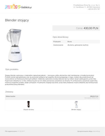 Przykładowa firma Sp. z o.o. Sp. k. Ul. Handlowa 11, 40-950 Katowice +48 00 878 787 Blender stojący Cena: 430,00 PLN Opis słownikowy Producent Bruno Zastosowanie dla domu, gotowanie, kuchnia Opis produktu Stojący blender wykonany z materiałów najwyższej jakości – tworzywa, szkła, elementów stali nierdzewnej, o trwałej konstrukcji. Produkt został zaprojektowany tak, by pracował wydajnie, był wygodny dla korzystającego z niego, a także, aby prezentował się nowocześnie na Państwa kuchennych półkach. Materiały wykonania zostały dobrane tak, by mikser służył użytkującemu przez lata. Pojemność dzbanka to 1,5 litra. Widoczna jest na nim skala pomiarowa zawartości (w litrach). Po zmiksowaniu zawartość pojemnika, można ją wygodnie przelać, dzięki uchwytowi. W pokrywie znajduje się otwór, przez który dodawać można składniki, bez konieczności przerywania pracy blendera. Zestawy Mistrz kuchni 399,50 PLN Oszczędzasz 399,50 PLN Ekspres do kawy Plik wygenerowano: 01-03-2017 Powered by TCPDF (www.tcpdf.org) Blender stojący Oprogramowanie sklepu: AptusShop
