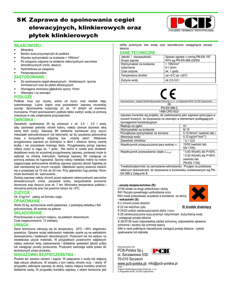 SK Zaprawa do spoinowania cegieł elewacyjnych, klinkierowych oraz płytek klinkierowych WŁAŚCIWOŚCI : Mineralna Bardzo duża przyczepność do podłoża Wysoka wytrzymałość na ściskanie > 15N/mm2 Po związaniu odporna na działanie niekorzystnych warunków atmosferycznych (mróz, deszcz) Hydrofobowa po związaniu Paroprzepuszczalna ZASTOSOWANIE : Do spoinowania cegieł elewacyjnych, klinkierowych, ręcznie formowanych oraz do płytek elewacyjnych Wymagana minimalna głębokość spoiny 15mm Wewnątrz i na zewnątrz obfite przemycie oka wodą oraz bezzwłoczne zasięgnięcie porady lekarza. DANE TECHNICZNE : Jakość i niezawodność Grupa zapraw Wytrzymałość na ściskanie Uziarnienie Czas zużycia Temperatura obróbki Spoiwo zgodne z normą PN-EN 197 M15 wg PN-EN 998-2/2004 > 15N/mm2 0-1,0mm ok. 1 godz. od +5°C do +25°C Zużycie wody ok 2,5-3,0 l PODŁOŻE : Podłoże musi być czyste, wolne od kurzu oraz resztek oleju szalunkowego. Luźne części oraz pozostałości zaprawy murarskiej usunąć. Spoinowanie rozpocząć po ok. 14 dniach od momentu murowania. Przed spoinowaniem podłoże lekko zwilżyć wodą za pomocą zraszacza w celu zwiększenia przyczepności. OBRÓBKA : Zawartość opakowania 25 kg zmieszać z ok. 2,5 – 3,0 l wody (aby zachować jednolity odcień koloru, należy zawsze dozować taką samą ilość wody). Zaprawę SK dokładnie wymieszać przy użyciu mieszadeł wolnoobrotowych lub betoniarki, aż do uzyskania jednorodnej masy o konsystencji wilgotnej tzw. „mokrej ziemi”. Właściwie przygotowana zaprawa po ściśnięciu w dłoni i otwarciu tworzy zwartą bryłkę i nie pozostawia mokrego śladu. Przygotowaną porcję zaprawy należy zużyć w ciągu ok. 1 godz. Nie wolno w czasie prac dodawać dodatkowo wody do wcześniej przygotowanej zaprawy, ponieważ może to wpłynąć na zmianę kolorystyki. Aplikacja zaprawy SK następuje za pomocą zestawu do fugowania. Spoinę należy nakładać mokre na mokre zagęszczając jednocześnie strukturę zaprawy poprzez docisk fugówką ze stali nierdzewnej lub innych narzędzi. Głębokość spoiny powinna mieścić się w przedziale od 15 mm do 20 mm. Przy głębokości fugi poniżej 15mm może dochodzić do wykruszania. Świeżą zaprawę należy chronić przed wpływem niekorzystnych warunków atmosferycznych (mróz, porywiste wiatry, bezpośrednie promienie słoneczne oraz deszcz) prze ok. 7 dni. Minimalna temperatura podłoża i otoczenia podczas prac nie powinna niższa niż +5ºC. ZUŻYCIE : Ok. 6 kg/1m2, zależy od formatu cegły. OPAKOWANIE : Worki 25 kg, wzmocnione worki papierowe, z podwójną wkładką z folii poliuretanowej. 48 worków na palecie. SKŁADOWANIE : Przechowywać w suchym miejscu, na paletach drewnianych. Czas magazynowania: 12 miesięcy UWAGA : Dane techniczne odnoszą się do temperatury 20ºC i 65% wilgotności powietrza. Opisane wyżej właściwości materiału oparte są na wieloletnim doświadczeniu i badaniach laboratoryjnych. Producent nie ma wpływu na niewłaściwe użycie materiału. W przypadkach powierzchni wątpliwych należy wykonać testy zastosowania i dokładnie sprawdzić jakość próby lub zasięgnąć porady producenta. Producent zastrzega sobie prawo do technicznych zmian produktu. WSKAZÓWKI BEZPIECZEŃSTWA : Produkt ten zawiera cement i wapno. W połączeniu z wodą lub wilgocią daje odczyn alkaliczny. W związku z tym należy chronić oczy i skórę. W przypadku zetknięcia zaprawy ze skórą, należy miejsce kontaktu przemyć dokładnie wodą. W przypadku kontaktu zaprawy z okiem konieczne jest Wyprodukowano : Hufgard Optolith Bauprodukte Polska Sp z o. o. ul. Rząsawska 40/42, 42-209 Częstochowa 09 PN-EN 998-2 1488-CPD-0021 zaprawa murarska wg projektu, do zastosowania jako zaprawa spoinująca w murach licowych, do stosowania na zewnątrz w elementach podlegających wymaganiom konstrukcyjnym Reakcja na ogień: A1 Wytrzymałość na ściskanie: M 15 Początkowa wytrzymałość na ścinanie: 0,15 N/mm² (wartość tab.) Absorpcja wody: 0,12 kg/(m²*min0,5) Zawartość chlorków: ≤0,1 %Cl 15/35 (wartość tab. Współczynnik przepuszczania pary wodnej µ: EN 1745) Współczynnik przewodzenia ciepła λ10,dry: ≤0,83 W/(mK) dla P=50% ≤0,93 W/(mK) dla P=90% (wartość tab. PN-EN 1745) Trwałość(odporność na zamrażanie-odmrażanie): Przyjęto na podstawie własnych doświadczeń; do stosowania w środowisku umiarkowanym wg PNEN 998-2 Załącznik B - zasady bezpieczeństwa (R): 37/38 działa na drogi oddechowe i skórę R41 Ryzyko poważnego uszkodzenia oczu R43 może powodować uczulenie w kontakcie ze skórą. - wskazówki (S): S 2 chronić przed dziećmi S 22 nie wdychać pyłu Xi środek drażniący S 24/25 unikać zanieczyszczenia skóry i oczu S 26 zanieczyszczone oczy przemyć natychmiast dużą ilością wody i zasięgnąć porady lekarza S 36/37/39 nosić odpowiednią odzież ochronną, odpowiednie rękawice ochronne i okulary lub ochronę twarzy S46 w razie połknięcia niezwłocznie zasięgnij porady lekarza – pokaż opakowanie lub etykietę Wyprodukowano dla : PCB-Polska Sp.j. ul. Szczawiowa 53D 70-010 Szczecin www.pcb-polska.pl; [email protected] przez : Hufgard Optolith Bauprodukte Polska Sp. z o.o. ul. Rząsawska 40/42, 42-209 Częstochowa