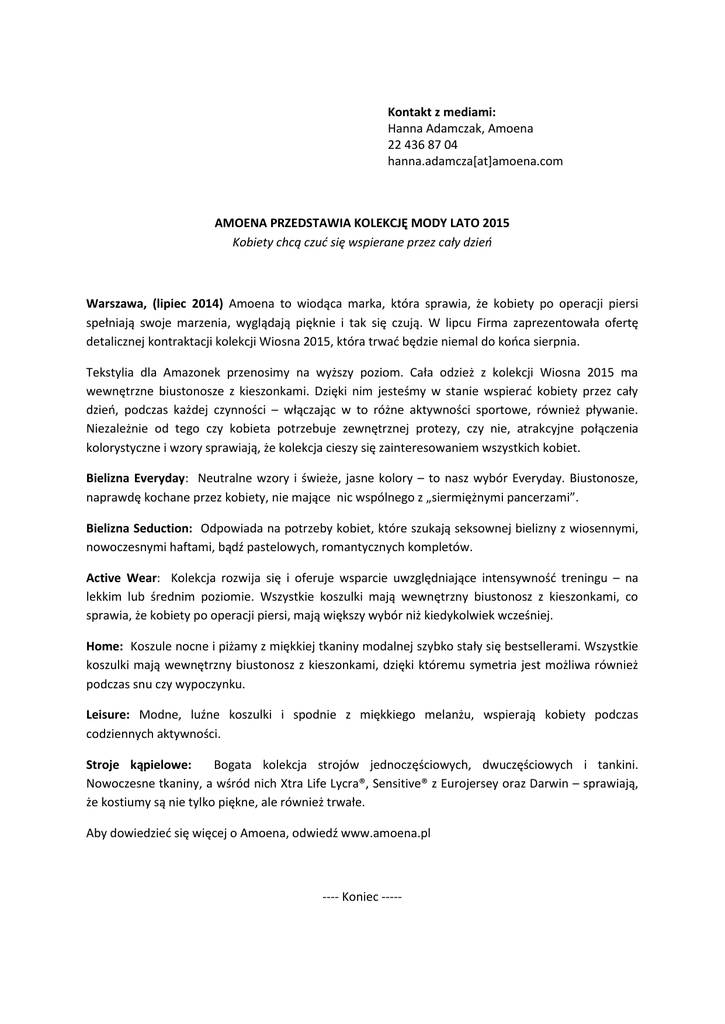 Kontakt z mediami: Hanna Adamczak, Amoena 22 436 87 04 hanna.adamcza[at]amoena.com AMOENA PRZEDSTAWIA KOLEKCJĘ MODY LATO 2015 Kobiety chcą czuć się wspierane przez cały dzień Warszawa, (lipiec 2014) Amoena to wiodąca marka, która sprawia, że kobiety po operacji piersi spełniają swoje marzenia, wyglądają pięknie i tak się czują. W lipcu Firma zaprezentowała ofertę detalicznej kontraktacji kolekcji Wiosna 2015, która trwać będzie niemal do końca sierpnia. Tekstylia dla Amazonek przenosimy na wyższy poziom. Cała odzież z kolekcji Wiosna 2015 ma wewnętrzne biustonosze z kieszonkami. Dzięki nim jesteśmy w stanie wspierać kobiety przez cały dzień, podczas każdej czynności – włączając w to różne aktywności sportowe, również pływanie. Niezależnie od tego czy kobieta potrzebuje zewnętrznej protezy, czy nie, atrakcyjne połączenia kolorystyczne i wzory sprawiają, że kolekcja cieszy się zainteresowaniem wszystkich kobiet. Bielizna Everyday: Neutralne wzory i świeże, jasne kolory – to nasz wybór Everyday. Biustonosze, naprawdę kochane przez kobiety, nie mające nic wspólnego z „siermiężnymi pancerzami”. Bielizna Seduction: Odpowiada na potrzeby kobiet, które szukają seksownej bielizny z wiosennymi, nowoczesnymi haftami, bądź pastelowych, romantycznych kompletów. Active Wear: Kolekcja rozwija się i oferuje wsparcie uwzględniające intensywność treningu – na lekkim lub średnim poziomie. Wszystkie koszulki mają wewnętrzny biustonosz z kieszonkami, co sprawia, że kobiety po operacji piersi, mają większy wybór niż kiedykolwiek wcześniej. Home: Koszule nocne i piżamy z miękkiej tkaniny modalnej szybko stały się bestsellerami. Wszystkie koszulki mają wewnętrzny biustonosz z kieszonkami, dzięki któremu symetria jest możliwa również podczas snu czy wypoczynku. Leisure: Modne, luźne koszulki i spodnie z miękkiego melanżu, wspierają kobiety podczas codziennych aktywności. Stroje kąpielowe: Bogata kolekcja strojów jednoczęściowych, dwuczęściowych i tankini. Nowoczesne tkaniny, a wśród nich Xtra Life Lycra®, Sensitive® z Eurojersey oraz Darwin – sprawiają, że kostiumy są nie tylko piękne, ale również trwałe. Aby dowiedzieć się więcej o Amoena, odwiedź www.amoena.pl ---- Koniec -----
