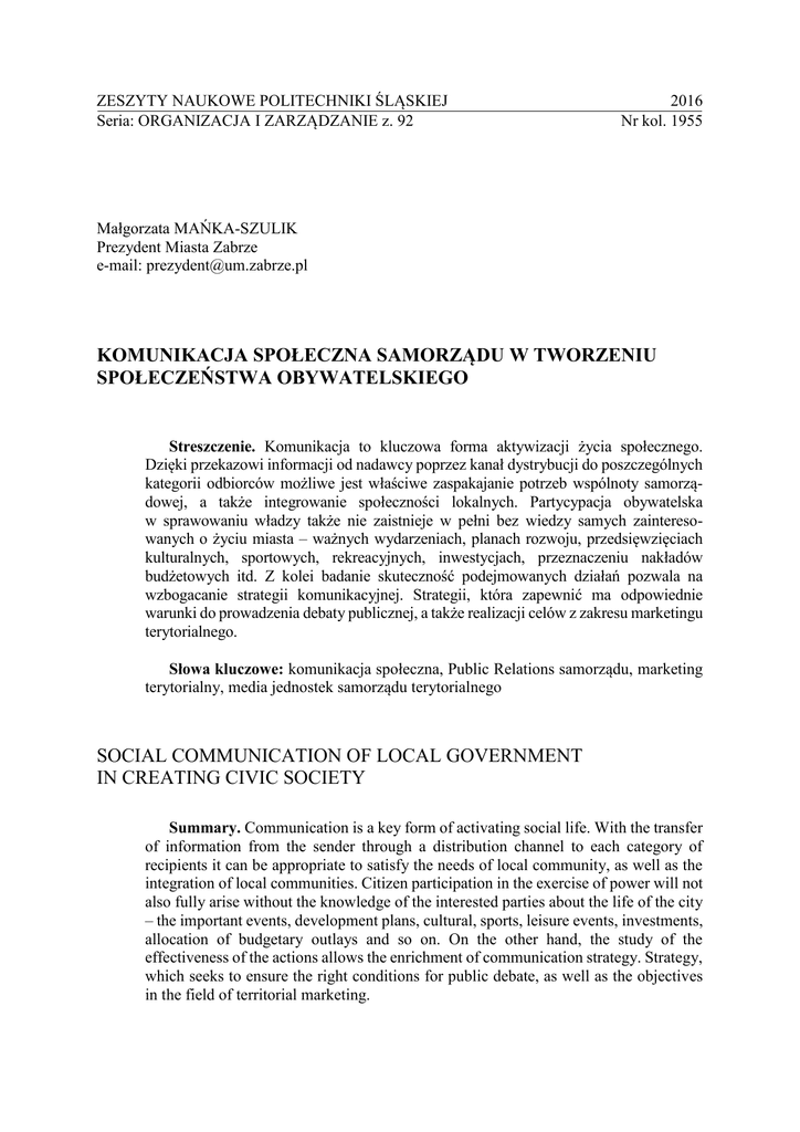 ZESZYTY NAUKOWE POLITECHNIKI ŚLĄSKIEJ Seria: ORGANIZACJA I ZARZĄDZANIE z. 92 2016 Nr kol. 1955 Małgorzata MAŃKA-SZULIK Prezydent Miasta Zabrze e-mail: [email protected] KOMUNIKACJA SPOŁECZNA SAMORZĄDU W TWORZENIU SPOŁECZEŃSTWA OBYWATELSKIEGO Streszczenie. Komunikacja to kluczowa forma aktywizacji życia społecznego. Dzięki przekazowi informacji od nadawcy poprzez kanał dystrybucji do poszczególnych kategorii odbiorców możliwe jest właściwe zaspakajanie potrzeb wspólnoty samorządowej, a także integrowanie społeczności lokalnych. Partycypacja obywatelska w sprawowaniu władzy także nie zaistnieje w pełni bez wiedzy samych zainteresowanych o życiu miasta – ważnych wydarzeniach, planach rozwoju, przedsięwzięciach kulturalnych, sportowych, rekreacyjnych, inwestycjach, przeznaczeniu nakładów budżetowych itd. Z kolei badanie skuteczność podejmowanych działań pozwala na wzbogacanie strategii komunikacyjnej. Strategii, która zapewnić ma odpowiednie warunki do prowadzenia debaty publicznej, a także realizacji celów z zakresu marketingu terytorialnego. Słowa kluczowe: komunikacja społeczna, Public Relations samorządu, marketing terytorialny, media jednostek samorządu terytorialnego SOCIAL COMMUNICATION OF LOCAL GOVERNMENT IN CREATING CIVIC SOCIETY Summary. Communication is a key form of activating social life. With the transfer of information from the sender through a distribution channel to each category of recipients it can be appropriate to satisfy the needs of local community, as well as the integration of local communities. Citizen participation in the exercise of power will not also fully arise without the knowledge of the interested parties about the life of the city – the important events, development plans, cultural, sports, leisure events, investments, allocation of budgetary outlays and so on. On the other hand, the study of the effectiveness of the actions allows the enrichment of communication strategy. Strategy, which seeks to ensure the right conditions for public debate, as well as the objectives in the field of territorial marketing. M. Mańka-Szulik 194 Keywords: social communication, public relations of local government, territorial marketing, media of local government units 1. Wstęp Komunikacja społeczna samorządów odgrywa ogromną rolę w upowszechnianiu partycypacji obywatelskiej w sprawowaniu władzy na szczeblu lokalnym. Nie ulega bowiem wątpliwości, że „samorząd terytorialny jest najpowszechniejszą formą uczestnictwa w życiu publicznym. Dla setek tysięcy obywateli instytucja władzy samorządowej stanowi pierwszy (i niekiedy jedyny) etap politycznego i społecznego zaangażowania”1. Samorząd powinien nie tylko wypełniać funkcje administracyjne i zarządcze, lecz także aktywizacyjne w procesie tworzenia społeczeństwa obywatelskiego, będącego „autonomiczną wobec państwa przestrzenią, wypełnioną przez dobrowolne współdziałanie zrzeszonych jednostek”2. Aby rolę tę efektywnie wypełniać, samorząd musi komunikować się ze społecznością lokalną tworząc trwałe relacje m.in. poprzez przekazywanie wiarygodnych i rzetelnych informacji. Kolejny obszar aktywności komunikacyjnej samorządów stanowi formułowanie przekazów perswazyjnych w ramach zadania własnego jednostki samorządu terytorialnego, jakim ustawodawca uczynił promocję gminy. Warto zaznaczyć, że zmiany na rynku medialnym wynikające z rozwoju nowoczesnych technologii powodują, że jednokierunkowy przekaz komunikatu perswazyjnego, rozumiany niegdyś pod pojęciem promocji, zastępowany jest formami dwukierunkowymi z możliwościami uzyskania sprzężenia zwrotnego w postaci reakcji adresatów na odebrane treści. Dlatego w literaturze wskazuje się na potrzebę „szerszego ujmowania tego elementu kompozycji marketingowej, zastępując pojęcie «promocja» określeniem «komunikacja marketingowa»”3, co akcentuje zarazem rolę odbiorcy jako aktywnego elementu w procesie komunikacji, posiadającego równoważny status z nadawcą komunikatu (stanowi to zresztą charakterystyczne zjawisko, szczególnie w przypadku mediów społecznościowych). Piasecki A.K.: Przegrani czy wykluczeni? Kandydaci pokonani w małopolskich wyborach samorządowych w 2006 roku, [w:] Magoska M. (red.): Wybory samorządowe w kontekście mediów i polityki. Uniwersytet Jagielloński, Kraków 2008, s. 52. 2 Dzwończyk J.: Ekonomiczny nurt analiz społeczeństwa obywatelskiego. Zeszyty Naukowe „Problemy społeczne, polityczne i prawne”, nr 870. Uniwersytet Ekonomiczny, Kraków 2011, s. 5. 3 Gębarowski M.: Nowoczesne formy promocji. Politechnika Rzeszowska, Rzeszów 2007, s. 8. 1 Komunikacja społeczna samorządu… 195 2. Adresaci samorządowych działań komunikacyjnych na przykładzie Zabrza Zasięg społeczny działań komunikacyjnych jednostek samorządu terytorialnego obejmuje obiorców, których strukturę można usystematyzować z użyciem podziału na (1) mieszkańców oraz (2) osoby w różny sposób związane z gminą. Kategoryzacja adresatów aktywności komunikacyjnej samorządu porządkuje podejmowane działania z zakresu polityki informacyjnej i promocyjnej. Oczywistym jest przy tym, że „nie do każdej grupy wysyłać będziemy ten sam przekaz. Nie chodzi przy tym o to, by mówić każdemu tylko to, co chce usłyszeć, lub – jeszcze gorzej – różnym grupom przekazywać sprzeczne ze sobą komunikaty. Po prostu często na rzecz jednej sprawy można użyć wielu argumentów, ale ich dobór zależy od specyfiki danej grupy” 4. W głównej mierze odbiorcami działań z zakresu public relations oraz reklamy są mieszkańcy, wobec których prowadzona powinna być polityka informacyjna i perswazyjna, uwzględniająca potrzebę dotarcia do adresatów z aktualnymi, ważnymi, wszechstronnymi i wiarygodnymi wiadomościami związanymi z wydarzeniami w gminie. Działanie takie wzmacnia więzi lokalne i zapewnia mieszkańcom możliwość p