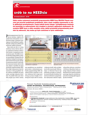 prezentacja zrób to na NEEDzie Bartłomiej Szydłowski – RELPOL Gdzie można zastosować przekaźnik programowalny NEED firmy RELPOL? Rynek nasycony jest przecież podobnymi produktami, które często znajdują zastosowanie w wielu aplikacjach przemysłowych. Często jednak koszty zakupu i skomplikowana instalacja nie pozwalają na wykorzystanie tych urządzeń w prostych aplikacjach użytkowych. Na szczęście NEED łączy w sobie wszystkie cechy, jakimi przekaźnik programowalny powinien się odznaczać, aby można go było zastosować w życiu codziennym. P rostota programowania, łatwa i bezpieczna instalacja, wyjątkowa dla użytkownika funkcjonalność oraz niskie koszty zakupu, to elementy wyróżniające go wśród podobnych urządzeń. Wszystko zawdzięczamy polskiej myśli technicznej i polskim inżynierom. Nasza natura jest taka, że w miarę możliwości chcemy ułatwiać sobie życie, a jeżeli jeszcze możemy to zrobić niskim kosztem, to najczęściej nie możemy się temu oprzeć. Aby daleko nie szukać dowodów takiego podejścia, posłużmy się przykładem własnego domu lub mieszkania. Budując lub remontując budynki zastanawiamy się często, jak dzięki zastosowaniu prostych i tanich układów sterowania możemy ułatwić sobie życie. Jednym ze sposobów jest użycie przekaźnika programowalnego NEED, który dzięki swojej prostocie może być stosowany w wielu przypadkach. Bardzo ciekawym przykładem jest prosty system czasowego wyłączania oświetlenia. Na przykład, kiedy nasze dzieci lubią zasypiać przy świetle, możemy Wykorzystanie przekaźnika programowalnego do sterowania oświetleniem w sypialniach sami zaprojektować oraz zainstalować prosty system z wykorzystaniem przekaźnika programowalnego NEED, aby uniknąć kosztów związanych ze zużyciem nadmiernej ilości energii przez świecącą się całą noc lampkę i nie zobowiązywać innych osób do czuwania Wykorzystanie zegarów czasu rzeczywistego do symulacji obecności w domu i wyłączenia światła, kiedy my będziemy już sobie smacznie spali. Należy pamiętać, że właściwości fizyczne tego przekaźnika pozwalają na wysterowanie czterech obwodów oświetlenia. Podstawowym założeniem w programie będzie wykorzystanie zależności między wyłącznikiem głównym oświetlenia i chwilowym włącznikiem funkcji czasowego wyłączenia obwodu. Istotnym elementem jest też sposób rozwiązania ponownego załączenia oświetlenia poprzez zbocze narastające głównego przełącznika oświetlenia. reklama Forum Technik Instalacyjnych NOWE WYZWANIA, TECHNOLOGIE, WYMAGANIA Międzynarodowe Targi Instalacyjne - INSTALACJE 2006 Poznań, 28 marca 2006 r. Redakcje miesięczników elektro.info i Rynek Instalacyjny wraz z MTP i organizacjami branżowymi organizują na targach INSTALACJE 2006 konferencję Forum Technik Instalacyjnych - NOWE WYZWANIA, TECHNOLOGIE, WYMAGANIA. Będzie się ona składać z sesji ogólnej i czterech bloków tematycznych: � ogrzewanie, � inteligentny budynek (uwagi praktyczne dla projektantów instalacji EIB, sterowniki EIB jako podstawowy element instalacji elektrycznej, instalacja klasyczna a EIB), � wentylacja i klimatyzacja, � wod-kan. Udział w konferencji jest bezpłatny, chęć uczestnictwa prosimy zgłosić przesyłając wiadomość na adres: [email protected] lub faksem (0-22) 810 27 42 48 w w w. e l e k t r o . i n f o . p l w w w. i n s t a l a c j e . m t p . p l nr 3/2006 w w w. e l e k t r o . i n f o . p l w w w. r y n e k i n s t a l a c y j n y. c o m . p l Sposób skonfigurowania sterowania nawadnianiem w szklarniach Kiedy długo jesteśmy nieobecni w domu, martwimy się, czy czasem złodzieje nie złożyli nam „wizyty”. Często nie stać nas jednak na dedykowane systemy alarmowe chroniące nasze mienie, dlatego zastanawiamy się nad innymi rozwiązaniami, które zabezpieczą nas przed kradzieżą. Jednym z nich jest zainstalowanie prostego systemu symulacji obecności w domu z wykorzystaniem przekaźnika programowalnego. Zastosowanie zegara czasu rzeczywistego sterującego oświetleniem w dowolnych punktach domu pozwala na dowolne konfigurowanie czasu załączania i wyłączania. Dzięki dużej obciążalności (10 A / 250 VAC) wyjścia przekaźnika można często bezpośrednio łączyć z obwodami oświetleniowymi. Cały obwód można sterować jednym przełącznikiem, którego zadaniem miałoby być uaktywnianie sekwencyjnego załączania obwodów oświetleniowych. Ważne jest to, aby w odpowiedni sposób ustawić załączanie obwodów oświetleniowych tak, aby były widoczne z okien. Określając czasy załączania należy również Przekaźnik programowalny NEED nr 3/2006 pamiętać o pobieranej mocy. Odpowiednie wykorzystanie każdego z zegarów sterujących oraz ich kanałów umożliwia stworzenie bardzo realnego algorytmu załączeń. W wielu gospodarstwach wiejskich można spotkać większe bądź mniejsze plantacje warzyw szklarniowych. Rolnicy wielokrotnie w tej samej szklarni uprawiają różnego rodzaju warzywa. Pielęgnacja tego typu upraw polega na odpowiednim nawadnianiu każdego typu warzyw, co stwarza nie lada problem w sytuacji, kiedy mamy do wykonania również inne obowiązki. Wówczas pomocny może być mały system cyklicznego nawadniania, w którym maksymalnie cztery pompki mogą być sterowane za pomocą zegarów czasu rzeczywistego przekaźnika NEED. Wprawny rolnik jest w stanie określić, co jaki czas dany rodzaj warzywa powinien być nawadniany, co pozwala na ustawienie czasów załączeń odpowiednich pompek i czasów trwania nawadniania. A że pogoda bywa kapryśna, należy wziąć pod uwagę również możliwość przełączania z trybów pracy w dni upalne lub w dni chłodne. Zaprezentowaliśmy jedynie kilka przykładów zastosowania przekaźnika programowalnego NEED. Jak widać, wystarczy odrobina umiejętności programowania tego produktu, a będziemy mogli tworzyć aplikacje przydatne w życiu codziennym i