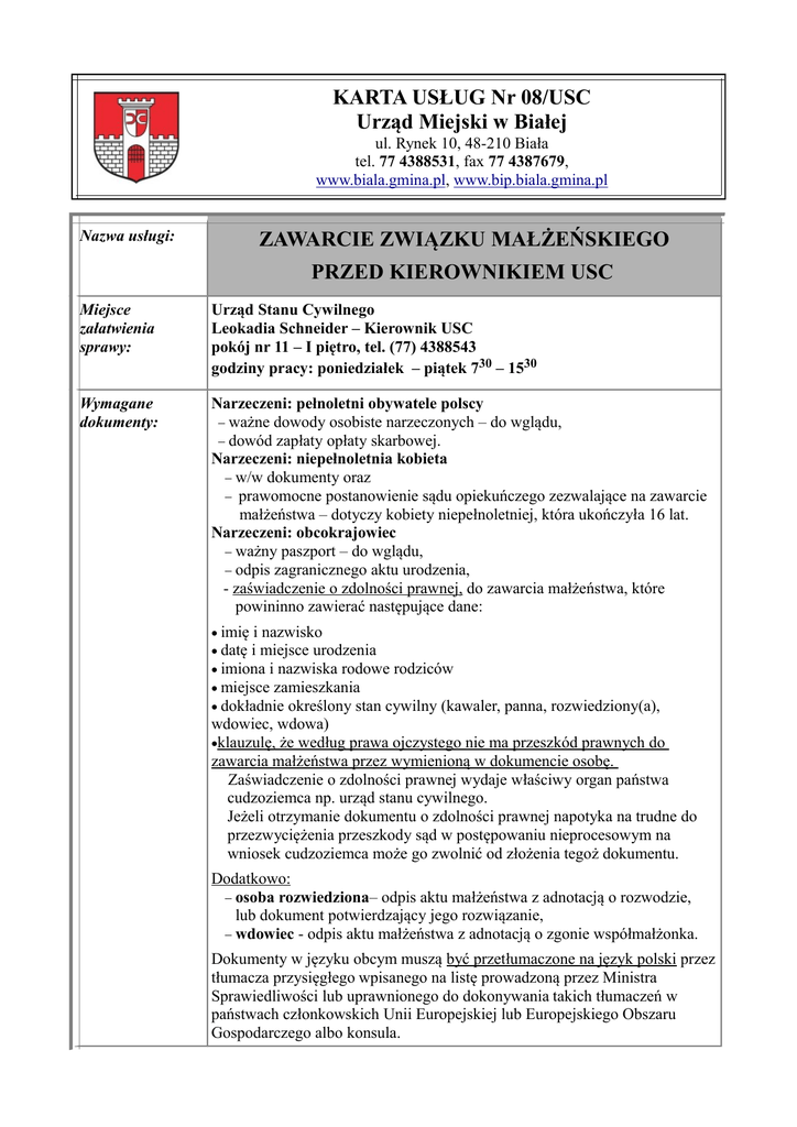 KARTA USŁUG Nr 08/USC Urząd Miejski w Białej ZAWARCIE