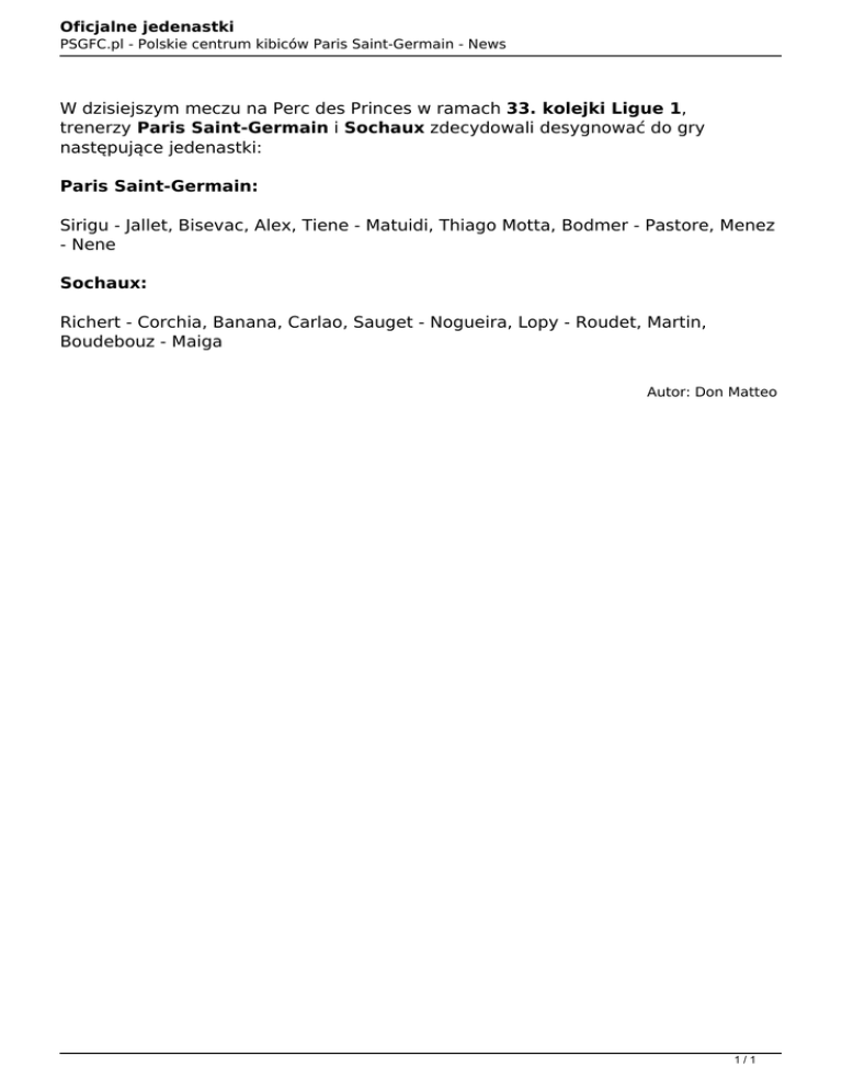 Oficjalne jedenastki PSGFC.pl - Polskie centrum kibiców Paris Saint-Germain - News W dzisiejszym meczu na Perc des Princes w ramach 33. kolejki Ligue 1, trenerzy Paris Saint-Germain i Sochaux zdecydowali desygnować do gry następujące jedenastki: Paris Saint-Germain: Sirigu - Jallet, Bisevac, Alex, Tiene - Matuidi, Thiago Motta, Bodmer - Pastore, Menez - Nene Sochaux: Richert - Corchia, Banana, Carlao, Sauget - Nogueira, Lopy - Roudet, Martin, Boudebouz - Maiga Autor: Don Matteo 1/1 Powered by TCPDF (www.tcpdf.org)