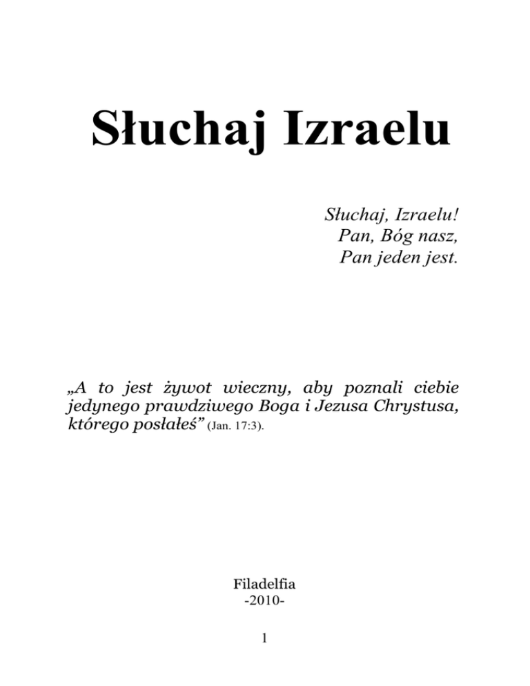 Słuchaj Izraelu Słuchaj, Izraelu! Pan, Bóg nasz, Pan jeden jest. „A to jest żywot wieczny, aby poznali ciebie jedynego prawdziwego Boga i Jezusa Chrystusa, którego posłałeś” (Jan. 17:3). Filadelfia -20101 Projekt okładki: Krzysztof Maciejewski Fotografie na okładce: Piotr Kęsy Książka dostępna jest również w wersji elektronicznej w formacie PDF na stronie www.filadelfiamedia.com w dziale „książki”. Kopiowanie jak i drukowanie tej książki jest dozwolone i zalecane. Wszystkie książki z wydawnictwa Filadelfia są bezpłatne. ISBN 978-83-931738-2-2 W sprawach zamówień prosimy zwracać się do: Wydawnictwo Filadelfia Piotr Paweł Maciejewski Glinik Zaborowski 166 38-100 Strzyżów Tel. Kom.: 609-981-808 e-mail: [email protected] www.filadelfiamedia.com 2 Spis treści Bóg jest jeden Studium odstępstwa – geneza nauki o Trójcy Syn Boży Jak pionierzy Ruchu Adwentowego wierzyli o Synu Bożym Teksty kontrowersyjne i formuły pozornie trynitarne Duch Boży Analiza tekstu z Ewangelii Mateusza 28:19 3 5 22 45 59 67 79 122 Spis użytych skrótów: AA – The Acts of The Apostels CH – Counsels on Health CM – Colporteur Ministry COL – Christ’s Object Lessons CSW - Counsels on Sabbath School Work CT – Counsels to Parents, Teachers and Students CW – Counsels to Writers and Editors DA – The Desire of Ages Ed – Education Ev. – Evangelism EW – Early Writings GC – The Great Controversy Lt. – Letter nr … ML – My Life Today MM – Medical Ministry Ms. – Manuscript nr … MR – Manuscript Releases R&H – Review and Herald SC. – Steps to Christ SM – Selected Messages Sp.T – Special Testimonies SR – The Story of Redemption ST – Signs of the Times 1-9T – Testimonies for the Church TM - Testimonies to Ministers 4 Bóg jest jeden Z pełną świadomością powagi problemu chcemy rozważyć kwestię natury Bóstwa. Wiemy, że nasze ludzkie umysły są ograniczone i nie jesteśmy w stanie w pełni poznać nieograniczonego Boga. Ufamy jednak, że Słowo Boże jest dane dla naszego pożytku i że powierzone nam zostało właśnie po to, abyśmy je rozważali i zgłębiali. „To, co jest zakryte, należy do Pana, Boga naszego, a co jest jawne, do nas i do naszych synów po wieczne czasy, abyśmy wypełniali wszystkie słowa tego zakonu” (5Moj. 29:28). Bóg objawia w Piśmie Świętym wszystko, co jest istotne dla naszego zbawienia. Czy zatem rozważanie istoty Bóstwa jest ważne dla naszego zbawienia? „A to jest żywot wieczny, aby poznali ciebie, jedynego prawdziwego Boga i Jezusa Chrystusa, którego posłałeś” (Jan. 17:3). Widzimy, że bez poznania jedynego prawdziwego Boga nie będziemy mogli zdobyć żywota wiecznego. Jeśli ci, którzy chcą być zbawieni, mają mieć charakter Boga i Baranka, muszą najpierw poznać Tego, w którego wierzą i do którego mają być podobni. „Jest pierwszym i najważniejszym obowiązkiem każdej rozumnej istoty nauczyć się z Pism, co jest prawdą, a potem kroczyć w świetle, zachęcając innych do podążania za tym przykładem. Nieznajomość Słowa Bożego jest grzechem, gdyż uczyniono wszystko, abyśmy mogli być mądrzy. Powinniśmy dzień po dniu pilnie studiować Biblię, ważąc każdą myśl, porównując urywek z urywkiem” (WB, wyd. 1884, str.416). „Nasze zbawienie zależy od zrozumienia prawdy zawartej w Pismach” (COL, 111 / Przyp. Chrystusa wyd. II, 58). „Świat ginie na skutek niedostatku ewangelii. Istnieje głód Słowa Bożego. Niewielu jest tych, którzy głoszą słowo nie wymieszane z ludzką tradycją. Choć ludzie mają Biblię w swoich rękach, jednak nie otrzymują tego błogosławieństwa, jakie Bóg dla nich w niej umieścił” (COL, 228 / Przyp. Chrystusa wyd. II, 128). „Poznanie Boga jest podstawą prawdziwego chrystiańskiego wychowania, wykształcenia i naszej rzetelnej służby. Poznanie Go 5 stanowi naszą obronę przed pokusami. Dzięki Niemu możemy nasz charakter upodobnić do charakteru naszego Stwórcy. Wiedza o Bogu wymagana jest od wszystkich (...) Zmiana charakteru, czystość życia, wiarygodność w służbie i wierne zachowywanie poznanych zasad, wszystko to jest uzależnione od posiadania rzetelnej wiedzy o Bogu” (Życie mądre i szczęśliwe, 204). „Błąd nigdy nie jest nieszkodliwy, nigdy nie uświęca, zawsze przynosi zamieszanie i rozłam. Jest zawsze niebezpieczny. Wróg ma wielką władzę nad umysłami, które nie są całkowicie chronione przez modlitwę i utwierdzone w prawdzie biblijnej” (5T, 292). „Każda nowo objawiona prawda jest świeżym ukazaniem charakteru jej Autora. Studium Pism jest wyznaczonym przez Boga środkiem, by doprowadzić ludzi do bliższego związku z ich Stwórcą, dać im jaśniejsze poznanie Jego woli. To jest środek komunikacji pomiędzy Bogiem a człowiekiem” (WB 1884, 75). „Żaden mężczyzna, kobieta czy też młodzieniec nie mogą osiągnąć chrystiańskiej doskonałości, a jednocześnie zaniedbywać studiowanie Słowa Bożego. Poprzez uważne i dokładne badanie Jego Słowa będziemy posłuszni nakazom Chrystusa” (CSW, 17). „W walce o życie wieczne nie możemy polegać jeden na drugim; chleb żywota musi być spożywany przez każdego. Musimy w tym uczestniczyć indywidualnie, aby dusza, ciało i umysł mogły być ożywione i wzmocnione przez jego przemieniającą moc, stając się w ten sposób upodobnionymi do umysłu i charakteru Jezusa Chrystusa” (TM, 385). Powyższe teksty pokazują jak ważne jest indywidualne, głębokie studium i poznanie prawdy w każdej kwestii, także w kwestii Bóstwa. Każdą z nauk Pismo Święte określa w sposób jednoznaczny, jasny i zrozumiały. Również nauka o Bóstwie jest jednoznacznie określona. Jedynie naszej niedbałości i niedostatecznej gorliwości w badaniu Słowa Bożego należy przypisać to, że tak często pozostajemy pod wpływem tradycji lub wątpliwości. Z tego też powodu pewne problemy pozostają niewyjaśnione a ludz