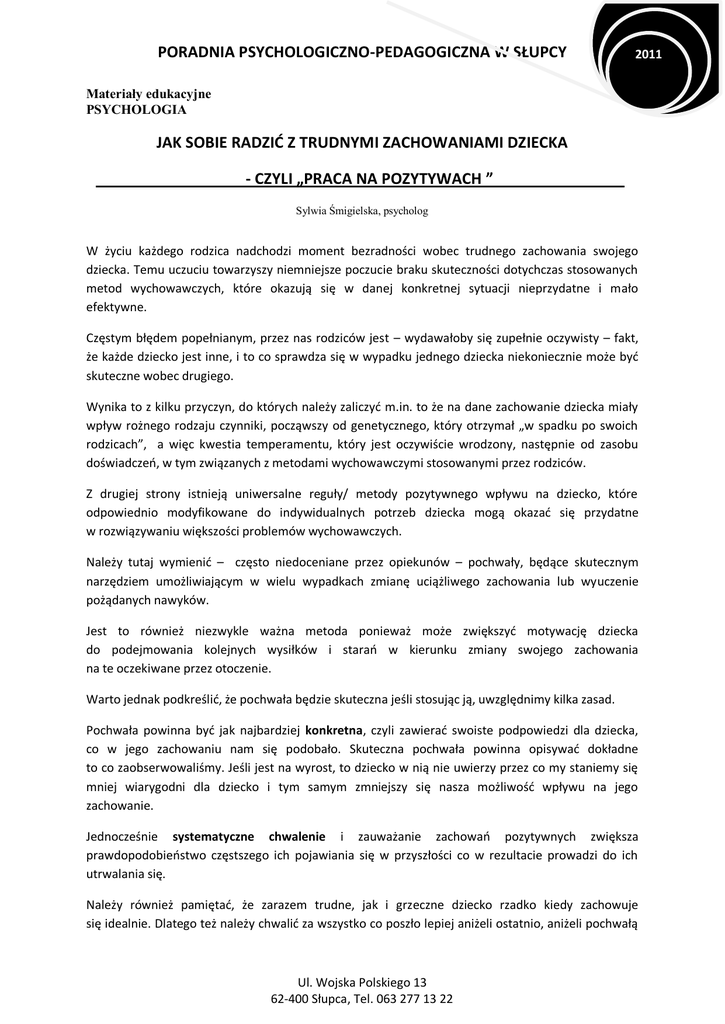 PORADNIA PSYCHOLOGICZNO-PEDAGOGICZNA W SŁUPCY 2011 Materiały edukacyjne PSYCHOLOGIA JAK SOBIE RADZIĆ Z TRUDNYMI ZACHOWANIAMI DZIECKA - CZYLI „PRACA NA POZYTYWACH ” . Sylwia Śmigielska, psycholog W życiu każdego rodzica nadchodzi moment bezradności wobec trudnego zachowania swojego dziecka. Temu uczuciu towarzyszy niemniejsze poczucie braku skuteczności dotychczas stosowanych metod wychowawczych, które okazują się w danej konkretnej sytuacji nieprzydatne i mało efektywne. Częstym błędem popełnianym, przez nas rodziców jest – wydawałoby się zupełnie oczywisty – fakt, że każde dziecko jest inne, i to co sprawdza się w wypadku jednego dziecka niekoniecznie może być skuteczne wobec drugiego. Wynika to z kilku przyczyn, do których należy zaliczyć m.in. to że na dane zachowanie dziecka miały wpływ rożnego rodzaju czynniki, począwszy od genetycznego, który otrzymał „w spadku po swoich rodzicach”, a więc kwestia temperamentu, który jest oczywiście wrodzony, następnie od zasobu doświadczeń, w tym związanych z metodami wychowawczymi stosowanymi przez rodziców. Z drugiej strony istnieją uniwersalne reguły/ metody pozytywnego wpływu na dziecko, które odpowiednio modyfikowane do indywidualnych potrzeb dziecka mogą okazać się przydatne w rozwiązywaniu większości problemów wychowawczych. Należy tutaj wymienić – często niedoceniane przez opiekunów – pochwały, będące skutecznym narzędziem umożliwiającym w wielu wypadkach zmianę uciążliwego zachowania lub wyuczenie pożądanych nawyków. Jest to również niezwykle ważna metoda ponieważ może zwiększyć motywację dziecka do podejmowania kolejnych wysiłków i starań w kierunku zmiany swojego zachowania na te oczekiwane przez otoczenie. Warto jednak podkreślić, że pochwała będzie skuteczna jeśli stosując ją, uwzględnimy kilka zasad. Pochwała powinna być jak najbardziej konkretna, czyli zawierać swoiste podpowiedzi dla dziecka, co w jego zachowaniu nam się podobało. Skuteczna pochwała powinna opisywać dokładne to co zaobserwowaliśmy. Jeśli jest na wyrost, to dziecko w nią nie uwierzy przez co my staniemy się mniej wiarygodni dla dziecko i tym samym zmniejszy się nasza możliwość wpływu na jego zachowanie. Jednocześnie systematyczne chwalenie i zauważanie zachowań pozytywnych zwiększa prawdopodobieństwo częstszego ich pojawiania się w przyszłości co w rezultacie prowadzi do ich utrwalania się. Należy również pamiętać, że zarazem trudne, jak i grzeczne dziecko rzadko kiedy zachowuje się idealnie. Dlatego też należy chwalić za wszystko co poszło lepiej aniżeli ostatnio, aniżeli pochwałą Ul. Wojska Polskiego 13 62-400 Słupca, Tel. 063 277 13 22 PORADNIA PSYCHOLOGICZNO-PEDAGOGICZNA W SŁUPCY 2011 pokazywać że dotychczas jego zachowanie było nic nie warte. Ponadto pochwała powinna być zastosowana natychmiast po tym, gdy pożądane zachowanie zostało zaobserwowane. Nade wszystko pamiętajmy ze nasze dzieci nas kochają i pragną spełniać nasze oczekiwania aby zdobyć/zasłużyć sobie na nasza miłość. Nie zawsze jednak potrafią sprostać naszym wyobrażeniom o nich i wtedy rezygnują stając na drugim końcu continuum naszych oczekiwań. Bowiem jeśli nie mogą być kochane to przynajmniej pragną zostać zauważone - nawet jeśli ceną miałaby być kara za niepożądane zachowania/nieposłuszeństwo. Ul. Wojska Polskiego 13 62-400 Słupca, Tel. 063 277 13 22