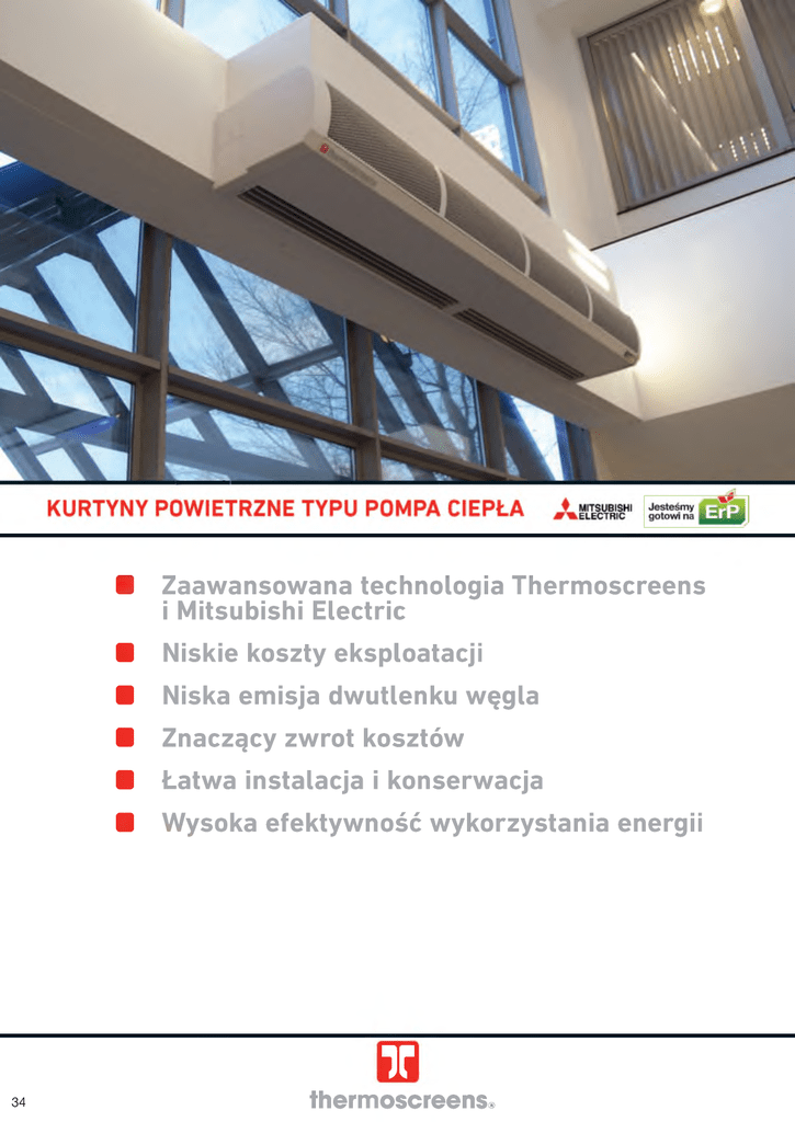 ■ Zaawansowana technologia Thermoscreens i Mitsubishi Electric ■ Niskie koszty eksploatacji ■ Niska emisja dwutlenku węgla ■ Znaczący zwrot kosztów ■ Łatwa instalacja i konserwacja ■ Wysoka efektywność wykorzystania energii ir 34 thermoscreens® Jesteśmy gotowi na CHARAKTERYSTYKA *4 Kurtyny powietrzne PHV DXE to produkt powstały dzięki współpracy Thermoscreens z Mitsubishi Electric. Kurtyny te są przeznaczone do podłączenia z agregatami pracującymi na czynniku R41OA: inwerterowymi Mr Slim bądź agregatami VRF City Multi. Jest to możliwe dzięki wbudowanemu w kurtynach specjalnemu obwodowi elektrycznemu. OGÓLNA ZASADA DZIAŁANIA Jednostki zewnętrzne z wykorzystaniem czynnika R410A pozyskują (przetłaczają) energię cieplną z powietrza. Energia pobierana z powietrza 3 kW m T K : 1 kW Pobierana energia elektryczna powietrza * Jednostka zewnętrzna (pompa ciepła) Przykładowe rozwiązania z agregatami VRF * VRF - zm ienny przepływ czynnika chłodniczego 35 KURTYNY DEDYKOWANE DO SERII MR SLIM MITSUBISHI Æ ^ E L E C T R IC PHV DXE do montażu "odsłoniętego" Wymiary (mm) (dł. X głęb. X wys.) Zasilanie (50Hz) PHV1500DXE NT HO 1746 x 377 x 255 400V~3 PHV2000DXE NT LO 2296 x 377 x 255 400V~3 PHV2000DXE NT HO 2296 x 377 x 255 400V~3 Modele Moc cieplna (kW) COP 50% 8.3 3.7 100% 50% 14.4 7.9 2.5 3.7 100% 50% 14.1 11.2 2.9 3.2 100% 21.3 2.4 Natężenie na fazę (A) Maks. Maks. przepływ Masa prędkość powietrza (kg) (m3/h) (m/s) dB(A 12.71 9.0 2600 60 60 15.72 9.5 3300 78 61 15.72 9.0 3130 80 61 1 - k u r ty n y z o d łą c z o n y m i g rz a łk a m i e le k try c z n y m i: z a s ila n ie 240V, n a tę ż e n ie p rą d u na fa z ę 1.8A. 2 - k u r ty n y z o d łą c z o n y m i g rz a łk a m i e le k try c z n y m i: z a s ila n ie 240V, n a tę ż e n ie p rą d u na fa z ę 2.7A PHV DXE do montażu w zabudowie Wymiary (mm) (dł. X głęb. X wys.) Zasilanie (50Hz) PHV1500DXE R HO 1650 x 436 x 296 400V~3 PHV2000DXE R LO 2240 x 436 x 296 400V~3 PHV2000DXE R HO 2240 x 436 x 296 400V~3 Modele Moc cieplna (kW) COP 50% 8.3 3.7 100% 50% 14.4 7.9 2.5 3.7 100% 50% 14.1 11.2 2.9 3.2 100% 21.3 2.4 Natężenie na fazę (A) dB(A) 12.71 9.0 2600 67 60 15.72 9.5 3300 85 61 15.72 9.0 3130 88 61 1 - k u r ty n y z o d łą c z o n y m i g rz a łk a m i e le k try c z n y m i: z a s ila n ie 240V, n a tę ż e n ie p rą d u na fa z ę 1.8A. 2 - k u r ty n y z o d łą c z o n y m i g rz a łk a m i e le k try c z n y m i: z a s ila n ie 240V, n a tę ż e n ie p rą d u na fa z ę 2.7A ir 36 Maks. Maks. przepływ Masa prędkość powietrza (kg) (m3/h) (m/s) thermoscreens® WYMIARY GABARYTOWE I MONTAŻOWE Wymiar PHV DXE do montażu “odsłoniętego” E V) E I 1 Pi ° liJ n Ul LiiJ PHV1500DXE NT PHV2000DXE NT A (m m ) 1746 229 6 B (m m ) 1400 1896 C (m m ) 700 948 D (m m ) 1300 1824 E (m m ) 650 912 Wymiar PHV DXE do montażu w zabudowie A lte r n a ty w n e m ie js c e p o d łą c z e n ia z a s ila n ia i s te ro w a n ia Strop podwieszany W e jście p rz e w o d ó w z a s ila n ia i s te r o w a n ia PHV1500DXE R PHV2000DXER A (m m ) 1650 2240 B (m m ) 800 1095 C (m m ) 1690 2290 D łu g o ś ć (m m ) 1655 2245 S z e ro k o ś ć (m m ) 445 445 W y c ię c ie w s tro p ie : 37 Seria City Multi Modele Wymiary (mm) (dł. X głęb. X wys.) Zasilanie (50Hz) Moc cieplna (kW) Natężenie na fazę (A) Maks. prędkość (m/s) Maks. przepływ powietrza (m3/h) Masa (kg) dB(A) Indeks 3m wydajności VRFPHV 1000 DXE HO 1196 x 377 x 255 400V-3P 9.0 9.2 9.0 1400 39 59 P125 VRF PHV 1500 DXE LO 1746 x 377 x 255 400V-3P 10.0 12.7 9.0 2500 59 60 P125 VRFPHV 1500 DXE HO 1746 x 377 x 255 400V-3P 15.1 12.7 9.0 2600 60 60 P140 VRF PHV 2000 DXE LO 2296 x 377 x 255 400V~3P 16.4 15.7 9.5 3300 78 61 P140 VRF PHV 2000 DXE HO 2296 x 377 x 255 400V-3P 21.4 15.7 9.0 3130 80 61 P250 Wymiary (mm) (dł. X głęb. X wys.) Zasilanie (50Hz) Moc cieplna (kW) Natężenie na fazę (A) Maks. prędkość (m/s) Maks. przepływ powietrza (m3/h) Masa (kg) VRF PHV 1000R DXE HO 1150 x 436 x 296 400V~3P 9.0 9.2 9.0 1400 45 59 P125 VRF PHV 1500R DXE LO 1650 x 436 x 296 400V-3P 10.0 12.7 9.0 2500 66 60 P125 VRF PHV 1500R DXE HO 1650 x 436 x 296 400V-3P 15.1 12.7 9.0 2600 67 60 P140 VRF PHV 2000R DXE LO 2240 x 436 x 296 400V-3P 16.4 15.7 9.5 3300 85 61 P140 VRF PHV 2000R DXE HO 2240 x 436 x 296 400V-3P 21.4 15.7 9.0 3130 88 61 P250 Seria City Multi do zabudowy Modele ir 38 thermoscreens® dB(A) Indeks 3m wydajności SCHEMAT PODŁĄCZENIA DO SYSTEMÓW CITY MULTI Podłączenie do jednostek zewnętrznych PUHY Thermoscreens + Mitsubishi Electric Je d n o s tk i w e w n ę trz n e i k u rty n y p o w ie trz n e p ra cu ją ce w ty m sa m ym try b ie w ty m s a m y m c z a s ie (ch ło d z e n ie a lb o g rz a n ie ) DI M o d u ł P A C -A H (M its u b is h i E le ctric) Zasilanie dla: • W entylator • Grzałki cyklu odszraniania • Moduł PAC-AH systemu City Multi (Mitsubishi Electric) "T5 Wentylatory p l Czujniki K urtyn a p o w ie trzn a 3 O J e d n o s tk a ze w n ę trz n a (M its u b is h i E le ctric) pilot — PAR-21 M A A P A R -F 2 7 (M itsu b ish i E le ctric) J e d n o s tk a w e w n ę trz n a (M its u b is h i E le ctric) m DI System BMS f Przewody chłodnicze Przewody zasilające / sterujące E le m en ty system u C ity M ulti w ym a g a n e p rzy pod łą czen iu ku rtyn y pow ietrzn e j: K urtyn a p ow ietrzn a M o d uł P A C -A H -M -H lub P A C -A H -M -G (1 szt. d la każdej kurtyny) P ilo t P AR -21 M A A lub P A R -F 2 7 (1 szt. na ka żd y m o d u ł P A C -A H ) Je d n o stka z e w n ę trzn a C ity M ulti Je d n o stki w e w n ę trz n e C ity M ulti (o p cjon a lnie) S yste m B M S (o p cjon a lnie) K urtyna w ym a g a z a sila n ia 3 -fazo w e go . Podłączenie do jednostek zewnętrznych PURY Thermoscreens + Mitsubishi Electric Jednostki wewnętrzne i kurtyny powietrzne mogą pracować w trybie chłodzenie lub grzanie niezależnie od siebie (wysokie COP) BC Controller (Mitsubishi Elec