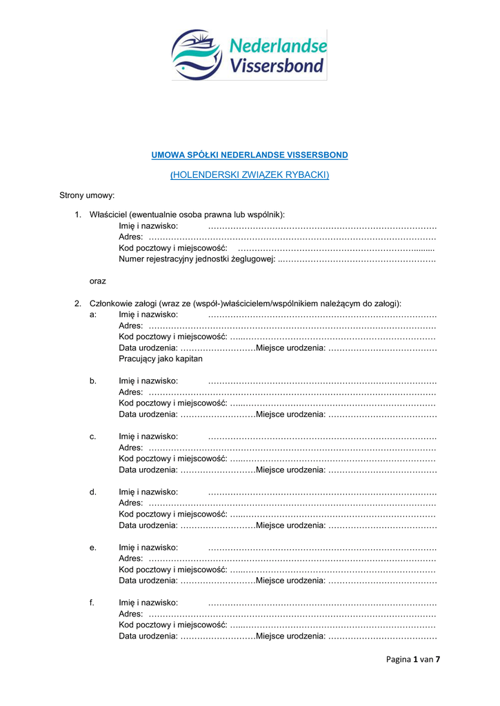 UMOWA SPÓŁKI NEDERLANDSE VISSERSBOND (HOLENDERSKI ZWIĄZEK RYBACKI) Strony umowy: 1. Właściciel (ewentualnie osoba prawna lub wspólnik): Imię i nazwisko: ………………………………………………………………………. Adres: …………………………………………………………………………………………. Kod pocztowy i miejscowość: ………………………………………………………......... Numer rejestracyjny jednostki żeglugowej: ..………………………………………………. oraz 2. Członkowie załogi (wraz ze (współ-)właścicielem/wspólnikiem należącym do załogi): a: Imię i nazwisko: ………………………………………………………………………. Adres: …………………………………………………………………………………………. Kod pocztowy i miejscowość: …..…………………………………………………………… Data urodzenia: ………………………Miejsce urodzenia: ………………………………… Pracujący jako kapitan b. Imię i nazwisko: ………………………………………………………………………. Adres: …………………………………………………………………………………………. Kod pocztowy i miejscowość: …..…………………………………………………………… Data urodzenia: ………………………Miejsce urodzenia: ………………………………… c. Imię i nazwisko: ………………………………………………………………………. Adres: …………………………………………………………………………………………. Kod pocztowy i miejscowość: …..…………………………………………………………… Data urodzenia: ………………………Miejsce urodzenia: ………………………………… d. Imię i nazwisko: ………………………………………………………………………. Adres: …………………………………………………………………………………………. Kod pocztowy i miejscowość: …..…………………………………………………………… Data urodzenia: ………………………Miejsce urodzenia: ………………………………… e. Imię i nazwisko: ………………………………………………………………………. Adres: …………………………………………………………………………………………. Kod pocztowy i miejscowość: …..…………………………………………………………… Data urodzenia: ………………………Miejsce urodzenia: ………………………………… f. Imię i nazwisko: ………………………………………………………………………. Adres: …………………………………………………………………………………………. Kod pocztowy i miejscowość: …..…………………………………………………………… Data urodzenia: ………………………Miejsce urodzenia: ………………………………… Pagina 1 van 7 g. Imię i nazwisko: ………………………………………………………………………. Adres: …………………………………………………………………………………………. Kod pocztowy i miejscowość: …..…………………………………………………………… Data urodzenia: ………………………Miejsce urodzenia: ………………………………… h. Imię i nazwisko: ………………………………………………………………………. Adres: …………………………………………………………………………………………. Kod pocztowy i miejscowość: …..…………………………………………………………… Data urodzenia: ………………………Miejsce urodzenia: ………………………………… i. Imię i nazwisko: ………………………………………………………………………. Adres: …………………………………………………………………………………………. Kod pocztowy i miejscowość: …..…………………………………………………………… Data urodzenia: ………………………Miejsce urodzenia: ………………………………… j. Imię i nazwisko: ………………………………………………………………………. Adres: …………………………………………………………………………………………. Kod pocztowy i miejscowość: …..…………………………………………………………… Data urodzenia: ………………………Miejsce urodzenia: ………………………………… zawierają umowę następującej treści: Artykuł A Cel 1. Utworzenie spółki celem prowadzenia działalności z zakresu rybołówstwa, która to spółka będzie podlegała Ogólnym Warunkom Spółki, zwanym dalej „warunkami AMV” NEDERLANDSE VISSERSBOND (Holenderski Związek Rybacki), które stanowią część niniejszej umowy i które są w całości znane stronom oraz zostały przez nie zaakceptowane. Warunki AMV są zdeponowane w kancelarii Sądu Rejonowego w Hadze. Artykuł B Zobowiązania 1. Właściciel (strona umowy 1) i/lub kapitan (strona umowy 2a na podstawie art 452q kodeksu spółek handlowych) zawierają na potrzeby prowadzenia działalności z zakresu rybołówstwa zobowiązania pod nazwą spółki, jak określono w artykule 7:1681 holenderskiego Kodeksu cywilnego i posiadają do tego uprawnienia. 2. Właściciel (strona umowy 1) i/lub kapitan (strona umowy 2a na podstawie art 452q kodeksu spółek handlowych) poinformują osoby, z którymi zawrą zobowiązania, że właściciel lub też kapitan zawiera zobowiązania w imieniu swoim oraz pozosta
