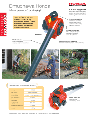 Dmuchawa Honda w 100% oryginalna nowoÊç N E W D E S I G N Masz pewnoÊç pod r´kà! je˝eli tabliczka znamionowa zawiera adres jednej z fabryk Êwiatowego koncernu Honda Honda Technology • • • • • Ergonomiczny uchwyt precyzyjnie wywa˝ony, poch∏aniajàc drgania podnosi komfort obs∏ugi i wyd∏u˝a czas pracy lekka - od 4.5 kg wydajna praca - 360º wysoka sprawnoÊç ekologia - EN2006 ∏atwa obs∏uga Blokada manetki gazu ∏atwo dost´pna dêwignia pozwala na ustawienie sta∏ej si∏y wydmuchu Model HHB25 Sk∏adana dysza ∏atwe przygotowanie do pracy dzi´ki samozaciskom Wyprofilowana pokrywa ssania zmniejsza ryzyko wciàgni´cia odzie˝y roboczej Dmuchawa spalinowa Honda model typ silnika moc silnika HHB25 4-suw Mini GX25 0.81 kW / 1.1KM / 7000 obr./min-1 poj. zbiornika 0.32 litra si∏a ciàgu 70 m / s wydajnoÊç 600 m3 / h praca na zbiorniku ~ 46 min masa 4.50 kg Dystrybucja w Polsce Aries Power Equipment tel. +48(22) 861 43 01 www.ariespower.pl Szybki i ∏atwy start automatyczna dekompresja silnika