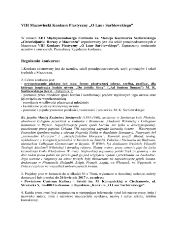 VIII Mazowiecki Konkurs Plastyczny „O Laur Sarbiewskiego” W ramach XIII Międzynarodowego Festiwalu ks. Macieja Kazimierza Sarbiewskiego „Chrześcijański Horacy z Mazowsza” organizowany jest dla szkół ponadpodstawowych z Mazowsza VIII Konkurs Plastyczny „O Laur Sarbiewskiego”. Zapraszamy serdecznie uczniów i nauczycieli. Przesyłamy Regulamin konkursu. Regulamin konkursu: 1.Konkurs skierowany jest do uczniów szkół ponadpodstawowych, czyli gimnazjów i szkół średnich z Mazowsza. 2. Celem konkursu jest: - przygotowanie plakatu lub innej formy plastycznej /obraz, rzeźba, grafika/, dla którego inspiracją będzie utwór „Do źródła Sony” („Ad fontem Sonam”) M. K. Sarbiewskiego (tekst – Załącznik 1) - poznanie przez młodzież epoki baroku i konfrontacji prądów myślowych tego okresu oraz jej związku ze współczesnością - rozwijanie wrażliwości plastycznej młodzieży - kształcenie postawy kreatywnej ucznia - poznanie i popularyzowanie polskości, twórczości i postaci ks. M. K. Sarbiewskiego: Ks. jezuita Maciej Kazimierz Sarbiewski (1595-1640), urodzony w Sarbiewie koło Płońska, absolwent kolegiów jezuickich w Pułtusku i Braniewie, Akademii Wileńskiej i Collegium Romanum w Rzymie. Najwybitniejszy poeta epoki baroku, nie tylko w Rzeczypospolitej, uwieńczony przez papieża Urbana VIII najwyższą nagrodą literacką świata – Wawrzynem Poetyckim (porównywalną z obecną Nagrodą Nobla w dziedzinie literatury). Nazywany był „sarmackim Horacym” i „chrześcijańskim Horacym”. Teoretyk poezji, filozof, teolog, wykładowca w kolegiach jezuickich w Krożach na Żmudzi, Połocku i Nieświeżu na Białrusio, niemieckim Collegium Germanicum w Rzymie. W Wilnie był dziekanem Wydziału Filozofii Teologii Akademii Wileńskiej i doradcą rektora. Słynny orator, przez osttanie pięć lat życia kaznodzieja króla Władysława IV Wazy. Najbardziej popularny polski liryk za granicą – do dziś żaden poeta polski nie prześcignął go pod względem wydań i przekładów na Zachodzie. Jego wiersze i rozprawy na temat poetyki były tłumaczone na najważniejsze języki świata, drukowane w Niemczech, Holandii, Belgii, Francji, Anglii, we Włoszech, na Węgrzech, w Polsce i czytane na wszystkich uniwersytetach świata. 3. Projekty prac w formacie do wielkości 50 x 70cm, wykonane w dowolnej technice, należy dostarczyć lub przesłać do 26 kwietnia 2017 r. na adres: - Powiatowe Centrum Kultury i Sztuki im. M. Konopnickiej w Ciechanowie, ul. Strażacka 5, 06-400 Ciechanów, z dopiskiem „Konkurs „O Laur Sarbiewskiego”. 4. Każda praca musi być zaopatrzona w następujące informacje: tytuł lub nazwę pracy, imię i nazwisko autora, imię i nazwisko nauczyciela opiekuna, nazwę i adres szkoły, telefon kontaktowy. 5. Oceny prac dokona fachowe Jury i przyzna nagrody. Rozstrzygnięcie konkursu nastąpi 13 maja 2017 r., o godz. 17.00, w Powiatowym Centrum Kultury i Sztuki im. M. Konopnickiej w Ciechanowie (Kawiarni Artystycznej), podczas XII Międzynarodowego Festiwalu ks. M. K. Sarbiewskiego „Chrześcijański Horacy z Mazowsza”, w scenerii najlepszych nadesłanych prac (zostanie przygotowana wystawa). 6. Nagrodzone prace konkursowe przechodzą na własność organizatorów, którzy zastrzegają sobie prawo do ich bezpłatnej reprodukcji. Organizatorzy konkursu: - Stowarzyszenie Academia Europaea Sarbieviana, www.sarbiewski.com - Powiatowe Centrum Kultury i Sztuki im. M. Konopnickiej w Ciechanowie, www.pckisz.pl Załącznik 1. W drodze powrotnej z Rzymu, na przełomie lata i jesieni 1625 roku, sławny w Europie, uwieńczony przez papieża Urbana VIII Laurem Poetyckim ks. Maciej Kazimierz Sarbiewski pierwsze swoje kroki skierował do rodzinnej wsi. Zatrzymał się na dłużej w Sarbiewie, w domu urodzenia i pokazał w swojej pieśni, że jest wciąż przywiązany do ziemi mazowieckiej. Urzeczony pięknem kryształowej, skrzącej się Sony (faktycznie Raciążnicy), harmonią jej wód i przyrody, napisał w uniesieniu i w podzięce doskonałemu Stwórcy pieśń Ad fontem Sonam (Do źródła Sony). Ep. 2 DO ŹRÓDŁA SONY Źródło, przejrzystsze niźli szkła kryształy, Czystsze niż czystych śniegów biel wesoła, Rozkoszy, którą Nimfy ukochały, I oczko mego rodzinnego sioła, Znużony długą drogą, z troski brzemion Chcąc się wywikłać, hen z tuskiej aż ziemi Wróciwszy, ciszą tęsknoty oniemion, Na darnie padam nad nurty twojemi. Dozwól tu spocząć i do wklęsłej dłoni Zaczerpnąć wody, niechaj jej nie zmąca Ani bydełko co do zdrojów goni, Ani gałązka z drzewa spadająca. Gdy bełkotaniem rozkosznym słuch bawisz I skacząc, falą ochoczą, świetlaną Potrącasz lekko szemrzących traw klawisz, Niech przykrych szumów topole przestaną I słów słuchają tych: gdy wieszcza mianem Nie darmo Urban mnie darzy uczony, Nad toń Blanduzji bardziej będziesz znanem I bardziej sławnym niż fale Sirmiony. Podczas pobytu w swojej wsi Sarbiewski nawiązał prawdopodobnie kontakt z biskupem płockim Stanisławem Łubieńskim, z którym połączy go później zażyła przyjaźń. Poeta nie zabawił jednak długo w rodzinnym siole. Jeszcze tego samego 1625 roku oddelegowano go do Nieświeża... (fragment książki Teresy Kaczorowskiej „Maciej Kazimierz Sarbiewski SJ na Mazowszu”)