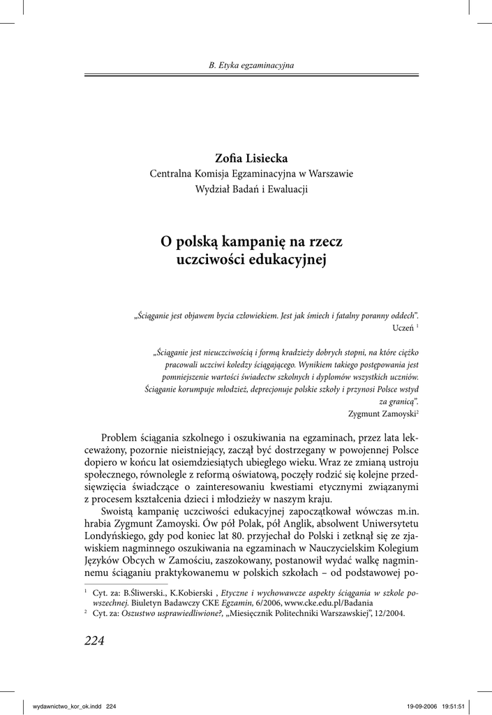 B. Etyka egzaminacyjna Zofia Lisiecka Centralna Komisja Egzaminacyjna w Warszawie Wydział Badań i Ewaluacji O polską kampanię na rzecz uczciwości edukacyjnej „Ściąganie jest objawem bycia człowiekiem. Jest jak śmiech i fatalny poranny oddech”. Uczeń 1 „Ściąganie jest nieuczciwością i formą kradzieży dobrych stopni, na które ciężko pracowali uczciwi koledzy ściągającego. Wynikiem takiego postępowania jest pomniejszenie wartości świadectw szkolnych i dyplomów wszystkich uczniów. Ściąganie korumpuje młodzież, deprecjonuje polskie szkoły i przynosi Polsce wstyd za granicą”. Zygmunt Zamoyski2 Problem ściągania szkolnego i oszukiwania na egzaminach, przez lata lekceważony, pozornie nieistniejący, zaczął być dostrzegany w powojennej Polsce dopiero w końcu lat osiemdziesiątych ubiegłego wieku. Wraz ze zmianą ustroju społecznego, równolegle z reformą oświatową, poczęły rodzić się kolejne przedsięwzięcia świadczące o zainteresowaniu kwestiami etycznymi związanymi z procesem kształcenia dzieci i młodzieży w naszym kraju. Swoistą kampanię uczciwości edukacyjnej zapoczątkował wówczas m.in. hrabia Zygmunt Zamoyski. Ów pół Polak, pół Anglik, absolwent Uniwersytetu Londyńskiego, gdy pod koniec lat 80. przyjechał do Polski i zetknął się ze zjawiskiem nagminnego oszukiwania na egzaminach w Nauczycielskim Kolegium Języków Obcych w Zamościu, zaszokowany, postanowił wydać walkę nagminnemu ściąganiu praktykowanemu w polskich szkołach – od podstawowej po1 2 Cyt. za: B.Śliwerski., K.Kobierski , Etyczne i wychowawcze aspekty ściągania w szkole powszechnej. Biuletyn Badawczy CKE Egzamin, 6/2006, www.cke.edu.pl/Badania Cyt. za: Oszustwo usprawiedliwione?, „Miesięcznik Politechniki Warszawskiej”, 12/2004. 224 wydawnictwo_kor_ok.indd 224 19-09-2006 19:51:51 Zofia Lisiecka, O polską kampanię na rzecz uczciwości edukacyjnej czynając, na zdobywaniu stopni naukowych w szkołach wyższych skończywszy. „Kiedy Amerykański Korpus Pokoju wysyła nauczycieli do Polski, to wcześniej organizuje im specjalny wykład pod tytułem Ściąganie w polskich szkołach, podczas którego mówi się nauczycielom, żeby nie byli zdziwieni tym zjawiskiem, bo to jest normalny sposób postępowania w Polsce [...] Ja z kolei przybyłem do Polski jako Polak – bez pomocy żadnej organizacji, więc nie miałem tej wiedzy na temat ściągania i doznałem szoku”3 – wspominał. Zamoyskiego szczególnie zbulwersowała skala zjawiska oraz natężenie postaw społeczeństwa, przyzwalających na uprawianie oszustwa egzaminacyjnego. Jako nauczyciel akademicki szybko przekonał się, co o ściąganiu myślą polscy studenci. Wielu z nich twierdziło, że sprawdzanie kieszeni w poszukiwaniu ściąg narusza ich godność osobistą, a ściąganie to jeszcze przedwojenny zwyczaj, w gruncie rzeczy niewinny, a w każdym razie „o niskiej szkodliwości społecznej”. Wykładowcy też nie byli zbyt rychliwi w rozprawianiu się z tym procederem. Zamojskie kolegium wprowadziło karanie za ściąganie do swego regulaminu dopiero w roku 1998, w dwa lata po nagłośnieniu sprawy przez media. Zainteresowanie mediów było wówczas spore – o kampanii zaczęły rozpisywać się gazety ogólnopolskie (np. Gazeta Wyborcza, Gazeta Szkolna) i prasa lokalna, temat podjęły też rozgłośnie radiowe i telewizja (Zamoyski był gościem w dwóch audycjach talk show), ale szybko okazało się, że oszustwo egzaminacyjne jest kolejnym tematem „modnym”, a co za tym idzie – okazjonalnym. Za to dość długo dużą popularnością cieszyły się wystawy ściąg i innych przemyślnych „pomocy egzaminacyjnych”, zorganizowane przez Zamoyskiego w muzeum w Kozłówce oraz przez Zygmunta Wiernikowskiego, wykładowcę prawa karnego na Uniwersytecie Warszawskim, w bibliotece UW4. Misja kampanii Zygmunta Zamoyskiego zasadzała się na często cytowanym przekonaniu jego przodka, Jana Zamoyskiego, iż „takie będą Rzeczypospolite, jakie ich młodzieży chowanie”5. Szukanie przyczyn zjawiska uczony zaczął od szkoły i domu rodzinnego ucznia i studenta, w nich upatrując też możliwości naprawy sytuacji. „Jeśli wychowuje się dzieci, ucząc je, że coś fundamentalnie nieuczciwego jest czymś normalnym i naturalnym, to w przyszłości takie wychowanie przyniesie owoc w postaci zepsutego społeczeństwa – co do pewnego stopnia ma miejsce obecnie w Polsce. A jeśli chcemy, by ta sytuacja się zmieniła, to musimy zacząć od początku – to jest w szkole. I jeśli dzieci są wychowywane w poszanowaniu uczciwości, to przy odrobinie szczęścia większość z nich będzie cenić ją w dorosłym życiu”6 – twierdził, dodając, iż 3 4 5 6 Stadnicka L., Co z tym ściąganiem? Wywiad z Zygmuntem Zamoyskim, „Idź pod prąd”, 4(9)/2005, s. 2-5. Szerzej w: Muzeum ściągania, „Gazeta Szkolna” nr 4 (150) z dn. 21 stycznia 2003 r. Cytat z aktu fundacyjnego Akademii Zamoyskiej z 1600 roku. Stadnicka L., op. cit. 225 wydawnictwo_kor_ok.indd 225 19-09-2006 19:51:51 B. Etyka egzaminacyjna uczciwości powinni uczyć „zarówno nauczyciele, jak i rodzice. Oczywiście przede wszystkim rodzice, bo dzieci są pod ich większym wpływem przez o wiele dłuższy okres czasu.”7 Ważnym krokiem w polskiej kampanii na rzecz uczciwości było ogłoszenie w r. 1997 przez CBOS wyników badania, polegającego na ocenie 11 zachowań społecznych. Oto wyniki tego sondażu: Tabela 1. Ocena zachowań społecznych (CBOS, 1997 – badanie na reprezentatywnej próbie 1142 Polaków8) Czy oburza Cię... TAK NIE JESTEM PEWIEN NIE prowadzenie samochodu na lekkim rauszu? 95% 2% 3% spożywanie alkoholu w miejscu pracy? 92% 5% 3% krytykowanie kogoś za jego plecami? 89% 6% 4% bicie dzieci? 87% 8% 5% jazda „na gapę”? 77% 12% 10% fikcyjne darowizny, by zapłacić mniejszy podatek? 67% 16% 17% głośne słuchanie muzyki w miejscach publicznych? 67% 12% 20% oglądanie filmów 