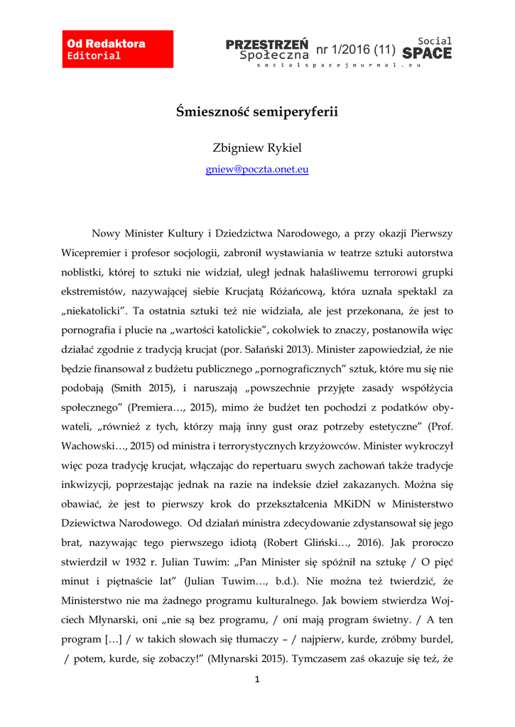 Śmieszność semiperyferii Zbigniew Rykiel [email protected] Nowy Minister Kultury i Dziedzictwa Narodowego, a przy okazji Pierwszy Wicepremier i profesor socjologii, zabronił wystawiania w teatrze sztuki autorstwa noblistki, której to sztuki nie widział, uległ jednak hałaśliwemu terrorowi grupki ekstremistów, nazywającej siebie Krucjatą Różańcową, która uznała spektakl za „niekatolicki”. Ta ostatnia sztuki też nie widziała, ale jest przekonana, że jest to pornografia i plucie na „wartości katolickie”, cokolwiek to znaczy, postanowiła więc działać zgodnie z tradycją krucjat (por. Sałański 2013). Minister zapowiedział, że nie będzie finansował z budżetu publicznego „pornograficznych” sztuk, które mu się nie podobają (Smith 2015), i naruszają „powszechnie przyjęte zasady współżycia społecznego” (Premiera…, 2015), mimo że budżet ten pochodzi z podatków obywateli, „również z tych, którzy mają inny gust oraz potrzeby estetyczne” (Prof. Wachowski…, 2015) od ministra i terrorystycznych krzyżowców. Minister wykroczył więc poza tradycję krucjat, włączając do repertuaru swych zachowań także tradycje inkwizycji, poprzestając jednak na razie na indeksie dzieł zakazanych. Można się obawiać, że jest to pierwszy krok do przekształcenia MKiDN w Ministerstwo Dziewictwa Narodowego. Od działań ministra zdecydowanie zdystansował się jego brat, nazywając tego pierwszego idiotą (Robert Gliński…, 2016). Jak proroczo stwierdził w 1932 r. Julian Tuwim: „Pan Minister się spóźnił na sztukę / O pięć minut i piętnaście lat” (Julian Tuwim…, b.d.). Nie można też twierdzić, że Ministerstwo nie ma żadnego programu kulturalnego. Jak bowiem stwierdza Wojciech Młynarski, oni „nie są bez programu, / oni mają program świetny. / A ten program […] / w takich słowach się tłumaczy – / najpierw, kurde, zróbmy burdel, / potem, kurde, się zobaczy!” (Młynarski 2015). Tymczasem zaś okazuje się też, że 1 socialspacejournal.eu nr 1/2016(11) we współczesnej Polsce, chociaż oczywiście nie tylko tam, można „wyjść z systemu edukacyjnego z tytułem magistra, nie wiedząc, czym jest sztuka” (Bendyk 2015). Nowa premier poparła generalnie linię swego zastępcy, dając odpór szerzeniu pornografii (Komisja etyki…, 2015) i ochoczo podejmując się roli nie tyle recenzentki teatralnej, ile filmowej. Premier oceniła mianowicie surowo polski film, który został ostatnio wyróżniony Oscarem (Beata Szydło…, 2015). Jest to o tyle dziwne, że w programie jej rządu zapowiedziano podjęcie energicznych działań na rzecz promowania kultury polskiej przez inicjatywy zmierzające do pozyskania środowiska hollywoodzkiego dla nakręcenia filmów kulturę tę promującą. Premier najwyraźniej nie zauważyła, że wyróżnienie Oscarem jest najlepszą formą takiej promocji. Działania rządu są częścią większej całości politycznej. Nowy prezydent na początku swego urzędowania ułaskawił bowiem niewinnego człowieka, tyle że swego kolegę partyjnego. Ten ostatni został skazany nieprawomocnym wyrokiem sądu na bezwzględną karę pozbawienia wolności za nadużycie władzy, co było doskonałą rekomendacją dla powołania go na członka rządu. Widać w tym zresztą pewną konsekwencję filozofii politycznej, ułaskawienie przed wyrokiem przypomina bowiem zdjęcie z afisza wspomnianej wyżej sztuki teatralnej przed premierą. Było to zresztą częścią jeszcze większej całości, w ramach której nowy prezydent złamał trzykrotnie konstytucję w ciągu czterech miesięcy swego urzędowania, jego środowisko polityczne zaś sześciokrotnie (Siedlecka 2015), ustanawiając trudny do pobicia rekord Europy oraz narażając się na publiczną krytykę wydziałów prawa czołowych polskich uniwersytetów (Stanowisko pracowników…, 2015), w tym swego własnego (Uchwała…, 2015), oraz promotora swej pracy doktorskiej (Promotor…, 2015). Środowisko polityczne prezydenta po wygranych przez siebie wyborach parlamentarnych postanowiło w ramach sprawiedliwości ludowej wprowadzić w życie program Jana Jakuba Rousseau, polegający na unieważnieniu całego dotychczasowego porządku prawnego i zastąpienia go wolą ludu jako najwyższego suwerena, przy czym emanacją tego ludu miała być partia, na którą nie głosowało 81% obywateli. 2 Rykiel Z.: Śmieszność semiperyferii Wszystkie te zjawiska można uznać za groźne, raczej jednak za śmieszne, a zwłaszcza kuriozalne. Są one, jak można sądzić, przejawem mentalności semiperyferyjnej oraz takichż frustracji i kompleksów, tym bardziej że nowa większość parlamentarna zdobyła władzę po ośmiu kolejnych przegranych wyborach. Wpisuje się to w zjawisko zderzenia cywilizacji, tyle że w ramach jednego narodu. Zbigniew Mikołejko twierdzi (Kowalska 2015), że grupy i kategorie społeczne, których interesy zdaje się reprezentować obecny rząd, to schodzący ze sceny dziejowej zaściankowi tradycjonaliści, którzy lęk przed swym schyłkiem manifestują łabędzim śpiewem, a raczej – jak można sądzić – rykiem rannego zwierza przed agonią. Marek Jerzy Minakowski (2014) wskazuje natomiast, że może to być częścią znacznie większej całości, a mianowicie rewolucji społecznej, która – po raz pierwszy od połowy XIX wieku – dokonała się w Polsce dopiero w 1990 r. Była to rewolucja – dopuszczonej w tym czasie na masową skalę do szkolnictwa wyższego – klasy chłopskiej, a co najmniej warstw plebejskich, przeciwko etosowi inteligenckiemu, którego nosicielami byli potomkowie drobnej szlachty i słabego mieszczaństwa polskiego. Przez cały wiek dwudziesty inteligencja reprodukowała się zgodnie ze schematem Pierre’a Bourdieu przez swój habitus, do którego adaptowały się także elity reżimu komunistycznego. Tę adaptację należy jednak rozpatrywać w kontekście historycznym. „W czasie okupa