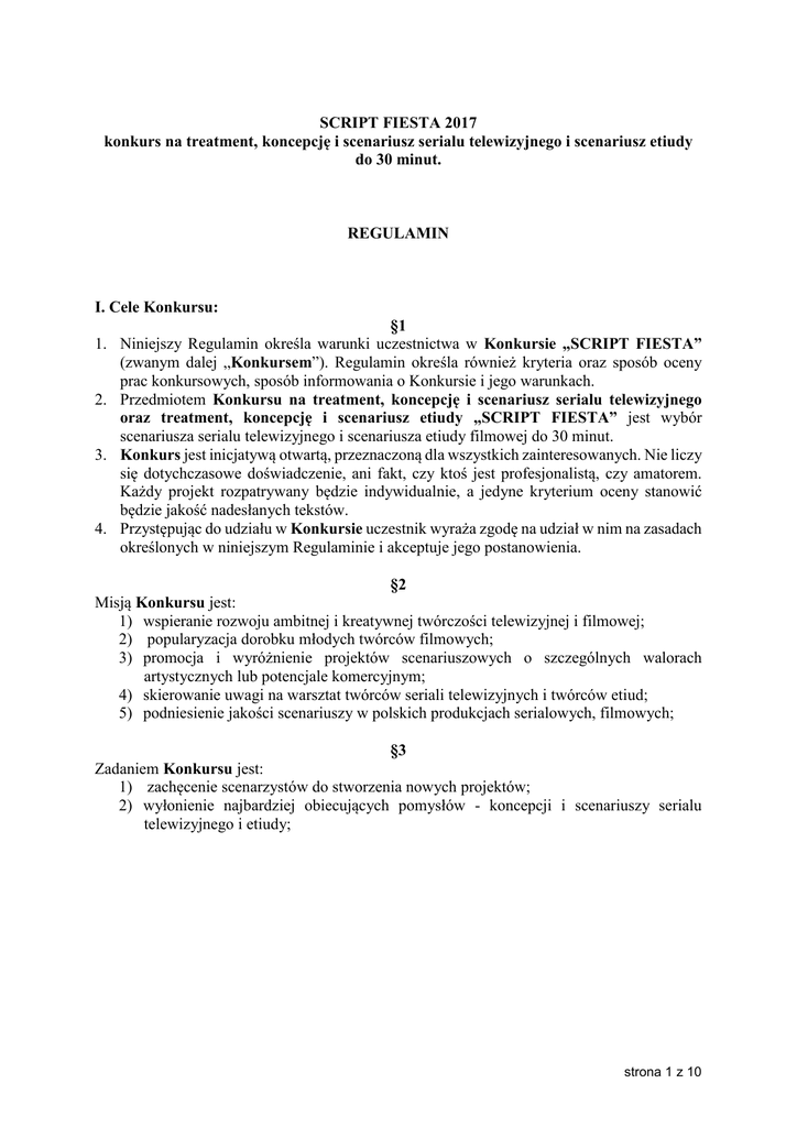 SCRIPT FIESTA 2017 konkurs na treatment, koncepcję i scenariusz serialu telewizyjnego i scenariusz etiudy do 30 minut. REGULAMIN I. Cele Konkursu: 1. 2. 3. 4. §1 Niniejszy Regulamin określa warunki uczestnictwa w Konkursie „SCRIPT FIESTA” (zwanym dalej „Konkursem”). Regulamin określa również kryteria oraz sposób oceny prac konkursowych, sposób informowania o Konkursie i jego warunkach. Przedmiotem Konkursu na treatment, koncepcję i scenariusz serialu telewizyjnego oraz treatment, koncepcję i scenariusz etiudy „SCRIPT FIESTA” jest wybór scenariusza serialu telewizyjnego i scenariusza etiudy filmowej do 30 minut. Konkurs jest inicjatywą otwartą, przeznaczoną dla wszystkich zainteresowanych. Nie liczy się dotychczasowe doświadczenie, ani fakt, czy ktoś jest profesjonalistą, czy amatorem. Każdy projekt rozpatrywany będzie indywidualnie, a jedyne kryterium oceny stanowić będzie jakość nadesłanych tekstów. Przystępując do udziału w Konkursie uczestnik wyraża zgodę na udział w nim na zasadach określonych w niniejszym Regulaminie i akceptuje jego postanowienia. §2 Misją Konkursu jest: 1) wspieranie rozwoju ambitnej i kreatywnej twórczości telewizyjnej i filmowej; 2) popularyzacja dorobku młodych twórców filmowych; 3) promocja i wyróżnienie projektów scenariuszowych o szczególnych walorach artystycznych lub potencjale komercyjnym; 4) skierowanie uwagi na warsztat twórców seriali telewizyjnych i twórców etiud; 5) podniesienie jakości scenariuszy w polskich produkcjach serialowych, filmowych; §3 Zadaniem Konkursu jest: 1) zachęcenie scenarzystów do stworzenia nowych projektów; 2) wyłonienie najbardziej obiecujących pomysłów - koncepcji i scenariuszy serialu telewizyjnego i etiudy; strona 1 z 10 II. Formuła Konkursu: §4 1. Organizatorami Konkursu są: 1) Warszawska Szkoła Filmowa - Uczelnia, z siedzibą przy ul. Generała Zajączka, 7, 01518 Warszawa, NIP: 525-251-78-28, REGON: 145821227, 2) Fundacja Edukacji i Sztuki Filmowej Macieja Ślesickiego i Bogusława Lindy LATERNA MAGICA z siedzibą: 01-518 Warszawa, ul. Generała Zajączka 7, wpisana do Krajowego Rejestru Sądowego przez Sąd Rejonowy dla m. st. Warszawy, XIII Wydział Gospodarczy Krajowego Rejestru Sądowego pod numerem KRS 0000196575, numer NIP: 123-101-38-88, REGON: 015678489; zwani dalej, na potrzeby niniejszego regulaminu, Organizatorami. 2. Sponsorami Nagród w Konkursie, jest Warszawska Szkoła Filmowa - Uczelnia i Fundacja Edukacji i Sztuki Filmowej Macieja Ślesickiego i Bogusława Lindy LATERNA MAGICA. 3. Konkurs organizowany jest na obszarze Rzeczypospolitej Polskiej, w okresie od dnia 13 stycznia 2017 roku do dnia 8 kwietnia 2017 roku. §5 Wszelkie autorskie prawa majątkowe do formuły i koncepcji artystycznej Konkursu posiadają Organizatorzy. §6 Za całość spraw związanych z przygotowaniem i przebiegiem Konkursu odpowiedzialny jest Koordynator Organizacyjny, powoływany przez Organizatorów i Partnera, posiadający decydujący głos w kwestiach spornych, nieobjętych regulaminem lub wymagających dodatkowych interpretacji. §7 Organizatorzy mogą zaprosić do współudziału w organizacji Konkursu inne jednostki państwowe, społeczne i prywatne, które zamierzają wnieść swój rzeczowy lub finansowy wkład w przygotowanie i realizację Konkursu. §8 W kwestiach nieuregulowanych niniejszym Regulaminem zastosowanie będą miały przepisy kodeksu cywilnego, ustawy o prawie autorskim i prawach pokrewnych oraz inne powszechnie obowiązujące przepisy prawa. III. Zasady uczestnictwa - wstęp §9 1. Konkurs podzielony jest na 2 kategorie: 1) Kategoria 1 - Koncepcja serialu telewizyjnego; 2) Kategoria 2 - Scenariusz etiudy filmowej do 30 minut. 2. Kategoria 1 – Koncepcja serialu telewizyjnego podzielona jest dodatkowo na dwa etapy: ogólny i finałowy: 1) W I etapie Konkursu każdy Uczestnik może nadesłać dowolną liczbę koncepcji serialu telewizyjnego. strona 2 z 10 2) Do II etapu Konkursu zostaną zaproszeni wyłącznie zwycięzcy I etapu („Finaliści”) w liczbie od 3 do 10 finalistów. 3. Kategoria 2 – Scenariusz etiudy filmowej do 30 minut jest jednoetapowa. §10 1. Poprzez koncepcję serialu telewizyjnego rozumie się dokument liczący od 5 do 10 stron, sporządzony na przygotowanym przez Organizatorów szablonie, zawierający: 1) tytuł serialu; 2) ogólne założenia serialu telewizyjnego (gatunek, długość odcinka, ilość odcinków w sezonie, zakładana grupa docelowa); 3) opis pomysłu na serial telewizyjny - 3 zdania; 4) zarys głównych postaci - po 500 znaków ze spacjami o każdej z postaci; 5) treatment pierwszego odcinka - maksymalnie 1800 znaków ze spacjami; 6) zarys fabularny pierwszego sezonu - maksymalnie 1800 znaków ze spacjami; 7) trzy kompletne sceny dialogowe z odcinka pilotowego napisane w formacie scenariusza filmowego. 2. Uczestnik konkursu może nadesłać dowolną ilość koncepcji. §11 1. Poprzez scenariusz etiudy filmowej rozumie się dokument sporządzony na przygotowanym przez Organizatorów szablonie, zawierający: 1) 2) 3) 4) Okładkę z tytułem etiudy; gatunek, logline; streszczenie na jedną stronę (maks. 1800 znaków ze spacjami) scenariusz liczący maksymalnie do 30 stron 2. Uczestnik konkursu może nadesłać dowolną ilość koncepcji. §12 Koncepcje serialu telewizyjnego i scenariusz etiudy filmowej do udziału w Konkursie mogą zgłaszać wyłącznie osoby fizyczne (zwane dalej Uczestnikiem), które w dniu przystąpienia do Konkursu posiadają pełną zdolność do czynności prawnych oraz pełne prawo do dysponowania zgłaszanym tekstem. W Konkursie mogą wziąć udział również zespoły osób, dokonujące zgłoszenia jako jeden uczestnik (zbiorowy). W takim przypadku osoby te traktowane będą jako współtwórcy zgłoszonych do udziału w Konkursie tekstów. §13 Organizatorzy nie ponoszą odpowiedzialności za koncepcje seriali telewizyjnych i scenariusze etiud filmowych, które nie dota
