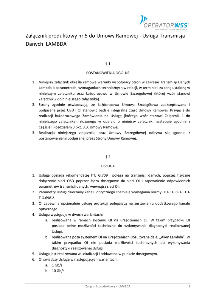Załącznik produktowy nr 5 do Umowy Ramowej - Usługa Transmisja Danych LAMBDA §1 POSTANOWIENIA OGÓLNE 1. Niniejszy załącznik określa ramowe warunki współpracy Stron w zakresie Transmisji Danych Lambda o parametrach, wymaganiach technicznych w relacji, w terminie i za cenę ustaloną w niniejszym załączniku oraz każdorazowo w Umowie Szczegółowej (której wzór stanowi Załącznik 2 do niniejszego załącznika). 2. Strony zgodnie oświadczają, że każdorazowa Umowa Szczegółowa zaakceptowana i podpisana przez OSD i OI stanowić będzie integralną część Umowy Ramowej. Przyjęcie do realizacji każdorazowego Zamówienia na Usługę (którego wzór stanowi Załącznik 1 do niniejszego załącznika), złożonego w oparciu o niniejszy załącznik, następuje zgodnie z Częścią I Rozdziałem 3 pkt. 3.3. Umowy Ramowej. 3. Realizacja niniejszego załącznika oraz Umowy Szczegółowej odbywa się zgodnie z postanowieniami podpisanej przez Strony Umowy Ramowej. §2 USŁUGA 1. Usługa posiada rekomendację ITU G.709 i polega na transmisji danych, poprzez fizyczne dołączenie sieci OSD poprzez łącza dostępowe do sieci OI i zapewnienie odpowiednich parametrów transmisji danych, wewnątrz sieci OI. 2. Parametry Usługi dzierżawy kanału optycznego spełniają wymagania normy ITU-T G.694, ITUT G.698.2. 3. OI zapewnia opcjonalnie usługę protekcji polegającą na zestawieniu dodatkowego kanału optycznego. 4. Usługa występuje w dwóch wariantach: a. realizowana w ramach systemu OI na urządzeniach OI. W takim przypadku OI posiada pełne możliwości techniczne do wykonywania diagnostyki realizowanej Usługi, b. realizowana poza systemem OI na Urządzeniach OSD, zwana dalej „Alien Lambda”. W takim przypadku OI nie posiada możliwości technicznych do wykonywania diagnostyki realizowanej Usługi. 5. Usługa jest realizowana w Lokalizacji i oddawana w punkcie dostępowym. 6. OI świadczy Usługę w następujących wariantach: a. 1 Gb/s b. 10 Gb/s Załącznik produktowy - LAMBDA 1 §3 OPŁATY 1. Opłaty związane z Transmisją danych – Lambda UMOWA TERMINOWA od 12 do 23 MIESIĘCY - SLA STANDARD PRZEPUSTOWOŚĆ OPŁATA JEDNORAZOWA [PLN] OPŁATA ABONAMENTOWA [PLN] 1 Gb/s 2 000 1 800 10 Gb/s 2 000 3 800 Alien Lambda 2 000 4 000 Usługa protekcji Dopłata 40 % do abonamentu 2. Opłaty związane z Transmisją danych - Lambda w SLA TOP SLA TOP (6h) UMOWA TERMINOWA SLA TOP Dopłata 15% do opłat abonamentowych OI OSD ………………………………………………………. …………………………………………………… (data i podpis) (data i podpis) ZAŁĄCZNIKI: Załącznik 1 - Zamówienie na usługę Transmisja Danych – Lambda Załącznik 2 - Wzór Umowy Szczegółowej Załącznik 3 - Protokół zdawczo-odbiorczy Załącznik produktowy - LAMBDA 2 Załącznik 1 – Zamówienie na usługę Transmisja Danych – Lambda Nr ........................... Zamówienie z dnia ......................... Nazwa OSD Adres siedziby Udostępniający OI Do Umowy Ramowej Nowe zamówienie Przedłużenie okresu obowiązywania PRZEDMIOT ZAMÓWIENIA Rodzaj łącza (przepustowość, rodzaj wkładek) Lp. Relacja Lokalizacja A Lokalizacja B Termin oddania Usługi CZAS OBOWIĄZYWANIA UMOWY 1 rok 2 lata Inny:…………… SLA: Wariant Standard Wariant TOP UWAGI Podpis(y) upoważnionego przedstawiciela OSD Imię i nazwisko Data Podpis i pieczątka firmowa Załącznik produktowy - LAMBDA 3 Załącznik 2 – Wzór Umowy Szczegółowej Nr ........................... Zamówienie z dnia ......................... Nazwa OSD Adres siedziby Wydzierżawiający OI Do Umowy Ramowej Nowe zamówienie Przedłużenie okresu obowiązywania PRZEDMIOT UMOWY Rodzaj łącza (przepustowość, rodzaj wkładek) Lp Relacja Lokalizacja A Lokalizacja B Termin oddania Usługi CZAS OBOWIĄZYWANIA UMOWY 1 rok 2 lata Inny: …………………………………... SLA: Wariant Standard Wariant TOP OPŁATY Lp Usługa Opłaty jednorazowe netto Opłaty miesięczne netto UWAGI Podpisy przedstawicieli Stron OSD Imię i nazwisko OI Data Imię i nazwisko Podpis i pieczątka firmowa Data Podpis i pieczątka firmowa Załącznik produktowy - LAMBDA 4 Załącznik 3 – Protokół zdawczo-odbiorczy Nazwa OSD Adres siedziby Wydzierżawiający OI Do Umowy Szczegółowej Nr ........................... Lp Rodzaj łącza (przepustowość, rodzaj wkładek) z dnia ......................... Relacja Lokalizacja A Lokalizacja B Data rozpoczęcia świadczenia Usługi UWAGI Podpisy przedstawicieli Stron OSD Imię i nazwisko OI Data Imię i nazwisko Podpis i pieczątka firmowa Data Podpis i pieczątka firmowa Załącznik produktowy - LAMBDA 5