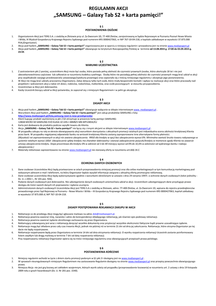 REGULAMIN AKCJI „SAMSUNG – Galaxy Tab S2 + karta pamięci!” §1 POSTANOWIENIA OGÓLNE 1. 2. 3. Organizatorem Akcji jest TERG S.A. z siedzibą w Złotowie przy ul. Za Dworcem 1D, 77-400 Złotów, zarejestrowaną w Sądzie Rejonowym w Poznaniu Poznań Nowe Miasto i Wilda, IX Wydział Gospodarczy Krajowego Rejestru Sądowego pod numerem KRS 0000427063, nr NIP 767-10-04-218, o kapitale zakładowym w wysokości 37.875.000 PLN,(Organizator). Akcja pod hasłem „SAMSUNG – Galaxy Tab S2 + karta pamięci!” organizowana jest w oparciu o niniejszy regulamin i prowadzona jest na stronie www.mediaexpert.pl Akcja pod hasłem „SAMSUNG – Galaxy Tab S2 + karta pamięci!” obowiązuje na terytorium Rzeczpospolitej Polskiej w terminie od 13.08.2015 g. 17:00 do 03.09.2015 g. 23:59. §2 WARUNKI UCZESTNICTWA 1. 2. 3. 4. Z zastrzeżeniem pkt.2 poniżej, uczestnikiem Akcji może być osoba, która posiada pełną zdolność do czynności prawnych (osoba, która ukończyła 18 lat i nie jest ubezwłasnowolniona częściowo lub całkowicie w rozumieniu kodeksu cywilnego. Osoby które nie posiadają pełnej zdolności do czynności prawnych mogą brać udział w akcji przy współudziale swojego przedstawiciela ustawowego/opiekuna prawnego) oraz zapoznała się z treścią niniejszego regulaminu i akceptuje jego postanowienia; W Akcji nie mogą brać udziału pracownicy Organizatora. Zakaz dotyczy tylko tych osób, które miały bezpośredni kontakt i wpływ na realizacje akcji oraz które pracowały nad projektem i wdrożeniem akcji a także ich dzieci, rodziców, rodzeństwa, małżonków, oraz osób pozostających w stosunku przysposobienia. Uczestnictwo w Akcji jest dobrowolne. Każdy Uczestnik biorący udział w Akcji potwierdza, że zapoznał się z niniejszym Regulaminem i w pełni go akceptuje. §3 ZASADY AKCJI 1. 2. 3. 4. 5. 6. 7. Akcja pod hasłem „SAMSUNG – Galaxy Tab S2 + karta pamięci!” obowiązuje wyłącznie w sklepie internetowym www. mediaexpert.pl . Warunkiem Akcji pod hasłem „SAMSUNG – Galaxy Tab S2 + karta pamięci!” jest zakup produktów SAMSUNG z listy: http://www.mediaexpert.pl/lista,samsung-next-is-now-przedsprzedaz Klient kupując produkt wymieniony w pkt 2 §3 otrzymuje w prezencie kartę pamięci SAMSUNG: 128GB MICRO SD SAMSUNG EVO KLASA 10 UHS-I 48MB/S MB-MP128DA/EU Karta jest dodawana do produktu podczas wysyłki towaru do klienta. Akcja „SAMSUNG – Galaxy Tab S2 + karta pamięci!” nie łączy się z innymi akcjami w sklepie internetowym www.mediaexpert.pl . W przypadku zakupu na raty w okresie obowiązywania akcji warunkiem skorzystania z aktualnych promocji ratalnych jest indywidualna ocena zdolności kredytowej Klienta przez bank. W przypadku negatywnej odpowiedzi banku na wniosek kredytowy Klienta zostaną zaproponowane inne alternatywne formy płatności. (Wysokość rat zaprezentowanych w akcji nie zawiera ubezpieczenia. RRSO dla kredytu w opcji bez ubezpieczenia wynosi 0%. Minimalna wartość brutto towaru nabywanego w systemie ratalnym wynosi 100zł. Ubezpieczenie spłaty kredytu ma charakter dobrowolny i stanowi zabezpieczenie pożyczki/kredytu w momencie zgody Klienta na zawarcie umowy ubezpieczenia kredytu. Stopa procentowa dla kredytu 0% w zakresie od 3 do 40 miesięcy wynosi od 0% do 32,6% w zależności od wybranego banku i rodzaju ubezpieczenia.) Materiały reklamowe zaprezentowane na stronie www.mediaexpert.pl nie stanowią oferty w rozumieniu art.66§ 1K.C §4 OCHRONA DANYCH OSOBOWYCH 1. 2. 3. 4. Dane osobowe Uczestników Akcji będą przetwarzane w celach przeprowadzenia niniejszej promocji oraz dla celów marketingowych w tym komunikację marketingową pod wskazanym adresem e-mail i telefonem, na który Organizator będzie wysyłał informacje związane z aktualną ofertą promocyjno-reklamową. Dane osobowe uczestników Akcji będą wykorzystywane zgodnie z warunkami określonymi w ustawie z dnia 29 sierpnia 1997r. o ochronie danych osobowych (tekst jednolity : Dz. U. z 2002 r., Nr 101 poz. 926). Podanie danych osobowych jest dobrowolne. Nie udostępnienie danych osobowych uniemożliwia udział w akcji. Uczestnikom udostępniającym dane przysługuje prawo dostępu do treści swoich danych ich poprawiania i żądania usunięcia. Administratorem danych osobowych Uczestników Akcji jest TERG S.A z siedzibą w Złotowie, adres: 77-400 Złotów, ul. Za Dworcem 1D, wpisana do rejestru przedsiębiorców prowadzonego przez Sąd Rejonowy w Poznaniu - Nowe Miasto i Wilda – IX Gospodarczy Krajowego Rejestru Sądowego pod numerem KRS 0000427063, kapitał zakładowy w wysokości 37 875.000 zł, NIP 767-10-04-218. §5 ZASADY POSTĘPOWANIA REKLAMACJI ZAKUPU W AKCJI 1. 2. 3. 4. 5. 6. 7. Reklamacje co do przebiegu Akcji mogą być zgłaszane mailowo na adres [email protected]. Reklamacja powinna zawierać imię, nazwisko i adres do korespondencji składającego reklamację, jak również opis podstawy reklamacji. Reklamacja powinna zawierać żądanie określonego zachowania się przez Organizatora. Reklamujący zobowiązany jest wraz z reklamacją doręczyć wszelkie dokumenty oraz przytoczyć wszystkie okoliczności faktyczne bądź prawne uzasadniające żądanie. Reklamacje mogą być składane przez cały czas trwania Akcjii, jednak nie później niż w terminie 21 dni od dnia jej zakończenia. Reklamacje, które otrzyma Organizator po tej dacie nie będą rozpatrywane. Reklamacje rozpatrywane będą przez Organizatora w terminie 14 dni od dnia otrzymania reklamacji. O wyniku rozpatrzenia reklamacji Uczestnik zostanie poinformowany listem zwykłym lub drogą mailową w terminie 7 dni od daty rozpatrzenia reklamacji. Przy rozpatrywaniu reklamacji Organizator opiera się na treści niniejszego regulaminu oraz obowiązujących przepisach prawa polskiego. §6 POSTANOWIENIA KOŃCOWE 1. 2. 3. Niniejszy regulamin wchodzi w życie z dniem startu promocji podanym w §1 pkt.3 i dostępny jest na www.mediaexpert.pl . W sprawach nieuregulowanych niniej