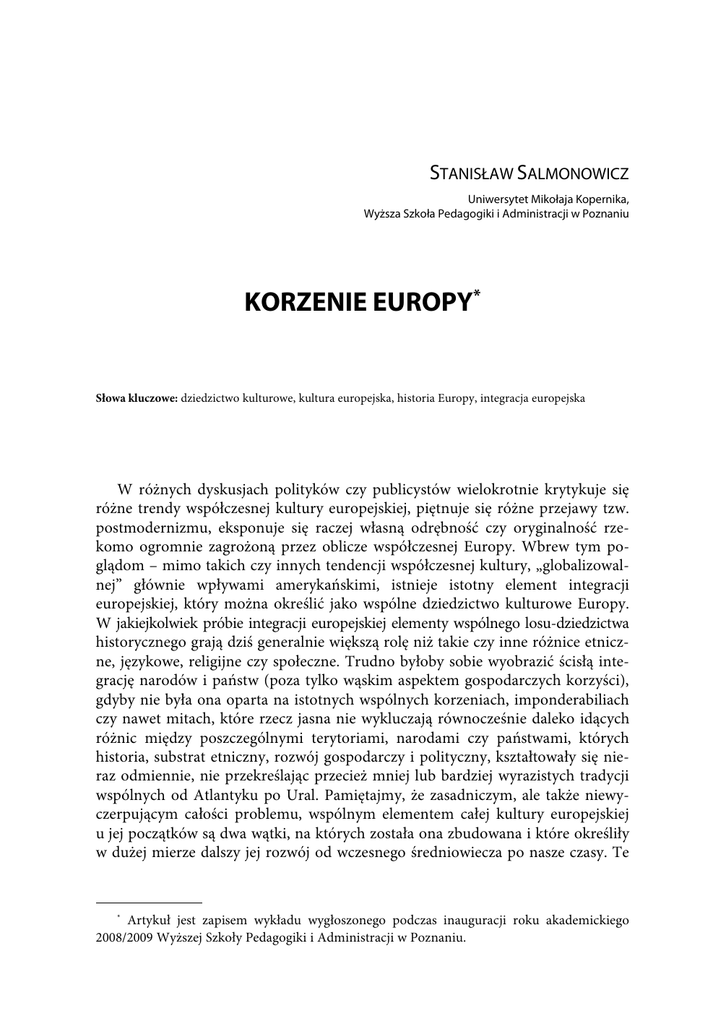 STANISŁAW SALMONOWICZ Uniwersytet Mikołaja Kopernika, Wyższa Szkoła Pedagogiki i Administracji w Poznaniu KORZENIE EUROPY* Słowa kluczowe: dziedzictwo kulturowe, kultura europejska, historia Europy, integracja europejska W różnych dyskusjach polityków czy publicystów wielokrotnie krytykuje się różne trendy współczesnej kultury europejskiej, piętnuje się różne przejawy tzw. postmodernizmu, eksponuje się raczej własną odrębność czy oryginalność rzekomo ogromnie zagrożoną przez oblicze współczesnej Europy. Wbrew tym poglądom – mimo takich czy innych tendencji współczesnej kultury, „globalizowalnej” głównie wpływami amerykańskimi, istnieje istotny element integracji europejskiej, który można określić jako wspólne dziedzictwo kulturowe Europy. W jakiejkolwiek próbie integracji europejskiej elementy wspólnego losu-dziedzictwa historycznego grają dziś generalnie większą rolę niż takie czy inne różnice etniczne, językowe, religijne czy społeczne. Trudno byłoby sobie wyobrazić ścisłą integrację narodów i państw (poza tylko wąskim aspektem gospodarczych korzyści), gdyby nie była ona oparta na istotnych wspólnych korzeniach, imponderabiliach czy nawet mitach, które rzecz jasna nie wykluczają równocześnie daleko idących różnic między poszczególnymi terytoriami, narodami czy państwami, których historia, substrat etniczny, rozwój gospodarczy i polityczny, kształtowały się nieraz odmiennie, nie przekreślając przecież mniej lub bardziej wyrazistych tradycji wspólnych od Atlantyku po Ural. Pamiętajmy, że zasadniczym, ale także niewyczerpującym całości problemu, wspólnym elementem całej kultury europejskiej u jej początków są dwa wątki, na których została ona zbudowana i które określiły w dużej mierze dalszy jej rozwój od wczesnego średniowiecza po nasze czasy. Te * Artykuł jest zapisem wykładu wygłoszonego podczas inauguracji roku akademickiego 2008/2009 Wyższej Szkoły Pedagogiki i Administracji w Poznaniu. 20 Homines Hominibus nr 1(4) 2008 dwa głównie wątki to kultura antyku śródziemnomorskiego i rola chrześcijaństwa. Zasadnicze więc znaczenie miał fakt, iż kultura europejska jest dziedzicem kręgu śródziemnomorskiego epoki antyku i dziedzicząc rozmaite szczegółowe tradycje (Egipt, Mała Azja, a w szczególności religia i kultura starożytnego Izraela – pierwszy monoteizm w kręgu kultury europejskiej) – nade wszystko jest dziedzicem z jednej strony wspaniałego dorobku kultury grecko-rzymskiej, którą tylko Europa w lwiej części przechowała i kontynuowała, oraz narodzin chrześcijaństwa, drugiej wielkiej religii monoteistycznej, które wraz z dorobkiem antycznej filozofii stworzyły podstawy europejskiej aksjologii. Jeżeli mowa o znaczeniu procesu chrystianizacji dla dziejów Europy, to należy podkreślić, iż w ostatecznym rezultacie chodzi o swego rodzaju etyczny rdzeń nauczania Kościołów chrześcijańskich, które zarówno w zachowujących swoją nieprzerwaną ciągłość historyczną tzw. Kościołach wschodnich, jak i w Kościele rzymsko-katolickim (czy w rozmaitych wyznaniach protestanckich) ów rdzeń w pełni respektują i nie pozostał on także bez wpływu na różne etyczny koncepcje laickie. Wspólny dorobek Europy Zachodniej, w tym względzie wywodzący się z tych korzeni antycznochrześcijańskich, to m.in. tradycja prawa rzymskiego i rola prawa kanonicznego, kolejne wielkie style budownictwa i sztuk plastycznych od romanizmu po renesans, barok, neoklasycyzm, to wielkie dziedzictwo zabytkowej Europy: klasztory, katedry, zamki, pałace. Europa i jej kultura były więc budowane z pierwiastków o różnej terytorialnej i etnicznej proweniencji. Budowane były także nie tylko przez ludy śródziemnomorskie, ale następnie, w sporej mierze, także przez ludy, które głównie dzięki Kościołom chrześcijańskim weszły w orbitę tej kultury z pewnym opóźnieniem, jak ludy germańskie, rozmaitego pochodzenia ludność półwyspu bałkańskiego i skandynawskiego, terytoriów rosyjskich, Słowian ogarniających znaczną część Europy, czy ludność pochodzenia ugrofińskiego. Jest rzeczą jasną, iż rozpowszechnianie się wspólnej tożsamości europejskiej było procesem skomplikowanym, niewolnym od sprzecznych tendencji, a szło w parze, czy nawet w przeciwstawieniu się rozwojowi daleko idących odrębności, które miały swoje źródło zarówno w odrębnych tradycjach etnicznych, bądź odmiennym losie historycznym, a zwłaszcza, co dziś wbrew pozorom może widać wyraźnie po upadku komunizmu, także w odmiennych losach wyznaniowych (religijnych) danego narodu czy danego terytorium. Stąd potężna okresami siła ogólnych tradycji europejskich (z czasem niwelująca – jestem o niej przekonany), pozostawała jednakże stale w konfrontacji z regionalnymi sytuacjami. Dodać tu można jako element istotny do dziś, iż wedle uprawnionego poglądu wielu historyków można mówić, że już od końca średniowiecza, czy ewentualnie od końca wieku XVI rysowała się na mapach rozwoju ekonomicznego i cywilizacyjnego swego rodzaju „Europa trzech prędkości”, co schematycznie można w pewnym uproszczeniu ukazać jako podział na trzy Europy, idąc od brzegów Atlantyku po Ural: Stanisław Salmonowicz – Korzenie Europy 21 a) Europa pierwsza – od Atlantyku po symboliczną linię rzeki Łaby była Europą, która najwcześniej się modernizowała, która najwcześniej budowała kapitalizm i likwidowała najszybciej stosunki feudalne w rolnictwie; b) Europa druga – od Łaby po bodaj rzekę Bug lub po wschodnie rubieże dawnej Rzeczypospolitej polsko-litewskiej, to kraj względnego zacofania cywilizacyjnego, tzw. folwarku pańszczyźnianego, późnych narodzin rewolucji przemysłowej; c) Trzecia Europa to głównie terytoria imperium rosyjskiego i kraje bałkańskie, czyli krainy, które pod rządami Turków, bądź w ramach imperium