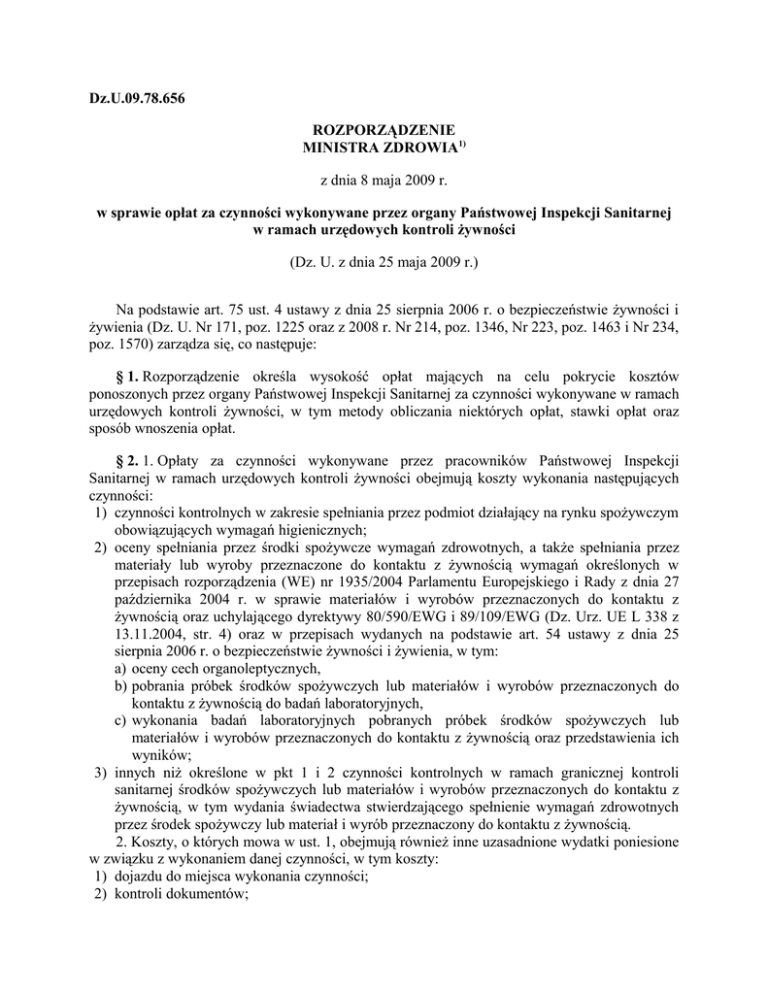 Dz.U.09.78.656 ROZPORZĄDZENIE MINISTRA ZDROWIA1) z dnia 8 maja 2009 r. w sprawie opłat za czynności wykonywane przez organy Państwowej Inspekcji Sanitarnej w ramach urzędowych kontroli żywności (Dz. U. z dnia 25 maja 2009 r.) Na podstawie art. 75 ust. 4 ustawy z dnia 25 sierpnia 2006 r. o bezpieczeństwie żywności i żywienia (Dz. U. Nr 171, poz. 1225 oraz z 2008 r. Nr 214, poz. 1346, Nr 223, poz. 1463 i Nr 234, poz. 1570) zarządza się, co następuje: § 1. Rozporządzenie określa wysokość opłat mających na celu pokrycie kosztów ponoszonych przez organy Państwowej Inspekcji Sanitarnej za czynności wykonywane w ramach urzędowych kontroli żywności, w tym metody obliczania niektórych opłat, stawki opłat oraz sposób wnoszenia opłat. § 2. 1. Opłaty za czynności wykonywane przez pracowników Państwowej Inspekcji Sanitarnej w ramach urzędowych kontroli żywności obejmują koszty wykonania następujących czynności: 1) czynności kontrolnych w zakresie spełniania przez podmiot działający na rynku spożywczym obowiązujących wymagań higienicznych; 2) oceny spełniania przez środki spożywcze wymagań zdrowotnych, a także spełniania przez materiały lub wyroby przeznaczone do kontaktu z żywnością wymagań określonych w przepisach rozporządzenia (WE) nr 1935/2004 Parlamentu Europejskiego i Rady z dnia 27 października 2004 r. w sprawie materiałów i wyrobów przeznaczonych do kontaktu z żywnością oraz uchylającego dyrektywy 80/590/EWG i 89/109/EWG (Dz. Urz. UE L 338 z 13.11.2004, str. 4) oraz w przepisach wydanych na podstawie art. 54 ustawy z dnia 25 sierpnia 2006 r. o bezpieczeństwie żywności i żywienia, w tym: a) oceny cech organoleptycznych, b) pobrania próbek środków spożywczych lub materiałów i wyrobów przeznaczonych do kontaktu z żywnością do badań laboratoryjnych, c) wykonania badań laboratoryjnych pobranych próbek środków spożywczych lub materiałów i wyrobów przeznaczonych do kontaktu z żywnością oraz przedstawienia ich wyników; 3) innych niż określone w pkt 1 i 2 czynności kontrolnych w ramach granicznej kontroli sanitarnej środków spożywczych lub materiałów i wyrobów przeznaczonych do kontaktu z żywnością, w tym wydania świadectwa stwierdzającego spełnienie wymagań zdrowotnych przez środek spożywczy lub materiał i wyrób przeznaczony do kontaktu z żywnością. 2. Koszty, o których mowa w ust. 1, obejmują również inne uzasadnione wydatki poniesione w związku z wykonaniem danej czynności, w tym koszty: 1) dojazdu do miejsca wykonania czynności; 2) kontroli dokumentów; 3) wysłania próbek do badań laboratoryjnych; 4) kontroli prawidłowości procesów technologicznych, warunków produkcji, magazynowania i transportu środków spożywczych lub materiałów i wyrobów przeznaczonych do kontaktu z żywnością. § 3. Koszty czynności, o których mowa w § 2, są ustalane na podstawie kosztów bezpośrednich i pośrednich obliczanych zgodnie z przepisami w sprawie opłat za badania laboratoryjne oraz inne czynności wykonywane przez organy Państwowej Inspekcji Sanitarnej. § 4. Stawka opłaty za wykonanie czynności, o których mowa w § 2 ust. 1 pkt 1, obejmuje: 1) stawkę ryczałtową z tytułu przeprowadzenia czynności kontrolnych - 45 zł oraz 2) stawkę ryczałtową za każdą rozpoczętą godzinę przeprowadzenia czynności kontrolnych - 15 zł. § 5. 1. Stawki opłat za wykonanie czynności, o których mowa w § 2 ust. 1 pkt 2, dotyczących jednego środka spożywczego lub materiału i wyrobu przeznaczonego do kontaktu z żywnością wynoszą: 1) ocena cech organoleptycznych - 8 zł; 2) prawidłowość oznakowania: a) środków spożywczych powszechnego spożycia lub materiałów i wyrobów przeznaczonych do kontaktu z żywnością - 20 zł, b) suplementów diety, środków spożywczych specjalnego przeznaczenia żywieniowego i środków spożywczych wzbogacanych witaminami lub składnikami mineralnymi - 45 zł; 3) proste pobranie próbek - 15 zł; 4) złożone pobranie próbek - 45 zł; 5) przedstawienie wyników wykonanych badań laboratoryjnych pobranych próbek środków spożywczych lub materiałów i wyrobów przeznaczonych do kontaktu z żywnością - 17 zł. 2. Czynność, o której mowa w ust. 1 pkt 3, obejmuje pobranie próbki bez konieczności dzielenia lub mieszania poszczególnych składników środka spożywczego. 3. Czynność, o której mowa w ust. 1 pkt 4, obejmuje, wymagające użycia sterylnego sprzętu i opakowania, wydzielenie określonej części reprezentatywnej z całej partii lub pobranie kilku części lub składników środka spożywczego i ich wymieszanie w celu uzyskania próbki reprezentatywnej dla danego środka spożywczego. § 6. 1. Stawki opłat za wykonanie badań laboratoryjnych, o których mowa w § 2 ust. 1 pkt 2 lit. c, określa załącznik do rozporządzenia. 2. W przypadku konieczności wykonania badania laboratoryjnego, dla którego w załączniku do rozporządzenia nie określono stawki opłaty, przy ustalaniu wysokości opłaty uwzględnia się stawkę za badanie takiego samego rodzaju. § 7. Stawki opłat za wykonanie czynności, o których mowa w § 2 ust. 1 pkt 3, wynoszą: 1) kontrola dokumentacji partii towaru zgłoszonego do granicznej kontroli sanitarnej - 15 zł; 2) oględziny partii towaru: a) za 1 kontener lub pojemnik - 15 zł, b) za każdy następny kontener lub pojemnik w przesyłce - 5 zł; 3) kontrola i oględziny jednej partii towaru w samochodzie, na statku oraz w wagonie kolejowym - 15 zł; 4) kontrola i oględziny jednej partii towaru przewożonego w cysternie lub wagonie kolejowym - 35 zł; 5) kontrola i oględziny jednej partii towaru w samochodzie lub na statku, jeżeli przesyłka składa się z różnych rodzajów tego samego towaru - 30 zł; 6) sporządzenie świadectwa stwierdzającego spełnienie wymagań zdrowotnych przez środek spożywczy lub materiał i wyrób przeznaczony do kontaktu z żywnością - 30 