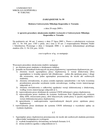 UNIWERSYTET MIKOŁAJA KOPERNIKA W TORUNIU ZARZĄDZENIE Nr 59 Rektora Uniwersytetu Mikołaja Kopernika w Toruniu z dnia 28 maja 2009 r. w sprawie procedury ukończenia studiów wyŜszych w Uniwersytecie Mikołaja Kopernika w Toruniu Na podstawie art. 66 ust. 2 ustawy z dnia 27 lipca 2005 r. Prawo o szkolnictwie wyŜszym (Dz. U. Nr 164, poz. 1365 z późn. zm.) oraz § 10 ust. 2 rozporządzenia Ministra Nauki i Szkolnictwa WyŜszego z dnia 2 listopada 2006 r. w sprawie dokumentacji przebiegu studiów (Dz. U. Nr 224, poz. 1634) z a r z ą d z a s i ę, co następuje: §1 Wszczęcie procedury ukończenia studiów następuje: 1. po złoŜeniu przez studenta w dziekanacie indeksu. 2. ponadto na kierunkach kończących się pracą dyplomową i egzaminem dyplomowym, po: 1) złoŜeniu trzech egzemplarzy pracy dyplomowej w wersji drukowanej (dwa egzemplarze w twardej oprawie lub zbindowane – jeden dla opiekuna pracy i drugi dla recenzenta, oraz jeden egzemplarz przeznaczony do teczki akt osobowych studenta), 2) złoŜeniu oświadczenia, Ŝe praca została napisana samodzielnie i nie była wcześniej przedmiotem procedur uzyskania tytułu zawodowego, według wzoru stanowiącego załącznik nr 1, 3) złoŜeniu oświadczenia o całkowitej zgodności wersji elektronicznej z drukowaną, według wzoru stanowiącego załącznik nr 2, 4) wprowadzeniu przez dziekanat do systemu USOS informacji o pracy dyplomowej, 5) wprowadzeniu przez studenta do systemu Archiwum Prac Dyplomowych, zwanym dalej APD, streszczenia pracy, słów kluczowych, tytułu pracy w języku angielskim i wersji elektronicznej pracy dyplomowej, 6) sprawdzeniu i zaakceptowaniu wprowadzonych danych przez opiekuna pracy dyplomowej. 3. wprowadzeniu przez dziekanat do systemu USOS informacji o wysokości opłaty za wydanie dyplomu. §2 1. Egzemplarz pracy dyplomowej przeznaczony do teczki akt osobowych studenta powinien odpowiadać następującym wymogom: 1) wydruk komputerowy dwustronny na kartach formatu A-4, 2) strona tytułowa zgodna z załącznikiem nr 3, 3) kartki trwale złączone ze sobą i zabezpieczone okładkami ochronnymi. 2. Wersja elektroniczna pracy dyplomowej powinna być przygotowana w postaci jednego pliku w formacie pdf, a jeŜeli zawiera załączniki to naleŜy je takŜe wprowadzić do systemu APD. 3. Wersja drukowana jest wydrukiem pliku wersji elektronicznej. §3 Oświadczenia, o których mowa w § 1 ust. 2 pkt 2 i 3 przechowywane są w teczce akt osobowych studenta. §4 1. Po spełnieniu przez studenta warunków, o których mowa w § 1, dziekanat sprawdza czy student: 1) uzyskał zaliczenia wszystkich przedmiotów i praktyk przewidzianych w planie studiów, 2) złoŜył wszystkie egzaminy przewidziane w planie studiów, 3) nie zalega z płatnościami za studia. 2. Na kierunkach kończących się pracą dyplomową i egzaminem dyplomowym, dziekan wyznacza recenzenta (recenzentów), ustala skład komisji egzaminacyjnej i termin egzaminu dyplomowego. 3. Na kierunkach kończących się egzaminem dyplomowym, dziekan ustala skład komisji egzaminacyjnej i termin egzaminu dyplomowego. 4. Dziekanat przygotowuje formularz protokołu egzaminu dyplomowego, który wraz z egzemplarzem pracy przekazuje opiekunowi pracy; egzemplarz pracy otrzymuje równieŜ recenzent. 5. Opiekun pracy i recenzent mogą wypełnić formularz oceny pracy dyplomowej elektronicznie korzystając z systemu APD; w przypadku niekorzystania z systemu APD formularz oceny pracy dyplomowej przygotowuje dziekanat. §5 1. W terminie ustalonym przez dziekana student zobowiązany jest do złoŜenia w dziekanacie: 1) zatwierdzonego przez opiekuna tytułu pracy dyplomowej w języku angielskim lub dodatkowo przez Zespół do spraw weryfikacji tłumaczeń dokumentów ukończenia studiów wyŜszych na język angielski, 2) udokumentowanych informacji o swych osiągnięciach, 3) udokumentowanych informacji o odbytych praktykach, 4) 4 identycznych fotografii w formacie 45x65 mm, 5) dowodu wniesienia opłaty za wydanie dyplomu ukończenia studiów, 6) wypełnionej karty obiegowej. 2. Wniosek o potwierdzenie poprawności tłumaczenia tematu pracy dyplomowej na język angielski stanowi załącznik nr 4. 3. Podstawowy katalog osiągnięć wpisywanych do suplementu do dyplomu określa załącznik nr 5. 4. Wpisanie osiągnięć nie ujętych w katalogu, o którym mowa w ust. 3, wymaga pisemnej zgody dziekana. §6 1. Absolwent, który chce uzyskać odpis dyplomu w tłumaczeniu na jeden z następujących języków obcych: angielski, niemiecki, francuski, rosyjski, hiszpański, składa w dziekanacie: 1) wniosek o wydanie odpisu dyplomu ukończenia studiów w tłumaczeniu na język obcy (załącznik nr 6), 2) 2 fotografie w formacie 45x65 mm, 3) dowód wniesienia opłaty za wydanie odpisu dyplomu ukończenia studiów w języku obcym. 2. Absolwent, który chce uzyskać odpis suplementu do dyplomu w tłumaczeniu na język angielski składa w dziekanacie wniosek według wzoru stanowiącego załącznik nr 7. 3. Wnioski, o których mowa w ust. 1 pkt 1) i ust. 2, absolwent powinien złoŜyć w terminie 30 dni od dnia złoŜenia egzaminu dyplomowego albo od dnia złoŜenia ostatniego wymaganego egzaminu – w przypadku kierunku lekarskiego, a w przypadku kierunku farmacja – od daty zakończenia ostatniej przewidzianej w planie studiów praktyki. 4. Tłumaczenia zawarte we wniosku, o którym mowa w ust. 2, muszą być sprawdzone i poświadczone przez Zespół do spraw weryfikacji tłumaczeń dokumentów ukończenia studiów wyŜszych na język angielski, powołany przez Rektora. 5. Odpis dyplomu w tłumaczeniu na język obcy i odpis suplementu do dyplomu w tłumaczeniu na język angielski sporządza się w dwóch egzemplarzach; jeden egzemplarz otrzymuje absolwent, drugi pozostaje w teczce akt osobowych studenta. 6. Odpis suplementu w tłumaczeniu na język angielski absolwent otrzymuje w moŜliwie najkrótszym czasie od dnia złoŜenia wniosku. §7 Uchyla się Zarządzenie Nr 48 Rektora Uniw