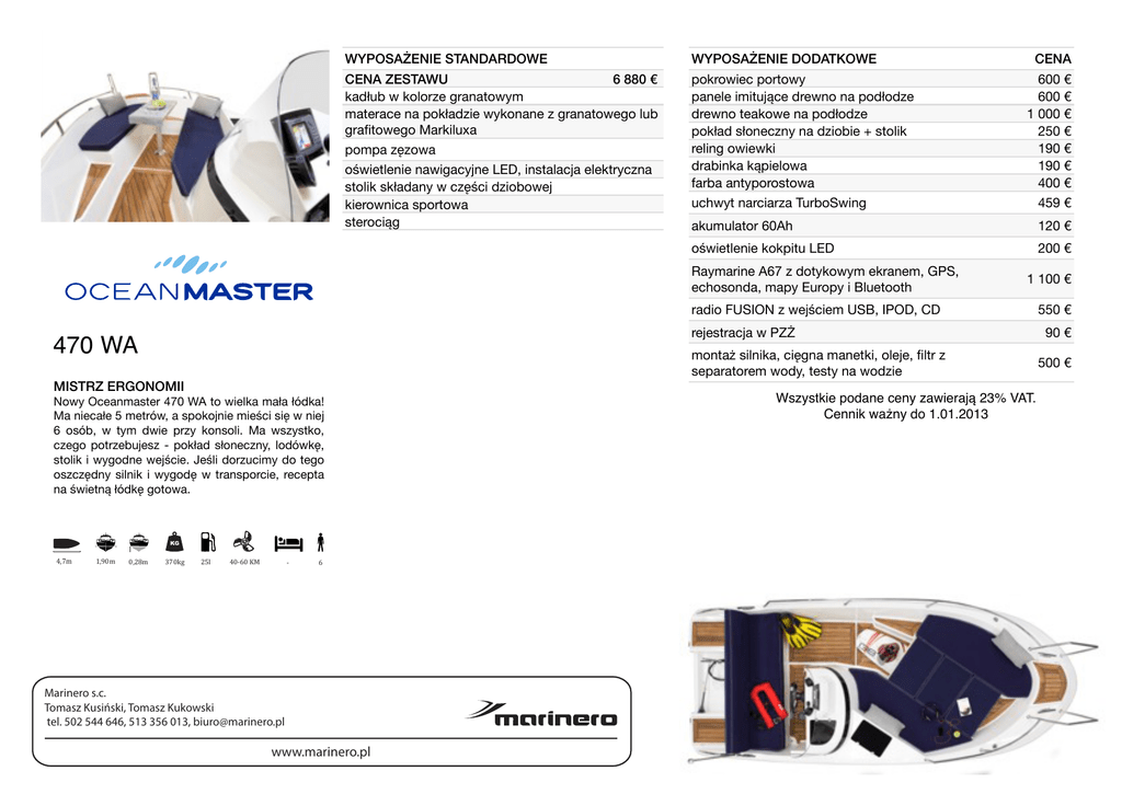 WYPOSAŻENIE STANDARDOWE CENA ZESTAWU 6 880 € kadłub w kolorze granatowym materace na pokładzie wykonane z granatowego lub grafitowego Markiluxa pompa zęzowa oświetlenie nawigacyjne LED, instalacja elektryczna stolik składany w części dziobowej kierownica sportowa sterociąg WYPOSAŻENIE DODATKOWE pokrowiec portowy panele imitujące drewno na podłodze drewno teakowe na podłodze pokład słoneczny na dziobie + stolik reling owiewki drabinka kąpielowa farba antyporostowa uchwyt narciarza TurboSwing CENA 600 € 600 € 1 000 € 250 € 190 € 190 € 400 € 459 € akumulator 60Ah 120 € oświetlenie kokpitu LED 200 € Raymarine A67 z dotykowym ekranem, GPS, echosonda, mapy Europy i Bluetooth 1 100 € radio FUSION z wejściem USB, IPOD, CD rejestracja w PZŻ 470 WA montaż silnika, cięgna manetki, oleje, filtr z separatorem wody, testy na wodzie MISTRZ ERGONOMII Nowy Oceanmaster 470 WA to wielka mała łódka! Ma niecałe 5 metrów, a spokojnie mieści się w niej 6 osób, w tym dwie przy konsoli. Ma wszystko, czego potrzebujesz - pokład słoneczny, lodówkę, stolik i wygodne wejście. Jeśli dorzucimy do tego oszczędny silnik i wygodę w transporcie, recepta na świetną łódkę gotowa. KG 4,7m 1,90m 0,28m 370kg 25l 40-60 KM - 6 Marinero s.c. Tomasz Kusiński, Tomasz Kukowski tel. 502 544 646, 513 356 013, [email protected] www.marinero.pl Wszystkie podane ceny zawierają 23% VAT. Cennik ważny do 1.01.2013 550 € 90 € 500 €