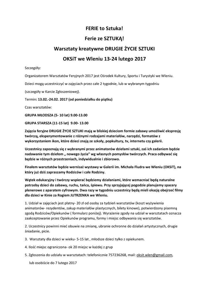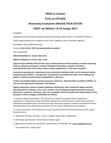 FERIE to Sztuka! Ferie ze SZTUKĄ! Warsztaty kreatywne DRUGIE ŻYCIE SZTUKI OKSiT we Wleniu 13-24 lutego 2017 Szczegóły: Organizatorem Warsztatów Feryjnych 2017 jest Ośrodek Kultury, Sportu i Turystyki we Wleniu. Dzieci mogą uczestniczyć w zajęciach przez całe 2 tygodnie, lub w wybranym tygodniu (szczegóły w Karcie Zgłoszeniowej). Termin: 13.02.-24.02. 2017 (od poniedziałku do piątku) Czas warsztatów: GRUPA MŁODSZA (5- 10 lat) 9.00-13.00 GRUPA STARSZA (11-15 lat) 9.00- 13.00 Zajęcia feryjne DRUGIE ŻYCIE SZTUKI mają w bliskiej dzieciom formie zabawy umożliwić ekspresję twórczą, eksperymentowanie z różnymi rodzajami materiałów, narzędzi, formatów z wykorzystaniem ikon, które dzieci znają ze szkoły, popkultury, tv, internetu czy galerii. Uczestnicy zapoznają się z wybranymi przez animatorów dziełami sztuki, zaś ich zadaniem będzie nadawanie tym dziełom „ nowego życia” wg własnych pomysłów twórczych. Praca odbywać się będzie w różnych przestrzeniach, indywidualnie i zbiorowo. Finałem warsztatów będzie wernisaż wystawy w Galerii im. Michała Fludra we Wleniu (OKSiT), na który już dziś zapraszamy Rodziców i całe Rodziny. Wątek edukacyjny i twórczy wspierać będziemy działaniami, które wzmacniać będą naturalne potrzeby dzieci do zabawy, ruchu, tańca, śpiewu. Przy sprzyjającej pogodzie planujemy spacery plenerowe z aparatem cyfrowym. Dwa razy w tygodniu uczestnicy będą mieli okazję obejrzeć filmy dla dzieci w Kinie za Rogiem JUTRZENKA we Wleniu. 1. Udział w zajęciach jest płatny- 20 zł od osoby za tydzień warsztatów (koszt wyżywienia animatorów- rezydentów, zakup materiałów plastycznych, bilety kinowe), potwierdzony pisemną zgodą Rodziców/Opiekunów ( formularz poniżej). Wyrażenie zgody na udział w warsztatach oznacza zaakceptowanie przez Opiekunów programu, formy i miejsc odbywania się warsztatów. 2. Uczestnicy powinni mieć obuwie na zmianę, ubranie ochronne do działań artystycznych, drugie śniadanie, picie. 3. Warsztaty dla dzieci w wieku- 5-15 lat , młodsze dzieci tylko z opiekunem. 4. Ilość miejsc ograniczona- ok 20 miejsc w każdej z grup 5. Zgłoszenia do udziału w warsztatach: telefonicznie 757236268, mail: [email protected], lub osobiście do 7 lutego 2017 Oświadczenie Rodziców/Opiekunów Ja …………………………………………………………. Wyrażam zgodę aby moja córka/ syn ……………………………………………………………. brała/brał udział w warsztatach Ferie 2016 organizowanych przez OKSiT we Wleniu. Zapoznałam/łem się z opisem warsztatów i zgadzam się na jego warunki. Wiek dziecka:…………………………………………………………………….. Przeciwskazania/uwagi…………………………………………………………………………….. Dane kontaktowe Rodziców Opiekunów Adres Telefon kontaktowy Adres mailowy Dziecko będzie uczestniczyło w warsztatach (proszę zaznaczyć krzyżykiem): tydzień I II termin 13-17. 02.2017 20-24.02.2017 miejscowość, data 9.00-13.00 podpis Rodzica/Opiekuna