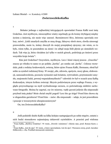 Łukasz Musiał – w: Konteksty 4/2009 ZwierzoczłekoKafka 1 Bohater jednego z najbardziej intrygujących opowiadań Franza Kafki nosi imię Grakchus. Jest myśliwym, nieszczęśliwe wiatry zepchnęły go do krainy dryfującej między życiem a śmiercią, nie może więc umrzeć. Burmistrzowi Rivy, któremu opowiada swe losy, mówi: „Łódź zmarłych zmyliła ze mną drogę, fałszywy obrót steru, chwila nieuwagi przewoźnika, może to, żeśmy zboczyli do mojej przepięknej ojczyzny; nie wiem, co to było, wiem tylko, że pozostałem na ziemi i że odtąd moja łódź płynie po ziemskich wodach. Tak więc ja, który chciałem żyć tylko w moich górach, podróżuję po śmierci przez wszystkie kraje świata”1. Kim jest Grakchus? Oczywiście, myśliwym. Lecz i kimś więcej jeszcze. „Gracchio” znaczy po włosku to samo co po polsku „kawka”, po czesku zaś „kavka”. Coloeus monedula, ptak z rodziny krukowatych, zwierzę, które ojciec Franza Kafki, Hermann, obrał był sobie za symbol rodzinnej firmy. W swojej „sile, zdrowiu, apetycie, mocy głosu, elokwencji, samozadowoleniu, poczuciu wyższości nad światem, wytrwałości, przytomności umysłu, znajomości ludzi, pewnej wspaniałomyślności” 2 człowiek ów był w oczach syna Kafką doskonałym, istnym królem zwierząt. Skrycie podziwianym przez wątłego Franza, z wyglądu przywodzącego na myśl wychudzonego szczura, co poświadczają niektóre zachowane fotografie. Można by zapytać, czy ów mizerny, wątły gryzoń jedynie dla niepoznaki przybrał imię ptaka? Może chciał zmylić pogoń? Lecz kto go ściga? Przed kim chowa się w eleganckim garniturze? Przed kim – znów: dla niepoznaki – udaje, że jest prawnikiem i pracuje w towarzystwie ubezpieczeniowym? On, ten ZwierzoczłekoKafka? 2 Jeśli podzielić dzieło Kafki na kilka kolejno następujących po sobie etapów, ostatni z nich budzi stosunkowo najmniejszą ciekawość czytelników. A przecież pod wieloma Franz Kafka, „Myśliwy Grakchus”. W: tenże, „Nowele i miniatury”, Gdynia 1991, przeł. Roman Karst, s. 73. 2 Franz Kafka, „List do ojca”. W: tenże, „Cztery opowiadania. List do ojca”, Warszawa 2003, przeł. Jarosław Ziółkowski, s. 184. Przekład nieznacznie zmieniony. 1 1 względami jest to czas znamienny. Podczas gdy wcześniej autorowi „Procesu” zdarzały się długie przerwy w pisaniu, lata 1922-1924 to okres nader systematycznej pracy i wielkiej aktywności twórczej, której efektem jest nie tylko powieść „Zamek”, ale i całe mnóstwo opowiadań, nowel, aforyzmów i rozmaitych niedokończonych fragmentów większych całości. Sławą nie dorównują one zapewne wcześniejszym utworom (choćby „Wyrokowi” czy „Przemianie”), niemniej – co do tego nie ma najmniejszych wątpliwości wnoszą one do twórczości Kafki ton cokolwiek świeży. Skądinąd niełatwo określić, na czym owa świeżość miałaby właściwie polegać. Styl w zasadzie pozostał ten sam oszczędny, surowy, można rzec urzędniczy. Podobnie najważniejsze motywy: zagubienie, lęk, wina, wstyd, nadzieja na wybawienie, które jednak nigdy – lub prawie nigdy – nie nadchodzi. A przecież coś się zmienia. W nowych opowieściach Kafki wyraźnie mniej… opowieści, żywioł narracji ulega poniekąd wyhamowaniu. O ile we wcześniejszych utworach często mieliśmy do czynienia z mocno rozbudowanymi wątkami fabularnymi, o tyle teraz fabuła staje się niemal ascetyczna. To często po prostu monologi wewnętrzne, jak w przypadku „Jamy” czy „Dociekań psa”. Ów ostatni tytuł jest zresztą znamienny dla schyłkowej fazy twórczości Kafki. Jeśli by bowiem pokusić się w tym miejscu o pierwsze, prowizoryczne uogólnienia, można by śmiało powiedzieć, że o ile wcześniejsze utwory praskiego pisarza pozostawały zasadniczo wierne poetyce przypowieści, o tyle teraz – choć logika przypowieści pozostała niezmienna – zmieniły się one właśnie w „dociekania”. Podobnie jak narrator „Jamy” drąży w ziemi swój podziemny labirynt próbując tak naprawdę dociec, przed czym nieustannie się chroni, tak też i autor „Zamku” buduje swe podziemne narracyjne schrony, gdzie możliwość ruchu – jak to w schronach – jest ograniczona, ale gdzie można w zamian usłyszeć każdy wrogi szmer. Przyjąwszy taką optykę – optykę „przyziemną”, co jednak nie powinno nikogo dziwić, wszak pies nie inaczej „docieka” aniżeli właśnie trzymając nos nisko przy ziemi! - Kafka zmienia także personel swoich opowiadań. Bohaterami (a nierzadko i narratorami) utworów najdłuższych lub najbardziej znaczących stają się często odtąd zwierzęta. Oczywiście ten pomysł nie pojawia się znikąd, już w roku 1917 powstaje znakomity utwór zatytułowany „Sprawozdanie dla Akademii”, który pod wieloma względami antycypuje późniejsze „dociekania” Kafki, mimo iż wiele obecnych w nich tropów pisarz później definitywnie porzuci. 3 2 „Sprawozdanie dla Akademii” to monolog szympansa opisującego dzieje procesu własnego uczłowieczenia. Schwytany ma dwie możliwości: albo podejmie próbę ucieczki (dodajmy od razu: z góry skazaną na niepowodzenie) albo dołączy do grona swoich oprawców. Pragmatycznie wybiera to drugie. „Humanizacja” szympansa, nazwanego jakiś czas potem Czerwonym Piotrusiem, następuje w tempie tak błyskawicznym, że już po pięciu latach dostojni akademicy mają możliwość wysłuchania odpowiednio sporządzonego raportu z ust samego zainteresowanego. „Zainteresowanym” jest rzecz jasna w tym przypadku Czerwony Piotruś, w którego żywotnym… interesie jest przemawiać składnie, spójnie i z poszanowaniem wszelkich reguł obowiązujących w świecie akademickim. Jego wystąpienie nie różni się niczym od sprawozdania, jakie moglibyśmy usłyszeć z ust człowieka wykształconego i obytego w świecie. Jest pełne retorycznych „okrągłości”, wyważone, n