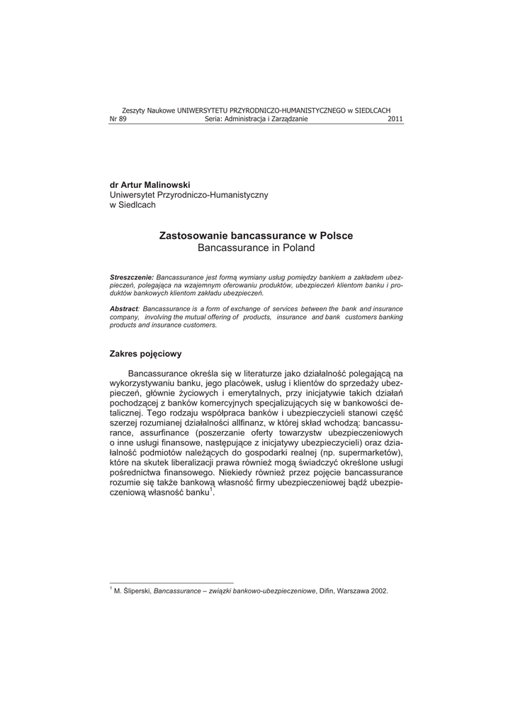 Zeszyty Naukowe UNIWERSYTETU PRZYRODNICZO-HUMANISTYCZNEGO w SIEDLCACH Nr 89 Seria: Administracja i Zarz dzanie 2011 dr Artur Malinowski Uniwersytet Przyrodniczo-Humanistyczny w Siedlcach Zastosowanie bancassurance w Polsce Bancassurance in Poland Streszczenie: Bancassurance jest form wymiany us!ug pomi"dzy bankiem a zak!adem ubezpiecze#, polegaj ca na wzajemnym oferowaniu produktów, ubezpiecze# klientom banku i produktów bankowych klientom zak!adu ubezpiecze#. Abstract: Bancassurance is a form of exchange of services between the bank and insurance company, involving the mutual offering of products, insurance and bank customers banking products and insurance customers. Zakres poj ciowy Bancassurance okre la si! w literaturze jako dzia"alno # polegaj$c$ na wykorzystywaniu banku, jego placówek, us"ug i klientów do sprzeda%y ubezpiecze&, g"ównie %yciowych i emerytalnych, przy inicjatywie takich dzia"a& pochodz$cej z banków komercyjnych specjalizuj$cych si! w bankowo ci detalicznej. Tego rodzaju wspó"praca banków i ubezpieczycieli stanowi cz! # szerzej rozumianej dzia"alno ci allfinanz, w której sk"ad wchodz$: bancassurance, assurfinance (poszerzanie oferty towarzystw ubezpieczeniowych o inne us"ugi finansowe, nast!puj$ce z inicjatywy ubezpieczycieli) oraz dzia"alno # podmiotów nale%$cych do gospodarki realnej (np. supermarketów), które na skutek liberalizacji prawa równie% mog$ wiadczy# okre lone us"ugi po rednictwa finansowego. Niekiedy równie% przez poj!cie bancassurance rozumie si! tak%e bankow$ w"asno # firmy ubezpieczeniowej b$d' ubezpieczeniow$ w"asno # banku1. 1 M. (liperski, Bancassurance – zwi zki bankowo-ubezpieczeniowe, Difin, Warszawa 2002. 138 A. Malinowski ALLFINANZ ASSURFINANCE BANCASSURANCE POWI!ZANIA POMI"DZY INSTYTUCJAMI FINANSOWYMI INNYMI NI# FIRMY UBEZPIECZENIOWE ASSURBANKING POWI!ZANIA POMI"DZY FIRMAMI UBEZPIECZENIOWYMI A INSTYTUCJAMI FINANSOWYMI INNYMI NI# BANKI Rys. 1. Usystematyzowanie poj!# z zakresu problematyki powi$za& instytucji finansowych Fig. 1. Systematizing notions from the scope of issues of connections of financial institutions )ród"o: M. Swacha-Lech, Bancassurance Sprzeda$ Produktów Bankowo-Ubezpieczeniowych, Cedewu, Warszawa 2008. Source: M. Swacha-Lech, Bancassurance Sprzeda$ Produktów Bankowo-Ubezpieczeniowych, Cedewu, Warszawa 2008. Allfinanz – to powi$zania o charakterze zarówno podmiotowym, jak i przedmiotowym, zachodz$ce pomi!dzy wszelkimi instytucjami rynku finansowego. Assurfinance – to powi$zania o charakterze zarówno podmiotowym, jak i przedmiotowym, zachodz$ce pomi!dzy firmami ubezpieczeniowymi a innymi podmiotami sektora finansowego. Assurbanking – to strategia dzia"ania podejmowana przez towarzystwa ubezpiecze& i banki obejmuj$ca nast!puj$ce rodzaje powi$za& pomi!dzy tymi instytucjami: powi$zania o charakterze podmiotowym, w których stron$ dominuj$c$ jest firma ubezpieczeniowa oraz powi$zania o charakterze przedmiotowym, przy realizacji których towarzystwo anga%uje swoje kana"y dystrybucji do sprzeda%y lub promocji produktów bankowych. Bancassurance – to strategia dzia"ania podejmowana przez banki i towarzystwa ubezpiecze& obejmuj$ca nast!puj$ce rodzaje powi$za& pomi!dzy tymi instytucjami: powi$zania o charakterze podmiotowym, w których stron$ dominuj$c$ jest bank oraz powi$zania o charakterze przedmiotowym, przy realizacji których bank anga%uje swoje kana"y dystrybucji do sprzeda%y lub promocji produktów ubezpieczeniowych.2 Marek Urbaniak okre la natomiast bancassurance jako dzia"alno # grup bankowo-ubezpieczeniowych trwale po"$czonych instytucjonalnie w celu oferowania produktów bankowych i ubezpieczeniowych. Bancassurance to oferta skierowana do klienta indywidualnego, gdzie obok produktów takich jak lokaty i kredyty znajduj$ si! równie% ubezpieczenia o charakterze inwesty2 M. Swacha-Lech, Bancassurance Sprzeda$ Produktów Bankowo-Ubezpieczeniowych, Cedewu, Warszawa 2008. Seria: Administracja i Zarz dzanie (16)2011 ZN nr 89 Zastosowanie bancassurance w Polsce 139 cyjno-zabezpieczaj$cym. W sprzeda%y tych wszystkich produktów zostaje wykorzystana sie# placówek bankowych, które s$ w bezpo rednim kontakcie z klientem.3 Zgadzam si! z nim, %e w Polsce przyj$# realnie nale%y szersz$ definicj!, zgodnie z któr$ pod tym poj!ciem mo%na rozumie# ka%d$ wspó"prac! banku z towarzystwem ubezpiecze&4. Tabela. 1. Interpretacja terminu bancassurance w literaturze Table 1. Interpretation of the date bancassurance in literature Definicje terminu bancassurance Coopers & Lybrand J. Crooks Gora M. &liperski J. Bose O. Kowalewski T.C. Hoschka G. Morgan strategia stosowana przez banki i firmy ubezpieczeniowe, nacelowana na $wiadczenie osobom fizycznym us%ug w sposób mniej lub bardziej zintegrowany proces tworzenia hybrydowych produktów i us%ug bankowo-ubezpieczeniowych wykorzystanie banku – jego placówek, us%ug i klientów – do sprzeda'y ubezpiecze(, g%ównie 'yciowych i emerytalnych, przy czym inicjatywa ta pochodzi z banków komercyjnych o detalicznym charakterze oferty % czne oferowanie swoich produktów przez bank i firm) ubezpieczeniow w ramach jednej organizacji jak tworz trwa%e po% czenie instytucji bankowej z instytucj ubezpieczeniow , w celu oferowania produktów bankowych i ubezpieczeniowych w ramach istniej cych struktur bankowych wchodzenie banków w sektor ubezpieczeniowy poprzez oferowanie produktów ubezpieczeniowych dla klientów detalicznych proces, w ramach którego instytucja depozytowo-kredytowa przekszta%ca si) i nabywa cech grupy bankowo-ubezpieczeniowej )ród"o: M. Swacha-Lech, Bancassurance Sprzeda$ Produktów Bankowo-Ubezpieczeniowych, Cedewu, Warszawa 2008. Source: M. Swacha-Lech, Bancassurance Sprzeda$ Produktów Bankowo-Ubezpieczeniowych, Cedewu, Warszawa 2008. Rozumienie to powinno dotyczy# oczywi cie wspó"pracy strcite sformalizownej i opartej o ramy instytucjonalne ka%dej z instytucji. Komisja Nadzoru Ubezpiecze& i Funduszy Emerytalnych (KNUiFE – od wrze nia 2006 roku obowi$zki prz