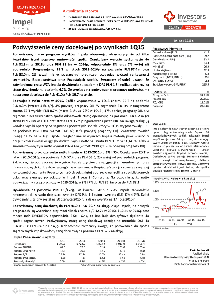 EQUITY RESEARCH PARTNER Aktualizacja raportu Impel Outsourcing Podnosimy cenę docelową do PLN 41.0/akcję z PLN 39.7/akcję Podwyższamy naszą prognozę zysku netto w 2015-2016p o 8% i 7% do PLN 32.5m oraz do PLN 33.1m 2015p P/E 12.7x oraz 2015p EV/EBITDA 6.5x Cena docelowa: PLN 41.0 19 maja 2015 r. Podwyższenie ceny docelowej po wynikach 1Q15 Podwyższamy nasze prognozy wyników Impela obserwując utrzymujący się od kilku kwartałów trend poprawy rentowności spółki. Oczekujemy wzrostu zysku netto do PLN 32.5m w 2015p oraz PLN 33.1m w 2016p, odpowiednio 8% oraz 7% wyżej niż poprzednio. Prognozujemy EBIT w latach 2015-2016p na poziomie PLN 57.4m oraz PLN 58.0m, 2% wyżej niż w poprzedniej prognozie, oczekując wyższej rentowności segmentów Bezpieczeństwa oraz Pozostałych spółek. Zwracamy również uwagę, że zatwierdzona przez WZA Impela dywidenda na poziomie DPS PLN 1.5 implikuje atrakcyjną stopę dywidendy na poziomie 4.7%. Ze względu na podwyższenie prognozy podwyższamy naszą cenę docelową do PLN 41.0 z PLN 39.7 na akcję. Podwojenie zysku netto w 1Q15. Spółka wypracowała w 1Q15 znorm. EBIT na poziomie PLN 9.3m (wzrost 14% r/r), 3% powyżej prognozy DII. W segmencie Facility Management znorm. EBIT wyniósł PLN 8.7m (marża 3.1% vs. 23% w 1Q15), 17% poniżej prognozy DII, a w segmencie Bezpieczeństwo spółka odnotowała stratę operacyjną na poziomie PLN 0.2 m (vs strata PLN 2.0m w 1Q14 oraz strata PLN 0.7m prognozowana przez DII). Na uwagę zasługują wysokie wyniki operacyjne segmentu pozostałych spółek, który w 1Q15 wygenerowały EBIT na poziomie PLN 2.8m (wzrost 74% r/r, 82% powyżej prognozy DII). Zwracamy również uwagę na to, że w 1Q15 spółki uwzględniane w wynikach Impela metodą praw własności drugi z kolei kwartał osiągnęły dodatni wynik netto vs. strata PLN 0.3m w 1Q14. W efekcie znormalizowany zysk netto wyniósł PLN 4.6m (wzrost 290% r/r, 26% powyżej prognozy DII). Podwyższamy prognozę zysku netto Impela w 2015-2016p o 8% i 7%. Oczekujemy EBIT w latach 2015-2016p na poziomie PLN 57.4 oraz PLN 58.0, 2% wyżej od poprzednich prognoz. Zakładamy, że poprawa marży wynikać będzie częściowo z rezygnacji z nierentownych oraz niskomarżowych kontraktów, szczególnie w segmencie Bezpieczeństwa jak również z wyższej rentowności segmentu Pozostałych spółek osiągniętej poprzez cross-selling specjalistycznych usług oraz synergie po połączeniu Impel IT oraz SI-Consulting. Na poziomie zysku netto podwyższamy naszą prognozę w 2015-2016p o 8% i 7% do PLN 32.5m oraz do PLN 33.1m. Dywidenda na poziomie PLN 1.5/akcję. W kwietniu 2015 r. ZWZ Impela zatwierdziło rekomendację zarządu dotyczącą wypłaty DPS PLN 1.5 (stopa wypłaty 63%, DY: 4.7%). Dzień dywidendy ustalony został na 30 czerwca 2015 r., a dzień wypłaty na 17 lipca 2015 r. Podwyższamy cenę docelową do PLN 41.0 z PLN 39.7 na akcję. Akcje Impela, na naszych prognozach, są wyceniane przy mnożnikach znorm. P/E 12.7x w 2015r. i 12.4x w 2016p oraz mnożnikach EV/EBITDA odpowiednio 6.5x i 6.4x, co implikuje dwucyfrowe dyskonto do spółek zagranicznych. Podwyższamy naszą cenę docelową bazując na metodzie DCF do PLN 41.0 z PLN 39.7 na akcję. Jednocześnie zwracamy uwagę, że porównanie do spółek zagranicznych implikowałoby cenę docelową na poziomie PLN 62.2 na akcję. Podstawowe informacje Cena docelowa (PLN) Poprzednia cena docelowa (PLN) Cena bieżąca (PLN) Max (52T) Min (52T) Liczba akcji (m) Kapitalizacja (PLNm) Dług netto (1Q15, PLNm) EV (1Q15, PLNm) Śr. dzienny obrót (3M, PLNk) 41.0 39.7 32.0 34.3 26.9 12.9 412 251 663 265.5 Akcjonariat Grzegorz Dzik Józef Biegaj PZU OFE Pozostali % 38.31% 26.55% 11.71% 23.44% Opis Spółki Impel należy do największych graczy na polskim rynku usług outsourcingowych. Poprzez 66 wyspecjalizowanych spółek zależnych Impel współpracuje z ok. 60 tys. osób, dostarczając swoje usługi do ponad 6 tys. klientów. Oferta Impela skupia się na obszarach Maintenance Solutions (obsługa nieruchomości) i Safety Solutions (głównie fizyczna ochrona mienia). Dodatkowo spółka oferuje Business Solutions (m.in. usługi kadrowo-płacowe), Delivery Solutions (wynajem i serwis odzieży). Głównym rynkiem działalności jest Polska, ale spółka posiada również filie na Łotwie i Ukrainie. Impel vs. WIG: Relatywny kurs akcji 115% 110% 105% 100% 95% sty 15 lut 15 IPL mar 15 kwi 15 maj 15 WIG Źródło: Bloomberg Impel: Podsumowanie wyceny 2013 1 600.6 84.0 16.3 27.5x 8.0x 0.0% Przychody Znorm. EBITDA Znorm. Zysk netto Znorm. P/E Znorm. EV/EBITDA Stopa dywidendy* Źródło: Dane Spółki, szacunki DI Investors 2014 1 722.5 97.6 30.5 17.5x 7.4x 4.7% 2015p 1 823.9 102.4 32.5 12.7x 6.5x 4.7% 2016p 1 913.9 103.0 33.1 12.4x 6.4x 4.7% * Dywidenda z zysku netto za dany rok 2017p 1 981.4 109.4 38.0 10.8x 5.9x 4.7% Piotr Raciborski Analityk akcji, Doradca Inwestycyjny (licencja nr 514) (+48) 22 378 9195 [email protected] Wszystkie ceny są aktualne na koniec 2015-05-15 chyba, że jest to inaczej określone. Ceny pochodzą z lokalnych giełd za pośrednictwem serwisów Reutera, Bloomberga oraz innych dostawców. Źródłem danych jest Dom Inwestycyjny Investors oraz opisywane firmy. DI Investors współpracuje oraz stara się prowadzić swoją działalność ze spółkami uwzględnionymi w jego raportach z badań. Dlatego też inwestorzy powinni mieć świadomość, że w firmie może zachodzić konflikt interesów, co mogłyby wpłynąć na obiektywność niniejszego raportu. Inwestorzy powinni brać ten raport pod uwagę jedynie jako jeden z czynników przy podejmowaniu swoich decyzji inwestycyjnych. Impel, maj 2015 Impel Dane w PLNm o ile nie podano inaczej Rachunek zysków i strat (PLNm) 2013 2014 2015p 2016p Przychody ze sprzedaży 1 601 1 723 1 824 1 914 Koszty sprzedanych towarów -1 552 -1 675 -1 766 -1 856 Zysk brutto ze sprzedaży 48.8 47.9 57.4 58.0 Koszty sprzedaży i zarządu -1 552 -1 675 -1 766 -