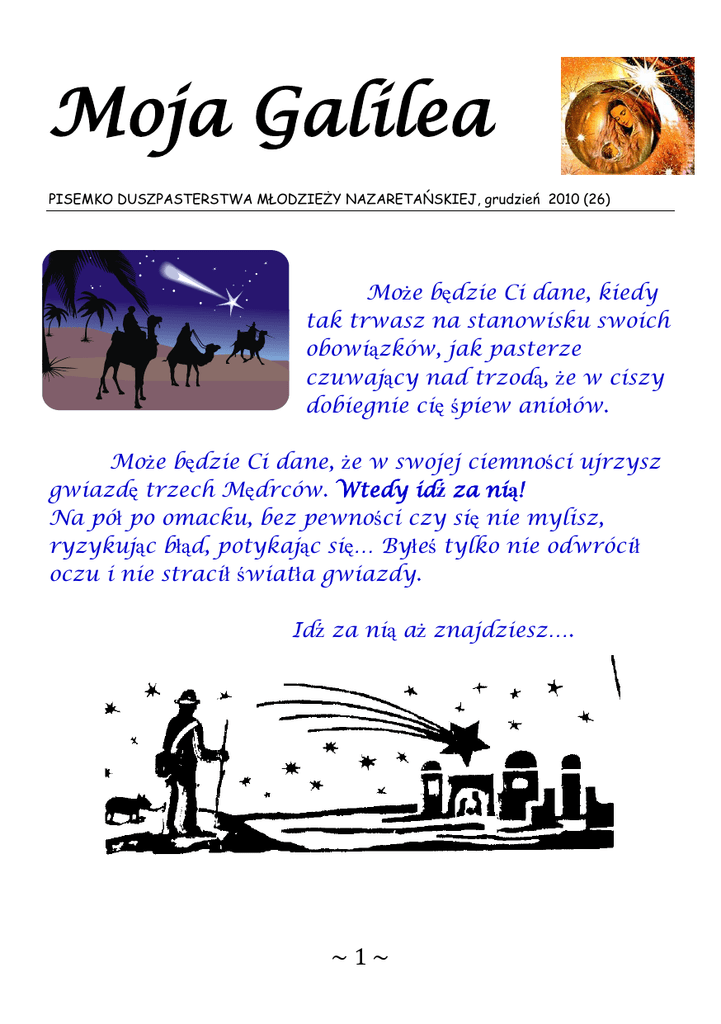 Moja Galilea PISEMKO DUSZPASTERSTWA MŁODZIEŻY NAZARETAŃSKIEJ, grudzień 2010 (26) Może będzie Ci dane, kiedy tak trwasz na stanowisku swoich obowiązków, jak pasterze czuwający nad trzodą, że w ciszy dobiegnie cię śpiew aniołów. Może będzie Ci dane, że w swojej ciemności ujrzysz gwiazdę trzech Mędrców. Wtedy idź za nią! Na pół po omacku, bez pewności czy się nie mylisz, ryzykując błąd, potykając się… Byłeś tylko nie odwrócił oczu i nie stracił światła gwiazdy. Idź za nią aż znajdziesz…. ~1~ „SŁÓWKO” OD REDAKCJI „Nauczycielu dobry, co mam czynić, aby osiągnąć życie wieczne.” Na ostatnim 7.Forum Młodzieży Nazaretańskiej wybrzmiało w naszych sercach pytanie o życie wieczne. Było to niezwykłe spotkanie z Osobą Jezusa z Nazaretu, które rozpoczęło wpisywać w młode serca odpowiedź... Jeśli uważnie śledziliście migające kartki w kalendarzu i wydarzenia - dostrzegliście, że Pan pisze prosto po naszych koślawych liniach życia... Drodzy Młodzi – wróciliście do swoich domowych Nazaretów, aby wzrastać w mądrości, w łasce i w latach... I dobrze, że w swojej zapracowanej codzienności znajdujecie czas na spotkania DMN-u, na dni skupienia, - a ostatnio wielu z Was – znalazło dużo czasu na rekolekcje w Kaliszu!!! To dobry znak, to wielka szansa usłyszenia fascynującej odpowiedzi Jezusa na Wasze życiowe pytania. Co dalej? Przed nami nowy Rok Liturgiczny z niezwykle aktualnym przesłaniem: „W komunii z Bogiem”. Startujemy w ten nowy początek umocnieni wstawiennictwem bł. Franciszki Siedliskiej, która w listopadzie –na przełomie starego i nowego roku liturgicznego – ma ważne daty i rocznice. Nie ma dla ludzi Nazaretu lepszej przewodniczki na drodze budowania komunii – wspólnoty i jedności z Bogiem i ludźmi. Na czas Adwentu i czas Nazaretu wpisany w okres Bożego Narodzenia życzymy Wam wrażliwych serc, które zdołają usłyszeć każde pukanie do Waszych drzwi i czujnych oczu, które zdołają rozpoznać przychodzącego Emanuela.. Niech zapatrzenie się w Świętą Rodzinę pomoże znaleźć klucz do pozamykanych jeszcze pytań i do błogosławionej przyszłości ... -z modlitwą -Redakcja Moja Galilea Pisemko Duszpasterstwa Młodzieży Nazaretańskiej Prowincji Warszawskiej Redagują: s. Joela, s. Bogna i Przyjaciele Ul. Czerniakowska 137, 00-720 Warszawa Tel. 022/851 05 49 lub kom. 0605 615 647, e-mail: [email protected] Pisemko można przeczytać na stronach internetowych DMN: www.nazaretanki.pl/dmn/ ~2~ WSPOMNIENIA, WRAŻENIA, RELACJE… REKOLEKCJE W KALISZU Długi weekend postanowiłam spędzić na rekolekcjach Kaliszu. Temat rekolekcji dotyczył poznawania i pokochania siebie. Kiedy tylko zobaczyłam ten temat, pomyślałam sobie, że nie jest możliwe poznać, a tym bardziej pokochać siebie w przeciągu zaledwie kilku dni. Pomimo tego temat jednak bardzo mi się spodobał, ponieważ był związany z psychologią, która mnie bardzo interesuje. Rekolekcje rozpoczęły się Eucharystią, po której odbyło się pierwsze spotkanie integracyjne. Poprzez zabawę mogliśmy poznać chociaż swoje imiona. Było nas bardzo wielu, więc niestety nie ze wszystkimi udało się zamienić choć kilka zdań. Każdy dzień miał swój podtemat. Pierwszego dnia uczyliśmy się odkrywać siebie w swojej codzienności. Tego dnia oglądaliśmy bardzo ciekawy film, który dotyczył poszukiwania własnej tożsamości. Szkoda tylko, że nie było już czasu na dyskusję. Kolejny dzień przebiegał pod hasłem odkrywania siebie w drugim człowieku. Po południu Podczas spaceru po Kaliszu…z Julitą, naszym przewodnikiem! odbyło się spotkanie z egzorcysta, który mówił o działaniu Złego Ducha, a także o zagrożeniach, na jakie możemy się natknąć w życiu codziennym. Myślę, że dziś szczególnie jest potrzebne uwrażliwianie ludzi na tematy związane z działaniem szatana, ~3~ który potrafi się schować za pozornie niewinnymi rzeczami i w ten sposób powoli zniewolić człowieka. Trzeciego dnia odkrywaliśmy siebie w oczach Pana Boga. Po południu Julita oprowadziła nas po Kaliszu. Najważniejszym punktem tego spaceru było zwiedzenie Bazyliki Świętego Józefa. Wiele słyszałam wcześniej o tym miejscu i dlatego byłam bardzo zadowolona, że odwiedziliśmy to sanktuarium. Chciałam jednak przede wszystkim zwrócić uwagę na wspaniałe konferencje księdza Radka. Choć miał tak niewiele czasu, żeby poruszyć ważne i obszerne tematy, potrafił w pigułce przekazać nam bardzo wiele ważnych rzeczy, z których, myślę, każdy z nas mógł wyciągnąć coś dla siebie. Ponadto poprzez krótkie zadania, które mieliśmy do wykonania, mogliśmy dowiedzieć się czegoś o sobie. Chciałabym dodać, że także codzienne Adoracje oraz Msze Święte były dla mnie ważnym momentem rekolekcji, ponieważ pozwalały wyciszyć się i spotkać tak bardzo osobiście Pana Jezusa obecnego Najświętszy Sakramencie. Na koniec chciałabym podziękować Siostrom Nazaretanką, dzięki którym te rekolekcje mogły się odbyć, Księdzu Radkowi, za to, że był, z nami na rekolekcjach, a także za bardzo ważną dla mnie rozmowę, ponadto księdzu egzorcyście za ciekawy wykład, Julicie za ciekawe opowiadanie o Kaliszu, Ani za podzielenie się swoim doświadczeniem z misji w Afryce, i wszystkim uczestnikom, za waszą żywą wiarę i głęboką wieź z Chrystusem. Życzę wam, abyście nigdy nie stracili tej wiary i szli za tym, który jest Drogą, Prawdą i Życiem. Niech Pan Wam zawsze błogosławi! Monika Rekolekcje w Kaliszu były dla mnie niezwykle pozytywnym i w pewnym sensie przełomowym przeżyciem. Pozytywnym, bo wszystko co jest związane z DMN-em jest bardzo pozytywne :)Przełomowym, bo... chyba nauczyłam się patrzeć na życie bardziej pod względem tego, czego chce Pan Bóg. Cieszę się, że przyjechało nas tak dużo. Cieszę się, że przedział wiekowy był tak duży i że mogłam pozn