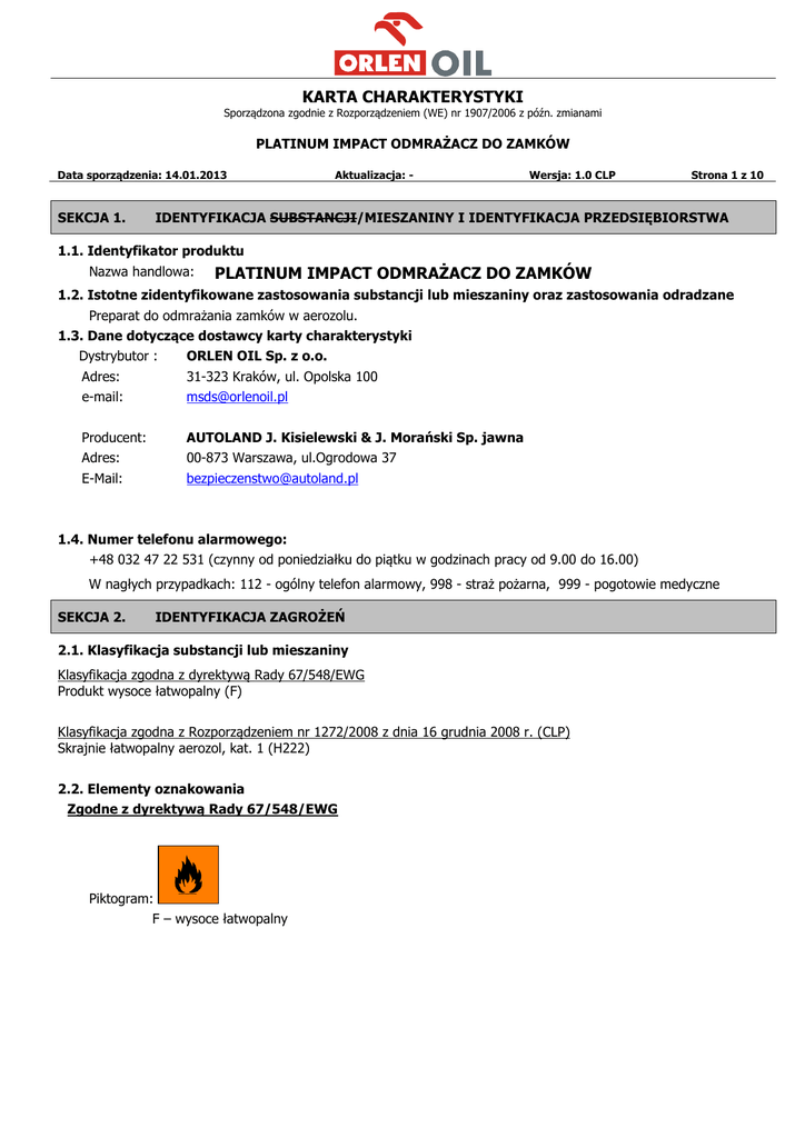 KARTA CHARAKTERYSTYKI Sporządzona zgodnie z Rozporządzeniem (WE) nr 1907/2006 z późn. zmianami PLATINUM IMPACT ODMRAŻACZ DO ZAMKÓW Data sporządzenia: 14.01.2013 SEKCJA 1. Aktualizacja: - Wersja: 1.0 CLP Strona 1 z 10 IDENTYFIKACJA SUBSTANCJI/MIESZANINY I IDENTYFIKACJA PRZEDSIĘBIORSTWA 1.1. Identyfikator produktu Nazwa handlowa: PLATINUM IMPACT ODMRAŻACZ DO ZAMKÓW 1.2. Istotne zidentyfikowane zastosowania substancji lub mieszaniny oraz zastosowania odradzane Preparat do odmrażania zamków w aerozolu. 1.3. Dane dotyczące dostawcy karty charakterystyki Dystrybutor : ORLEN OIL Sp. z o.o. Adres: 31-323 Kraków, ul. Opolska 100 e-mail: [email protected] Producent: AUTOLAND J. Kisielewski & J. Morański Sp. jawna Adres: 00-873 Warszawa, ul.Ogrodowa 37 E-Mail: [email protected] 1.4. Numer telefonu alarmowego: +48 032 47 22 531 (czynny od poniedziałku do piątku w godzinach pracy od 9.00 do 16.00) W nagłych przypadkach: 112 - ogólny telefon alarmowy, 998 - straż pożarna, 999 - pogotowie medyczne SEKCJA 2. IDENTYFIKACJA ZAGROŻEŃ 2.1. Klasyfikacja substancji lub mieszaniny Klasyfikacja zgodna z dyrektywą Rady 67/548/EWG Produkt wysoce łatwopalny (F) Klasyfikacja zgodna z Rozporządzeniem nr 1272/2008 z dnia 16 grudnia 2008 r. (CLP) Skrajnie łatwopalny aerozol, kat. 1 (H222) 2.2. Elementy oznakowania Zgodne z dyrektywą Rady 67/548/EWG Piktogram: F – wysoce łatwopalny KARTA CHARAKTERYSTYKI Sporządzona zgodnie z Rozporządzeniem (WE) nr 1907/2006 z późn. zmianami PLATINUM IMPACT ODMRAŻACZ DO ZAMKÓW Data sporządzenia: 14.01.2013 Aktualizacja: - Wersja: 1.0 CLP Strona 2 z 10 Zwroty wskazujące rodzaj zagrożenia: nie są wymagane Zwroty określające warunki bezpiecznego stosowania: S 2 - chronić przed dziećmi; S 16 - nie przechowywać w pobliżu źródeł zapłonu – nie palić tytoniu; S 23 - nie wdychać rozpylonej cieczy; S 46 - w razie połknięcia niezwłocznie zasięgnij porady lekarza –pokaż opakowanie lub etykietę; S 51 - stosować wyłącznie w dobrze wentylowanych pomieszczeniach Produkt zawiera: etanol UWAGA!!!! Na opakowaniu należy umieścić napis: Pojemnik pod ciśnieniem: chronić przed słońcem i temperaturą powyżej 50oC. Nie przekłuwać ani nie spalać, także po zużyciu. Nie rozpylać nad otwartym płomieniem lub żarzącym się materiałem. Chronić przed źródłami zapłonu – nie palić w czasie rozpylania. Chronić przed dziećmi. Zgodne z Rozporządzeniem nr 1272/2008 z dnia 16 grudnia 2008 r. (CLP) PIKTOGRAM Hasło ostrzegawcze: Niebezpieczeństwo. ZWROTY WSKAZUJĄCE RODZAJ ZAGROŻENIA: H222 Skrajnie łatwopalny aerozol. H229 Pojemnik pod ciśnieniem: Ogrzanie grozi wybuchem. ZWROTY OKREŚLAJĄCE WARUNKI BEZPIECZNEGO STOSOWANIA: P102 Chronić przed dziećmi. P210 Przechowywać z dala od źródeł ciepła, iskrzenia, otwartego ognia i gorących powierzchni. Palenie wzbronione. P211 Nie rozpylać nad otwartym ogniem lub innym źródłem zapłonu. P251 Pojemnik pod ciśnieniem. Nie przekłuwać ani nie spalać, nawet po zużyciu. P410+P412 Chronić przed światłem słonecznym. Nie wystawiać na działanie temperatury przekraczającej 50 °C Zawiera: etanol, butan, propan, etano-1,2-diol, izobutan. Na etykiecie należy umieścić: Pojemnik pod ciśnieniem: chronić przed słońcem i temperaturą powyżej 50oC. Nie przekłuwać ani nie spalać, także po zużyciu. Nie rozpylać nad otwartym płomieniem lub żarzącym się materiałem. 2.3. Inne zagrożenia Pojemnik pod ciśnieniem: chronić przed słońcem i temperaturą powyżej 50oC. Nie przekłuwać ani nie spalać, także po zużyciu. Nie rozpylać nad otwartym płomieniem lub żarzącym się materiałem. SEKCJA 3. SKŁAD/INFORMACJA O SKŁADNIKACH 3.2. Mieszaniny Nazwa substancji /nr rejestracji etanol Nr CAS / Nr WE 64-17-5/ 200-578-6 % wag. <70 Nr indeksowy 200-578-6 Klasyfikacja wg 67/548/EWG F, R 11 Klasyfikacja wg 1272/2008 (CLP) Flam. Liq. 2, H 225 KARTA CHARAKTERYSTYKI Sporządzona zgodnie z Rozporządzeniem (WE) nr 1907/2006 z późn. zmianami PLATINUM IMPACT ODMRAŻACZ DO ZAMKÓW Data sporządzenia: 14.01.2013 Aktualizacja: - Wersja: 1.0 CLP Strona 3 z 10 1,2-etanodiol 107-21-1/ 203-473-3 <5 203-473-3 Xn, R 22 Acute Tox. 4, H 302 n-butan 106-97-8/ 203-448-7 <20 601-004-00-0 F+, R 12 Flam. Gas 1 Press. Gas, H 220 propan 74-98-6/ 200-827-9 <10 601-003-00-5 F+, R 12 Flam. Gas 1 Press. Gas, H 220 <1 601-004-00-0 F+; R 12 Flam. Gas 1 Press. Gas; H 220 75-28-5/ 200-857-2 Opis zwrotów R i H podano w Sekcji 16. i-butan SEKCJA 4. ŚRODKI PIERWSZEJ POMOCY 4.1. Opis środków pierwszej pomocy Wdychanie: Wynieść poszkodowanego z miejsca narażenia, ułożyć w wygodnej pozycji półleżącej lub siedzącej, zapewnić spokój, chronić przed utratą ciepła. Jeżeli wystąpią zaburzenia oddychania, podawać tlen do oddychania. Jeżeli objawy nie ustępują, wezwać lekarza. Kontakt ze skórą: Obficie zmywać letnią, bieżącą wodą. Zdjąć zanieczyszczoną odzież. Jeśli podrażnienie nie ustępuje, zasięgnąć porady lekarza. Kontakt z oczami: Natychmiast płukać dużą ilością letniej wody, najlepiej bieżącej, przez co najmniej 15 min. Usunąć szkła kontaktowe. Unikać silnego strumienia wody ze względu na ryzyko mechanicznego uszkodzenia rogówki. Jeżeli podrażnienie nie ustępuje, należy skonsultować się z lekarzem-okulistą. Połknięcie: Jeżeli nastąpi połknięcie dużej ilości, nie powodować wymiotów ponieważ istnieje ryzyko zachłyśnięcia się i przedostania się substancji do płuc. Podać do wypicia dużą ilość wody, jeżeli poszkodowany jest przytomny. Wezwać lekarza. 4.2. Najważniejsze ostre i opóźnione objawy oraz skutki narażenia Brak dostępnych danych. 4.3. Wskazania dotyczące wszelkiej natychmiastowej pomocy lekarskiej i szczególnego postępowania z poszkodowanym Wskazówki dla lekarza: leczenie objawowe. SEKCJA 5. POSTĘPOWANIE W PRZYPADKU POŻARU 5.1. Środki gaśnicze Odpowiednie środki gaśnicze: Proszki gaśnicze, dwutlene