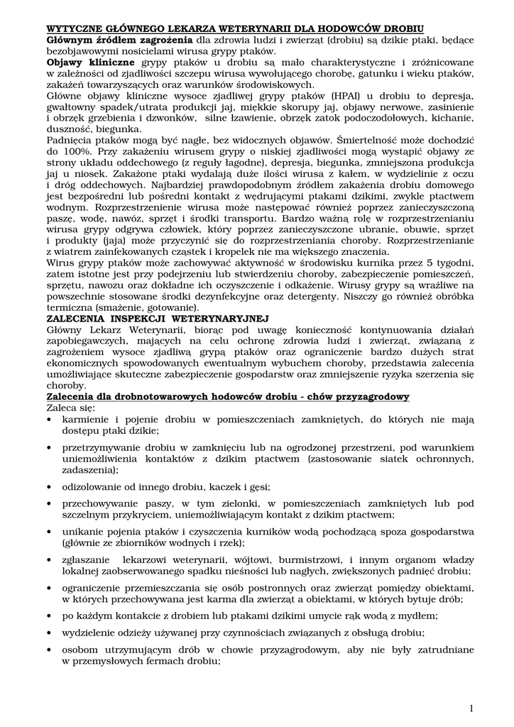 WYTYCZNE GŁÓWNEGO LEKARZA WETERYNARII DLA HODOWCÓW DROBIU Głównym ródłem zagro enia dla zdrowia ludzi i zwierz t (drobiu) s dzikie ptaki, b d ce bezobjawowymi nosicielami wirusa grypy ptaków. Objawy kliniczne grypy ptaków u drobiu s mało charakterystyczne i zró nicowane w zale no ci od zjadliwo ci szczepu wirusa wywołuj cego chorob , gatunku i wieku ptaków, zaka e towarzysz cych oraz warunków rodowiskowych. Główne objawy kliniczne wysoce zjadliwej grypy ptaków (HPAI) u drobiu to depresja, gwałtowny spadek/utrata produkcji jaj, mi kkie skorupy jaj, objawy nerwowe, zasinienie i obrz k grzebienia i dzwonków, silne łzawienie, obrz k zatok podoczodołowych, kichanie, duszno , biegunka. Padni cia ptaków mog by nagłe, bez widocznych objawów. miertelno mo e dochodzi do 100%. Przy zaka eniu wirusem grypy o niskiej zjadliwo ci mog wyst pi objawy ze strony układu oddechowego (z reguły łagodne), depresja, biegunka, zmniejszona produkcja jaj u niosek. Zaka one ptaki wydalaj du e ilo ci wirusa z kałem, w wydzielinie z oczu i dróg oddechowych. Najbardziej prawdopodobnym ródłem zaka enia drobiu domowego jest bezpo redni lub po redni kontakt z w druj cymi ptakami dzikimi, zwykle ptactwem wodnym. Rozprzestrzenienie wirusa mo e nast powa równie poprzez zanieczyszczon pasz , wod , nawóz, sprz t i rodki transportu. Bardzo wa n rol w rozprzestrzenianiu wirusa grypy odgrywa człowiek, który poprzez zanieczyszczone ubranie, obuwie, sprz t i produkty (jaja) mo e przyczyni si do rozprzestrzeniania choroby. Rozprzestrzenianie z wiatrem zainfekowanych cz stek i kropelek nie ma wi kszego znaczenia. Wirus grypy ptaków mo e zachowywa aktywno w rodowisku kurnika przez 5 tygodni, zatem istotne jest przy podejrzeniu lub stwierdzeniu choroby, zabezpieczenie pomieszcze , sprz tu, nawozu oraz dokładne ich oczyszczenie i odka enie. Wirusy grypy s wra liwe na powszechnie stosowane rodki dezynfekcyjne oraz detergenty. Niszczy go równie obróbka termiczna (sma enie, gotowanie). ZALECENIA INSPEKCJI WETERYNARYJNEJ Główny Lekarz Weterynarii, bior c pod uwag konieczno kontynuowania działa zapobiegawczych, maj cych na celu ochron zdrowia ludzi i zwierz t, zwi zan z zagro eniem wysoce zjadliw gryp ptaków oraz ograniczenie bardzo du ych strat ekonomicznych spowodowanych ewentualnym wybuchem choroby, przedstawia zalecenia umo liwiaj ce skuteczne zabezpieczenie gospodarstw oraz zmniejszenie ryzyka szerzenia si choroby. Zalecenia dla drobnotowarowych hodowców drobiu - chów przyzagrodowy Zaleca si : • karmienie i pojenie drobiu w pomieszczeniach zamkni tych, do których nie maj dost pu ptaki dzikie; • przetrzymywanie drobiu w zamkni ciu lub na ogrodzonej przestrzeni, pod warunkiem uniemo liwienia kontaktów z dzikim ptactwem (zastosowanie siatek ochronnych, zadaszenia); • odizolowanie od innego drobiu, kaczek i g si; • przechowywanie paszy, w tym zielonki, w pomieszczeniach zamkni tych lub pod szczelnym przykryciem, uniemo liwiaj cym kontakt z dzikim ptactwem; • unikanie pojenia ptaków i czyszczenia kurników wod pochodz c spoza gospodarstwa (głównie ze zbiorników wodnych i rzek); • zgłaszanie lekarzowi weterynarii, wójtowi, burmistrzowi, i innym organom władzy lokalnej zaobserwowanego spadku nie no ci lub nagłych, zwi kszonych padni drobiu; • ograniczenie przemieszczania si osób postronnych oraz zwierz t pomi dzy obiektami, w których przechowywana jest karma dla zwierz t a obiektami, w których bytuje drób; • po ka dym kontakcie z drobiem lub ptakami dzikimi umycie r k wod z mydłem; • wydzielenie odzie y u ywanej przy czynno ciach zwi zanych z obsług drobiu; • osobom utrzymuj cym drób w chowie przyzagrodowym, aby nie były zatrudniane w przemysłowych fermach drobiu; 1 Zalecenia dla hodowców goł bi pocztowych Zaleca si : • karmienie i pojenie goł bi w sposób wykluczaj cy dost p ptaków dzikich; • przechowywanie paszy w pomieszczeniach zamkni tych lub pod szczelnym przykryciem uniemo liwiaj cym kontakt z dzikim ptactwem; • nie wypuszczanie goł bi z goł bników celem oblatywania. Zalecenia dla przemysłowych producentów drobiu W okresie migracji dzikich ptaków do 31 maja 2006r., powinno si przetrzymywa drób w odosobnieniu. Drób wodny (kaczki i g si) mo e by karmiony w tym czasie zielonkami dowo onymi do miejsca jego odchowu. Zielonki nie mog pochodzi z terenów wysokiego ryzyka zanieczyszczenia ich wirusem wysoce zjadliwej grypy ptaków, z okolic zbiorników wodnych, bagien, i innych miejsc stanowi cych ostoj ptaków dzikich. Zaleca si : • przetrzymywanie ptaków w zamkni ciu lub na wolnej, ogrodzonej przestrzeni, pod warunkiem ograniczenia kontaktu z dzikim ptactwem oraz zabezpieczeniu tej przestrzeni przed odchodami dzikich ptaków; • karmienie i pojenie drobiu w pomieszczeniach zamkni tych, do których nie maj dost pu ptaki dzikie; • szczelne przykrycie pojemników z karm i wod do picia lub przetrzymywanie ich wewn trz budynków, a tak e unikanie pojenia ptaków i czyszczenia pomieszcze wod pochodz c spoza gospodarstwa (głównie ze zbiorników wodnych i rzek); • ograniczenie przemieszczania si osób postronnych oraz zwierz t pomi dzy obiektami, w których przechowywana jest karma dla zwierz t a obiektami, w których bytuje drób; • ograniczenie liczby osób obsługuj cych fermy do koniecznego minimum wraz ze sprawdzeniem czy osoby te nie utrzymuj drobiu we własnych zagrodach; • rozło enie mat nas czonych fermy drobiu; • zało enie luz dezynfekcyjnych w wej ciach do budynków fermy drobiu; • obowi zkow dezynfekcj pojazdów wje d aj cych; • rozło enie mat dezynfekcyjnych przed wjazdem i wej ciem na teren fermy; • wprowadzenie zakazu wjazdu pojazdów na teren fermy, poza działaniami koniecznymi np. dowóz paszy, odbiór drobiu do rze ni lub przez zakład utylizacyjny; • wprowadzenie obowi zku u ywania odzie y ochronnej przez wszystkie osoby znajduj ce si na fermie, po wcze niejszym pozostawieniu odzie y własnej w szatni; 