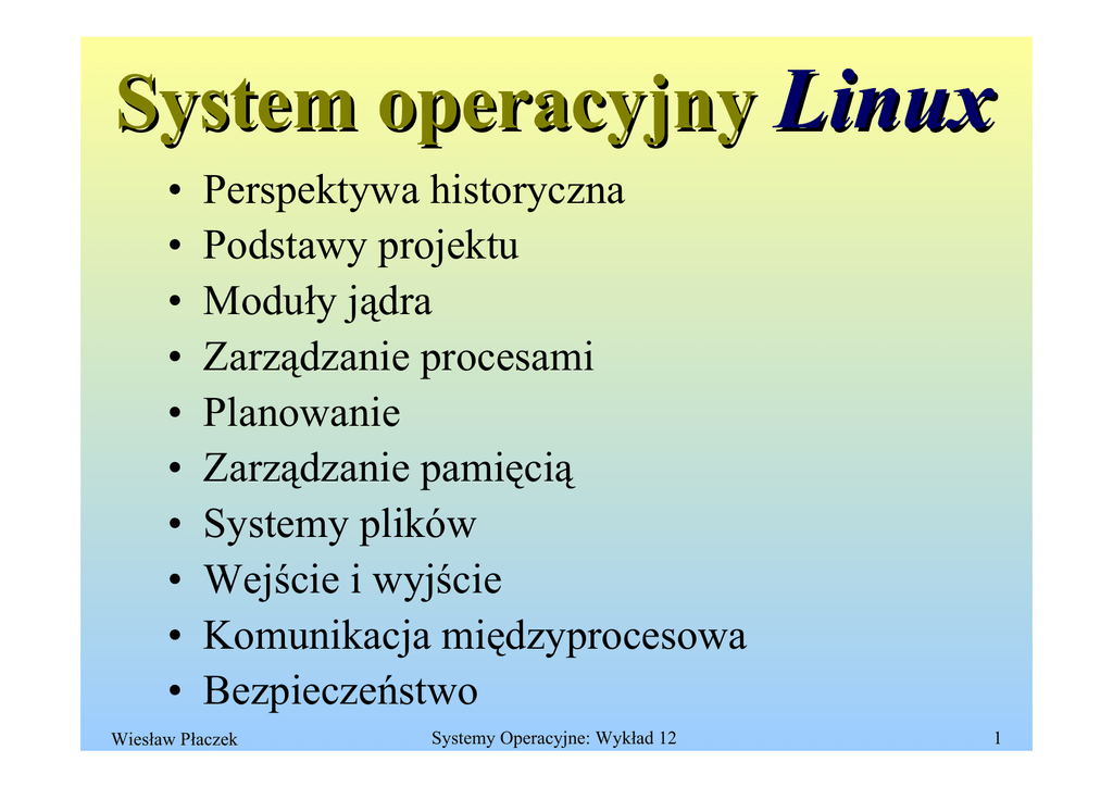 System operacyjny Linux • • • • • • • • • • Perspektywa historyczna Podstawy projektu Moduły jądra Zarządzanie procesami Planowanie Zarządzanie pamięcią Systemy plików Wejście i wyjście Komunikacja międzyprocesowa Bezpieczeństwo Wiesław Płaczek Systemy Operacyjne: Wykład 12 1 Perspektywa historyczna • 1969: 1-sza wersja systemu UNIX opracowana przez Kena Thompsona w Bell Labs (AT&T) dla minikomputera PDP-7. • 1973: 3-cia wersja systemu UNIX napisana w języku C przez Kena Thompsona i Dennisa Richiego (autor języka C) → przenośność! • Ważniejsze odmiany systemu UNIX: System V wersja 4 (SVR4) – wersja opracowana przez AT&T. BSD (Berkeley Software Distribution) – odmiana opracowana przez University of California w Berkeley; najnowsza wersja: FreeBSD. Solaris – system operacyjny firmy Sun Microsystems, oparty o SVR4 i BSD; najbardziej rozpowszechniona komercyjna implementacja Uniksa. Linux – system operacyjny oparty na SVR4 i 4.3BSD, ale jądro całkowicie oryginalne, napisane niezależnie; najpopularniejsza obecnie odmiana Uniksa. • 1991: Linus Torvalds, student informatyki Uniwersytetu w Helsinkach, napisał małe, lecz kompletne jądro systemu operacyjnego dla 32-bitowego procesora Intel 80386, który nazwał Linux. Kod źródłowy Linuxa został od razu udostępniony bezpłatnie w sieci Internet, co spowodowało, że do jego dalszego rozwoju włączyło się wielu użytkowników z całego świata – taki rozwój systemu trwa do dziś. Część elementów systemu została zapożyczona z innych projektów (np. GNU). Wiesław Płaczek Systemy Operacyjne: Wykład 12 2 Licencja i rozpowszechnianie Linuxa • Jądro systemu Linux jest rozpowszechniane w ramach licencji GNU General Public Licence (GPL), określonej przez konsorcjum Free Software Foundation (FSF), jako tzw. oprogramowanie w wolnym obiegu (free software). Zakaz prywatyzacji produktów powstałych z wykorzystaniem Linuxa lub pochodnych systemu (tzn. odmian zachowujących standardy Linuxa). Oprogramowanie nie może być redystrybuowane w formie czysto binarnej – wraz z każdą dystrybucją binarną musi być udostępniony kod źródłowy. • Dystrybucje Linuxa: Standardowe, prekompilowane zbiory pakietów, zwane dystrybucjami, zawierają podstawowy system Linux, narzędzia do instalowania systemu i zarządzania nim oraz gotowe do instalowania pakiety typowych narzędzi systemu UNIX. Pierwsze dystrybucje zarządzały pakietami jedynie przez dostarczanie środków do rozpakowywania wszystkich plików w odpowiednie miejsca; współczesne dystrybucje zawierają zawansowane zarządzanie pakietami. Większość obecnych dystrybucji stosuje lub przynajmniej rozpoznaje pakiety plików RPM – ułatwiające instalację, rozbudowę i usuwanie oprogramowania. Wczesne dystrybucje: SLS, Slackware. Popularne dystrybucje: RedHat, Debian, SuSE, Caldera, Fedora itd. Wiesław Płaczek Systemy Operacyjne: Wykład 12 3 Podstawy projektu • Linux jest wielodostępnym (multiuser), wielozadaniowym (multitasking) systemem operacyjnym z pełnym zestawem narzędzi zgodnych z systemem UNIX. • System plików Linuxa jest zgodny z tradycyjną semantyką uniksową. • Linux realizuje w pełni sieciowy standard systemu UNIX. • Głównymi celami projektowymi są: szybkość, wydajność i standaryzacja. • Linux został zaprojektowany tak, aby pozostawał w zgodzie z istotnymi dokumentami standardu POSIX (zbiór specyfikacji dotyczących wspólnych własności systemu operacyjnego); co najmniej dwie dystrybucje Linuxa zdobyły oficjalne certyfikaty komitetu normalizacyjnego POSIX. • Interfejs programisty w systemie Linux odpowiada semantyce systemu SVR4 UNIX, a nie zachowaniu systemu BSD – do realizacji semantyki BSD w miejscach, gdzie oba sposoby działania istotnie się różnią, służy oddzielny zbiór bibliotek. Wiesław Płaczek Systemy Operacyjne: Wykład 12 4 Składowe systemu Linux Programy zarządzania systemem Procesy użytkowe Pomocnicze programy użytkowe Kompilatory Wspólne biblioteki systemu Jądro Linux Ładowalne moduły jądra System Linux składa się z trzech głównych fragmentów kodu: • Jądro: jest odpowiedzialne za realizację wszystkich istotnych abstrakcji systemu operacyjnego. Kod jądra jest wykonywany w trybie jądra (kernel mode) z pełnym dostępem do wszystkich fizycznych zasobów komputera. Cały kod jądra ze wszystkimi strukturami danych przebywa w tej samej pojedynczej przestrzeni adresowej • • Biblioteki systemowe: Definiują standardowy zbiór funkcji, za pomocą których aplikacje mogą współpracować z jądrem i które realizują wiele właściwości systemu operacyjnego nie wymagających pełnych przywilejów kodu jądra. Pomoce systemowe: wykonują osobne, specjalizowane zadania administracyjne. Wiesław Płaczek Systemy Operacyjne: Wykład 12 5 Moduły jądra • Moduły jądra są to części kodu jądra, które mogą być kompilowane, ładowane i usuwane niezależnie od reszty jądra. • Moduł jądra zazwyczaj steruje pracą urządzenia, systemem plików lub protokołem sieciowym. • Moduły jądra są przydatne z następujących powodów: W celu dodania nowych właściwości do jądra wystarczy napisać nowy moduł jądra i korzystać z niego bez przebudowy całego jądra. Interfejs modułów jądra umożliwia osobom postronnym pisanie i rozpowszechnianie na własnych zasadach modułów sterujących urządzeń lub systemów plików, których nie można rozpowszechniać na zasadach licencji GPL. Moduły jądra pozwalają na zestawianie systemu Linux z minimalnym, standardowym jądrem bez wbudowywania w nie żadnych dodatkowych modułów sterujących urządzeń. • Moduły jądra są wspomagane przez trzy następujące składowe: Zarządzanie modułami (module management); Rejestracja modułów sterujących (driver registration); Mechanizm rozwiązywania konfliktów (conflict resolution). Wiesław Płaczek Systemy Operacyjne: Wykład 1