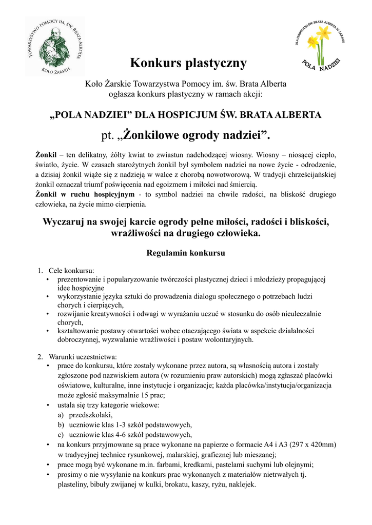 Konkurs plastyczny Koło Żarskie Towarzystwa Pomocy im. św. Brata Alberta ogłasza konkurs plastyczny w ramach akcji: „POLA NADZIEI” DLA HOSPICJUM ŚW. BRATA ALBERTA pt. „Żonkilowe ogrody nadziei”. Żonkil – ten delikatny, żółty kwiat to zwiastun nadchodzącej wiosny. Wiosny – niosącej ciepło, światło, życie. W czasach starożytnych żonkil był symbolem nadziei na nowe życie - odrodzenie, a dzisiaj żonkil wiąże się z nadzieją w walce z chorobą nowotworową. W tradycji chrześcijańskiej żonkil oznaczał triumf poświęcenia nad egoizmem i miłości nad śmiercią. Żonkil w ruchu hospicyjnym - to symbol nadziei na chwile radości, na bliskość drugiego człowieka, na życie mimo cierpienia. Wyczaruj na swojej karcie ogrody pełne miłości, radości i bliskości, wrażliwości na drugiego człowieka. Regulamin konkursu 1. Cele konkursu: • prezentowanie i popularyzowanie twórczości plastycznej dzieci i młodzieży propagującej idee hospicyjne • wykorzystanie języka sztuki do prowadzenia dialogu społecznego o potrzebach ludzi chorych i cierpiących, • rozwijanie kreatywności i odwagi w wyrażaniu uczuć w stosunku do osób nieuleczalnie chorych, • kształtowanie postawy otwartości wobec otaczającego świata w aspekcie działalności dobroczynnej, wyzwalanie wrażliwości i postaw wolontaryjnych. 2. Warunki uczestnictwa: • prace do konkursu, które zostały wykonane przez autora, są własnością autora i zostały zgłoszone pod nazwiskiem autora (w rozumieniu praw autorskich) mogą zgłaszać placówki oświatowe, kulturalne, inne instytucje i organizacje; każda placówka/instytucja/organizacja może zgłosić maksymalnie 15 prac; • ustala się trzy kategorie wiekowe: a) przedszkolaki, b) uczniowie klas 1-3 szkół podstawowych, c) uczniowie klas 4-6 szkół podstawowych, • na konkurs przyjmowane są prace wykonane na papierze o formacie A4 i A3 (297 x 420mm) w tradycyjnej technice rysunkowej, malarskiej, graficznej lub mieszanej; • prace mogą być wykonane m.in. farbami, kredkami, pastelami suchymi lub olejnymi; • prosimy o nie wysyłanie na konkurs prac wykonanych z materiałów nietrwałych tj. plasteliny, bibuły zwijanej w kulki, brokatu, kaszy, ryżu, naklejek. 3. Pozostałe informacje: • każda praca powinna zostać czytelnie opisana, należy podać: imię i nazwisko autora, wiek i kategorię wiekową, telefon kontaktowy, nazwę i adres placówki/instytucji/organizacji, telefon kontaktowy, e-mail, imię i nazwisko nauczyciela/opiekuna; • prace należy dostarczyć do dnia 9 maja 2016 r. do siedziby Hospicjum św. Brata Alberta, ul. Pszenna 2, 68-200 Żary (teren Szpitala na Wyspie); • Termin podsumowania konkursu – wystawa 22.05.2015 (o wynikach, godzinie i miejscu wystawy powiadomimy laureatów telefonicznie lub drogą elektroniczną). Uwagi końcowe: • Prace zgłoszone do konkursu przechodzą na własność organizatora. • Organizator zastrzega sobie prawo prezentacji, publikacji i reprodukowania prac konkursowych w prasie, w Internecie oraz wykorzystania ich w inny sposób w celach promocyjnych organizatora, bez wypłacania honorariów autorskich. • Udział w konkursie jest równoznaczny z akceptacją warunków regulaminu oraz zgodą na przetwarzanie danych osobowych przez uczestnika konkursu lub w przypadku osób niepełnoletnich przez ich prawnych opiekunów dla potrzeb promocyjnych zgodnie z Ustawą o ochronie danych osobowych z dn. 29.08.1997r. (Dz. U. z 2015 r. poz. 2135, z późn. zm.). • Organizator nie odpowiada za uszkodzenia lub zniszczenia prac podczas przesyłania lub transportu. Informacji w sprawie konkursu udzielają: Agnieszka Fetzka – koordynator wolontariatu Hospicjum oraz Małgorzata Rusak – lider wolontariatu akcyjnego Hospicjum: poprzez e-mail: [email protected] poprzez facebook: Hospicjum św. Brata Alberta w Żarach telefonicznie: 68 475 76 48, 531 939 016 lub osobiście w siedzibie Hospicjum św. Brata Alberta w Żarach ul. Pszenna 2 (teren „Szpitala na Wyspie”), w każdy poniedziałek w godzinach 11:00 - 15:30