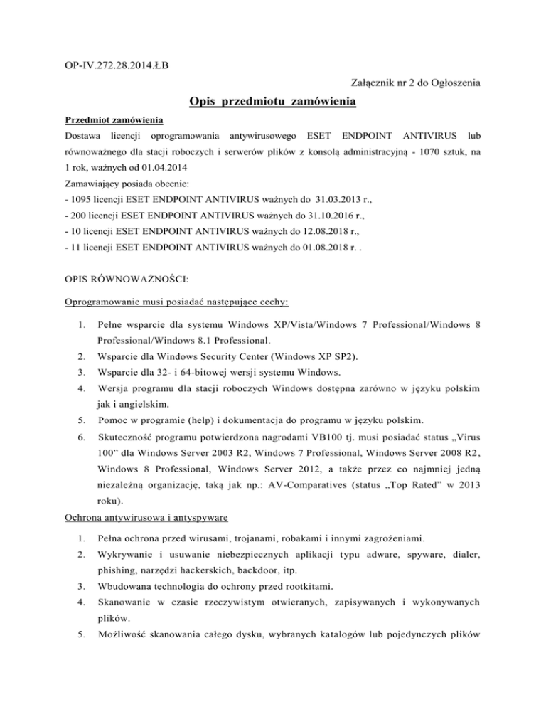 OP-IV.272.28.2014.ŁB Załącznik nr 2 do Ogłoszenia Opis przedmiotu zamówienia Przedmiot zamówienia Dostawa licencji oprogramowania antywirusowego ESET ENDPOINT ANTIVIRUS lub równoważnego dla stacji roboczych i serwerów plików z konsolą administracyjną - 1070 sztuk, na 1 rok, ważnych od 01.04.2014 Zamawiający posiada obecnie: - 1095 licencji ESET ENDPOINT ANTIVIRUS ważnych do 31.03.2013 r., - 200 licencji ESET ENDPOINT ANTIVIRUS ważnych do 31.10.2016 r., - 10 licencji ESET ENDPOINT ANTIVIRUS ważnych do 12.08.2018 r., - 11 licencji ESET ENDPOINT ANTIVIRUS ważnych do 01.08.2018 r. . OPIS RÓWNOWAŻNOŚCI: Oprogramowanie musi posiadać następujące cechy: 1. Pełne wsparcie dla systemu Windows XP/Vista/Windows 7 Professional/Windows 8 Professional/Windows 8.1 Professional. 2. Wsparcie dla Windows Security Center (Windows XP SP2). 3. Wsparcie dla 32- i 64-bitowej wersji systemu Windows. 4. Wersja programu dla stacji roboczych Windows dostępna zarówno w języku polskim jak i angielskim. 5. Pomoc w programie (help) i dokumentacja do programu w języku polskim. 6. Skuteczność programu potwierdzona nagrodami VB100 tj. musi posiadać status „Virus 100” dla Windows Server 2003 R2, Windows 7 Professional, Windows Server 2008 R2 , Windows 8 Professional, Windows Server 2012, a także przez co najmniej jedną niezależną organizację, taką jak np.: AV-Comparatives (status „Top Rated” w 2013 roku). Ochrona antywirusowa i antyspyware 1. Pełna ochrona przed wirusami, trojanami, robakami i innymi zagrożeniami. 2. Wykrywanie i usuwanie niebezpiecznych aplikacji typu adware, spyware, dialer, phishing, narzędzi hackerskich, backdoor, itp. 3. Wbudowana technologia do ochrony przed rootkitami. 4. Skanowanie w czasie rzeczywistym otwieranych, zapisywanych i wykonywanych plików. 5. Możliwość skanowania całego dysku, wybranych katalogów lub pojedynczych plików „na żądanie” lub według harmonogramu. 6. System ma oferować administratorowi możliwość definiowania zadań w harmonogramie w taki sposób, aby zadanie przed wykonaniem sprawdza ło czy komputer pracuje na zasilaniu bateryjnym i jeśli tak - nie wykonywało danego zadania. 7. Możliwość utworzenia wielu różnych zadań skanowania według harmonogramu (w tym: co godzinę, po zalogowaniu i po uruchomieniu komputera). Każde zadanie ma mieć możliwość uruchomienia z innymi ustawieniami (czyli met ody skanowania, obiekty skanowania, czynności, rozszerzenia przeznaczone do skanowania, priorytet skanowania). 8. Skanowanie „na żądanie” pojedynczych plików lub katalogów przy pomocy skrótu w menu kontekstowym. 9. Możliwość uruchomienia skanowania w tle z niskim priorytetem. 10. Możliwość skanowania dysków sieciowych i dysków przenośnych. 11. Skanowanie plików spakowanych i skompresowanych. 12. Możliwość definiowania listy rozszerzeń plików, które mają być skanowane (w tym z uwzględnieniem plików bez rozszerzeń). 13. Możliwość umieszczenia na liście wyłączenia ze skanowania wybranych plików, katalogów lub plików o określonych rozszerzeniach. 14. Możliwość automatycznego wyłączenia komputera po zakończonym skanowaniu. 15. Brak konieczności ponownego uruchomienia (restartu) komputera po instalacji programu. 16. Użytkownik musi posiadać możliwość tymczasowego wyłączenia ochrony na czas co najmniej 10 min lub do ponownego uruchomienia komputera. 17. W momencie tymczasowego wyłączenia ochrony antywirusowej użytkownik musi być poinformowany o takim fakcie odpowiednim powiadomieniem i informacją w interfejsie aplikacji. 18. Ponowne włączenie ochrony antywirusowej nie może wymagać od użytkownika ponownego uruchomienia komputera. 19. Możliwość przeniesienia zainfekowanych plików i załączników poczty w bezpieczny obszar dysku (do katalogu kwarantanny) w celu dalszej kontroli. Pliki muszą być przechowywane w katalogu kwarantanny w postaci zaszyfrowanej. 20. Wbudowany konektor dla programów MS Outlook, Outlook Express, Windows Mail, Mozilla Thunderbird i Windows Live Mail (funkcje programu dostępne są bezpośrednio z menu programu pocztowego). 21. Skanowanie i oczyszczanie w czasie rzeczywistym poczty przychodzącej i wychodzącej obsługiwanej przy pomocy programów MS Outlook, Outlook Express, Windows Mail, Mozilla Thunderbird i Windows Live Mail. OP-IV.272.28.2014.ŁB Załącznik nr 2 do Ogłoszenia Strona 2 z 13 22. Skanowanie i oczyszczanie poczty przychodzącej POP3 i IMAP „w locie” (w czasie rzeczywistym), zanim zostanie dostarczona do klienta pocztowego zainstalowanego na stacji roboczej (niezależnie od konkretnego klienta pocztowego). 23. Automatyczna integracja skanera POP3 i IMAP z dowolnym klientem pocztowym bez konieczności zmian w konfiguracji. 24. Możliwość definiowania różnych portów dla POP3 i IMAP, na których ma odbywać si ę skanowanie. 25. Możliwość opcjonalnego dołączenia informacji o przeskanowaniu zainfekowanych wiadomości e-mail. 26. Skanowanie ruchu HTTP na poziomie stacji roboczych. Zainfekowany ruch jest automatycznie blokowany, a użytkownikowi wyświetlane jest stosowne powiadomienie. 27. Automatyczna integracja z dowolną przeglądarką internetową bez konieczności zmian w konfiguracji. 28. Możliwość definiowania różnych portów dla HTTP, na których ma odbywać si ę skanowanie. 29. Program ma umożliwiać skanowanie ruchu sieciowego wewnątrz szyfrowanych protokołów HTTPS, POP3S, IMAPS. 30. Program ma zapewniać skanowanie ruchu HTTPS transparentnie bez potrzeby konfiguracji zewnętrznych aplikacji takich jak przeglądarki Web lub programy pocztowe. 31. Administrator ma mieć możliwość zdefiniowania portów TCP, na których aplikacja będzie realizowała proces skanowania ruchu szyfrowanego. 32. Aplikacja musi posiadać funkcjonalność, która na bieżąco będzie odpytywać serwery producenta o znane i bezpieczne procesy uruchomione na komputerze użytkownika. 33. Procesy zweryfiko