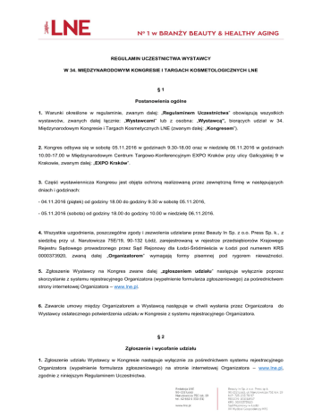 REGULAMIN UCZESTNICTWA WYSTAWCY W 34. MIĘDZYNARODOWYM KONGRESIE I TARGACH KOSMETOLOGICZNYCH LNE §1 Postanowienia ogólne 1. Warunki określone w regulaminie, zwanym dalej: „Regulaminem Uczestnictwa” obowiązują wszystkich wystawców, zwanych dalej łącznie: „Wystawcami” lub z osobna: „Wystawcą”, biorących udział w 34. Międzynarodowym Kongresie i Targach Kosmetycznych LNE (zwanym dalej: „Kongresem”). 2. Kongres odbywa się w sobotę 05.11.2016 w godzinach 9.30-18.00 oraz w niedzielę 06.11.2016 w godzinach 10.00-17.00 w Międzynarodowym Centrum Targowo-Konferencyjnym EXPO Kraków przy ulicy Galicyjskiej 9 w Krakowie, zwanym dalej: „EXPO Kraków”. 3. Część wystawiennicza Kongresu jest objęta ochroną realizowaną przez zewnętrzną firmę w następujących dniach i godzinach: - 04.11.2016 (piątek) od godziny 18.00 do godziny 9.30 w sobotę 05.11.2016, - 05.11.2016 (sobota) od godziny 18.00 do godziny 10.00 w niedzielę 06.11.2016. 4. Wszystkie uzgodnienia, poszczególne zgody i zezwolenia udzielane przez Beauty In Sp. z o.o. Press Sp. k., z siedzibą przy ul. Narutowicza 75E/19, 90-132 Łódź, zarejestrowaną w rejestrze przedsiębiorców Krajowego Rejestru Sądowego prowadzonego przez Sąd Rejonowy dla Łodzi-Śródmieścia w Łodzi pod numerem KRS 0000373920, zwaną dalej „Organizatorem” wymagają formy pisemnej pod rygorem nieważności. 5. Zgłoszenie Wystawcy na Kongres zwane dalej „zgłoszeniem udziału” następuje wyłącznie poprzez skorzystanie z systemu rejestracyjnego Organizatora (wypełnienie formularza zgłoszeniowego) za pośrednictwem strony internetowej Organizatora – www.lne.pl. 6. Zawarcie umowy między Organizatorem a Wystawcą następuje w chwili wysłania przez Organizatora do Wystawcy ostatecznego potwierdzenia udziału w Kongresie z systemu rejestracyjnego Organizatora. §2 Zgłoszenie i wycofanie udziału 1. Zgłoszenie udziału Wystawcy w Kongresie następuje wyłącznie za pośrednictwem systemu rejestracyjnego Organizatora (wypełnienie formularza zgłoszeniowego) na stronie internetowej Organizatora – www.lne.pl, zgodnie z niniejszym Regulaminem Uczestnictwa. 2. Warunkiem uczestnictwa w Kongresie jest otrzymanie przez Wystawcę potwierdzenia udziału z systemu rejestracyjnego Organizatora oraz uiszczenie umówionych opłat w wyznaczonych terminach, wskazanych w fakturach proforma otrzymanych od Organizatora z systemu rejestracyjnego Organizatora. Potwierdzenie udziału wysyłane jest z systemu rejestracyjnego Organizatora po potwierdzeniu przez Wystawcę lokalizacji w zgłoszeniu online. W przypadku nieuiszczenia przez Wystawcę całości opłat, o których mowa w zdaniu pierwszym, Organizator może wstrzymać dopuszczenie Wystawcy do uczestnictwa w Kongresie do czasu ich uiszczenia. Wstrzymanie dopuszczenia Wystawcy do uczestnictwa w Kongresie do czasu uiszczenia opłat, o których mowa powyżej, nie stanowi zwolnienia Wystawcy z obowiązku uiszczenia brakujących opłat oraz nie może stanowić podstawy roszczeń odszkodowawczych Wystawcy względem Organizatora. 3. Organizator zastrzega sobie prawo odmowy przyjęcia zgłoszenia udziału Wystawcy w Kongresie z różnych względów (w szczególności, lecz nie wyłącznie z powodu niezgodności oferty Wystawcy z tematyką imprezy, wyczerpania zaplecza wystawienniczego). Odmowa przyjęcia zgłoszenia udziału Wystawcy może nastąpić w sposób dorozumiany poprzez brak wysłania z systemu rejestracyjnego Organizatora potwierdzenia udziału lub też poprzez wysłanie przez Organizatora na adres e-mail Wystawcy wskazany w zgłoszeniu udziału informacji o braku możliwości przyjęcia zgłoszenia udziału Wystawcy. Informacja może, ale nie musi, wskazywać przyczynę odmowy przyjęcia zgłoszenia udziału Wystawcy. 4. Zgłoszenie uczestnictwa za pośrednictwem systemu rejestracyjnego na stronie internetowej Organizatora (wypełnienie formularza zgłoszeniowego) oznacza wyrażenie zgody na warunki wynikające z niniejszego Regulaminu Uczestnictwa, który zostaje tym samym przyjęty przez Wystawcę i stanowi integralną część umowy zawartej między Organizatorem i Wystawcą, o której mowa w § 1 ust. 6 (nie wymagany jest tradycyjny podpis na zgłoszeniu uczestnictwa). 5. Wszelkie zmiany dotyczące zgłoszenia udziału Wystawca wprowadza za pośrednictwem systemu rejestracyjnego na stronie internetowej Organizatora. Zmiany, o których mowa w zdaniu poprzedzającym, mogą być wprowadzane przez Wystawcę do czasu otrzymania od Organizatora potwierdzenia udziału, o którym mowa w ust. 2. 6. Ani Regulamin Uczestnictwa ani udostępnienie przez Organizatora Wystawcom systemu rejestracyjnego celem dokonywania zgłoszeń udziału nie stanowią oferty ze strony Organizatora w rozumieniu art. 66 i następnych kodeksu cywilnego. O przyjęciu zgłoszenia udziału w Kongresie złożonego przez Wystawcę decyduje Organizator i dopiero jego potwierdzenie, o którym mowa w ust. 2 jest równoznaczne z zawarciem umowy z Wystawcą na warunkach określonych w zgłoszeniu udziału, potwierdzeniu udziału oraz w niniejszym Regulaminie Uczestnictwa. 7. Organizator jest upoważniony, lecz nie zobowiązany, do odstąpienia od umowy, jeżeli w ustalonych terminach, o których mowa w ust. 2, nie zostały w pełni uiszczone wszystkie opłaty za udział w Kongresie lub jeśli nie zostaną spełnione pozostałe warunki Regulaminu Uczestnictwa poprzez oświadczenie wysłane do Wystawcy w formie pisemnej listem poleconym na adres Wystawcy wskazany w zgłoszeniu udziału lub mailowo na adres e- mail Wystawcy wskazany w zgłoszeniu udziału nie później niż w terminie 7 dni przed dniem rozpoczęcia Kongresu, o którym mowa w § 1 ust. 2. W przypadku odstąpienia od umowy przez Organizatora, Wystawca zwolniony jest z obowiązku dokonania zapłaty brakującej części opłat za udział w Kongresie na rzecz Organizatora, a w przypadku gdy część w/w opłat została już przez Wystawcę dokonana, O