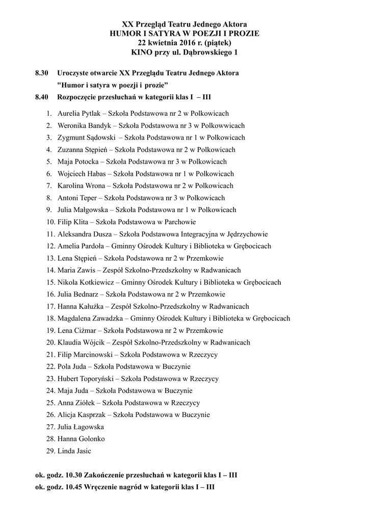 XX Przegląd Teatru Jednego Aktora HUMOR I SATYRA W POEZJI I PROZIE 22 kwietnia 2016 r. (piątek) KINO przy ul. Dąbrowskiego 1 8.30 Uroczyste otwarcie XX Przeglądu Teatru Jednego Aktora "Humor i satyra w poezji i prozie” 8.40 Rozpoczęcie przesłuchań w kategorii klas I – III 1. Aurelia Pytlak – Szkoła Podstawowa nr 2 w Polkowicach 2. Weronika Bandyk – Szkoła Podstawowa nr 3 w Polkowwicach 3. Zygmunt Sądowski – Szkoła Podstawowa nr 1 w Polkowicach 4. Zuzanna Stępień – Szkoła Podstawowa nr 2 w Polkowicach 5. Maja Potocka – Szkoła Podstawowa nr 3 w Polkowicach 6. Wojciech Habas – Szkoła Podstawowa nr 1 w Polkowicach 7. Karolina Wrona – Szkoła Podstawowa nr 2 w Polkowicach 8. Antoni Teper – Szkoła Podstawowa nr 3 w Polkowicach 9. Julia Małgowska – Szkoła Podstawowa nr 1 w Polkowicach 10. Filip Klita – Szkoła Podstawowa w Parchowie 11. Aleksandra Dusza – Szkoła Podstawowa Integracyjna w Jędrzychowie 12. Amelia Pardoła – Gminny Ośrodek Kultury i Biblioteka w Grębocicach 13. Lena Stępień – Szkoła Podstawowa nr 2 w Przemkowie 14. Maria Zawis – Zespół Szkolno-Przedszkolny w Radwanicach 15. Nikola Kotkiewicz – Gminny Ośrodek Kultury i Biblioteka w Grębocicach 16. Julia Bednarz – Szkoła Podstawowa nr 2 w Przemkowie 17. Hanna Kałużka – Zespół Szkolno-Przedszkolny w Radwanicach 18. Magdalena Zawadzka – Gminny Ośrodek Kultury i Biblioteka w Grębocicach 19. Lena Ciżmar – Szkoła Podstawowa nr 2 w Przemkowie 20. Klaudia Wójcik – Zespół Szkolno-Przedszkolny w Radwanicach 21. Filip Marcinowski – Szkoła Podstawowa w Rzeczycy 22. Pola Juda – Szkoła Podstawowa w Buczynie 23. Hubert Toporyński – Szkoła Podstawowa w Rzeczycy 24. Maja Juda – Szkoła Podstawowa w Buczynie 25. Anna Ziółek – Szkoła Podstawowa w Rzeczycy 26. Alicja Kasprzak – Szkoła Podstawowa w Buczynie 27. Julia Łagowska 28. Hanna Golonko 29. Linda Jasic ok. godz. 10.30 Zakończenie przesłuchań w kategorii klas I – III ok. godz. 10.45 Wręczenie nagród w kategorii klas I – III 11.00 Rozpoczęcie przesłuchań w kategorii klas IV – VI 1. Joanna Klimaszewska – Szkoła Podstawowa w Parchowie 2. Dominik Starak – Szkoła Podstawowa Integracyjna w Jędrzychowie 3. Dominika Kulik – Gminny Ośrodek Kultury i Biblioteka w Grębocicach 4. Weronika Stodółka – Szkoła Podstawowa w Parchowie 5. Sylwia Kobzda – Zespół Szkolno-Przedszkolny w Radwanicach 6. Oliwia Myślińska – Gminny Ośrodek Kultury i Biblioteka w Grębocicach 7. Alicja Gniedziejko – Szkoła Podstawowa w Parchowie 8. Nikodem Bogoń – Zespół Szkolno-Przedszkolny w Radwanicach 9. Mateusz Jaskółka – Szkoła Podstawowa w Rzeczycy 10. Zuzanna Niemiec – Szkoła Podstawowa w Buczynie 11. Konrad Wójcik – Zespół Szkolno-Przedszkolny w Radwanicach 12. Magda Bełza – Zespół Szkół w Białołęce 13. Joanna Grabowska – Szkoła Podstawowa w Buczynie 14. Mikołaj Kałużka – Zespół Szkolno-Przedszkolny w Radwanicach 15. Patrycja Laszczowska – Zespół Szkół w Białołęce 16. Olaf Maksymczak – Szkoła Podstawowa w Buczynie 17. Karolina Puźniecka – Szkoła Podstawowa nr 1 w Polkowicach 18. Weronika Zolebiak – Szkoła Podstawowa w Chocianowie 19. Jakub Majgier – Szkoła Podstawowa nr 2 w Polkowicach 20. Karolina Smereczniak – Szkoła Podstawowa nr 1 w Polkowicach 21. Szymon Najdek – Szkoła Podstawowa w Chocianowie 22. Weronika Widuch – Szkoła Podstawowa nr 2 w Polkowicach 23. Nikola Cyran – Szkoła Podstawowa nr 1 w Polkowicach 24. Ignacy Urbańczyk – Szkoła Podstawowa w Chocianowie 25. Miłosz Machnicki – Szkoła Podstawowa nr 2 w Polkowicach 26. Wiktoria Rozek – Szkoła Podstawowa nr 1 w Polkowicach 27. Aleksandra Tkaczyk – Szkoła Podstawowa w Chocianowie 28. Bartłomiej Bucyk – Szkoła Podstawowa nr 2 w Polkowicach 29. Katarzyna Bajbo – Szkoła Podstawowa nr 1 w Polkowicach 30. Tomasz Ratka – Szkoła Podstawowa nr 2 w Polkowicach ok. godz. 13.10 Zakończenie przesłuchań w kategorii klas IV – VI ok. godz. 13.30 Wręczenie nagród w kategorii klas IV – VI 13.50 Rozpoczęcie przesłuchań w kategorii klas gimnazjalnych 1. Marcin Tatarynowicz – Gimnazjum nr 1 w Polkowicach 2. Paulina Gil – Gminny Ośrodek Kultury i Biblioteka w Grębocicach 3. Kinga Łojek – Gimnazjum w Jerzmanowej 4. Katarzyna Pietruszewska – Gimnazjum w Chocianowie 5. Anna Musiał – Gimnazjum nr 1 w Polkowicach 6. Kornelia Kopacka – Gimnazjum w Radwanicach 7. Amadeusz Jankowski – Zespół Szkół w Białołęce 8. Elżbieta Krakowska – Gimnazjum nr 2 w Polkowicach 9. Adrianna Kowalska – Gimnazjum w Chocianowie 10. Weronika Laszczyńska – Gimnazjum nr 1 w Polkowicach 11. Edyta Kulig – Gimnazjum w Radwanicach 12. Karolina Woźniak – Zespół Szkół w Białołęce 13. Julia Macioszczyk – Gimnazjum nr 2 w Polkowicach 14. Aleksadra Bator – Gimnazjum w Chocianowie 15. Ada Uchryńczuk – Gimnazjum nr 1 w Polkowicach ok. godz. 15.20 Zakończenie przesłuchań w kategorii klas gimnazjalnych ok. godz. 15.20 Rozpoczęcie przesłuchań we kategorii klas ponadgimnazjalnych 1. Anna Itkowiak 2. Dariusz Rystwej ok. godz. 15.35 Zakończenie przesłuchań w kategorii klas ponadgimnazjalnych ok. godz. 15.50 Wręczenie nagród w kategoriach klas gimnazjalnych i ponadgimnazjalnych oraz wręczenie nagrody Grand Prix