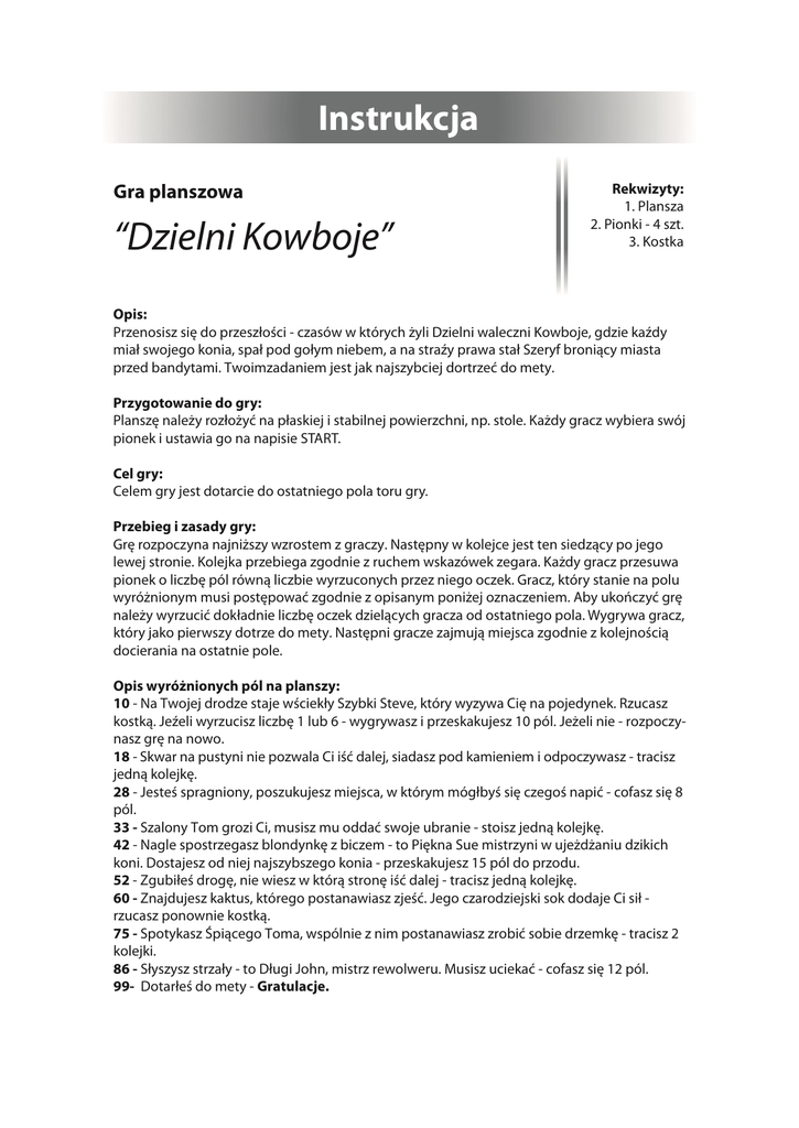 Instrukcja Gra planszowa “Dzielni Kowboje” Rekwizyty: 1. Plansza 2. Pionki - 4 szt. 3. Kostka Opis: Przenosisz się do przeszłości - czasów w których żyli Dzielni waleczni Kowboje, gdzie kaźdy miał swojego konia, spał pod gołym niebem, a na straźy prawa stał Szeryf broniący miasta przed bandytami. Twoimzadaniem jest jak najszybciej dortrzeć do mety. Przygotowanie do gry: Planszę należy rozłożyć na płaskiej i stabilnej powierzchni, np. stole. Każdy gracz wybiera swój pionek i ustawia go na napisie START. Cel gry: Celem gry jest dotarcie do ostatniego pola toru gry. Przebieg i zasady gry: Grę rozpoczyna najniższy wzrostem z graczy. Następny w kolejce jest ten siedzący po jego lewej stronie. Kolejka przebiega zgodnie z ruchem wskazówek zegara. Każdy gracz przesuwa pionek o liczbę pól równą liczbie wyrzuconych przez niego oczek. Gracz, który stanie na polu wyróżnionym musi postępować zgodnie z opisanym poniżej oznaczeniem. Aby ukończyć grę należy wyrzucić dokładnie liczbę oczek dzielących gracza od ostatniego pola. Wygrywa gracz, który jako pierwszy dotrze do mety. Następni gracze zajmują miejsca zgodnie z kolejnością docierania na ostatnie pole. Opis wyróżnionych pól na planszy: 10 - Na Twojej drodze staje wściekły Szybki Steve, który wyzywa Cię na pojedynek. Rzucasz kostką. Jeźeli wyrzucisz liczbę 1 lub 6 - wygrywasz i przeskakujesz 10 pól. Jeżeli nie - rozpoczynasz grę na nowo. 18 - Skwar na pustyni nie pozwala Ci iść dalej, siadasz pod kamieniem i odpoczywasz - tracisz jedną kolejkę. 28 - Jesteś spragniony, poszukujesz miejsca, w którym mógłbyś się czegoś napić - cofasz się 8 pól. 33 - Szalony Tom grozi Ci, musisz mu oddać swoje ubranie - stoisz jedną kolejkę. 42 - Nagle spostrzegasz blondynkę z biczem - to Piękna Sue mistrzyni w ujeżdżaniu dzikich koni. Dostajesz od niej najszybszego konia - przeskakujesz 15 pól do przodu. 52 - Zgubiłeś drogę, nie wiesz w którą stronę iść dalej - tracisz jedną kolejkę. 60 - Znajdujesz kaktus, którego postanawiasz zjeść. Jego czarodziejski sok dodaje Ci sił rzucasz ponownie kostką. 75 - Spotykasz Śpiącego Toma, wspólnie z nim postanawiasz zrobić sobie drzemkę - tracisz 2 kolejki. 86 - Słyszysz strzały - to Długi John, mistrz rewolweru. Musisz uciekać - cofasz się 12 pól. 99- Dotarłeś do mety - Gratulacje.