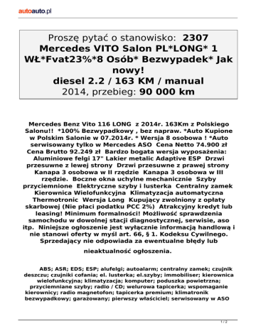 Proszę pytać o stanowisko: 2307 Mercedes VITO Salon PL*LONG* 1 WŁ*Fvat23%*8 Osób* Bezwypadek* Jak nowy! diesel 2.2 / 163 KM / manual 2014, przebieg: 90 000 km Mercedes Benz Vito 116 LONG z 2014r. 163Km z Polskiego Salonu!! *100% Bezwypadkowy , bez napraw. *Auto Kupione w Polskim Salonie w 07.2014r. * Wersja 8 osobowa ! *Auto serwisowany tylko w Mercedes ASO Cena Netto 74.900 zł Cena Brutto 92.249 zł Bardzo bogata wersja wyposażenia: Aluminiowe felgi 17" Lakier metalic Adaptive ESP Drzwi przesuwne z lewej strony Drzwi przesuwne z prawej strony Kanapa 3 osobowa w II rzędzie Kanapa 3 osobowa w III rzędzie. Boczne okna uchylne mechanicznie Szyby przyciemnione Elektryczne szyby i lusterka Centralny zamek Kierownica Wielofunkcyjna Klimatyzacja automatyczna Thermotronic Wersja Long Kupujący zwolniony z opłaty skarbowej (Nie płaci podatku PCC 2%) Atrakcyjny kredyt lub leasing! Minimum formalności! Możliwość sprawdzenia samochodu w dowolnej stacji diagnostycznej, serwisie, aso itp. Niniejsze ogłoszenie jest wyłącznie informacją handlową i nie stanowi oferty w myśl art. 66, § 1. Kodeksu Cywilnego. Sprzedający nie odpowiada za ewentualne błędy lub nieaktualność ogłoszenia. ABS; ASR; EDS; ESP; alufelgi; autoalarm; centralny zamek; czujnik deszczu; czujniki cofania; el. lusterka; el.szyby; immobiliser; kierownica wielofunkcyjna; klimatyzacja; komputer; poduszka powietrzna; przyciemniane szyby; radio / CD; welurowa tapicerka; wspomaganie kierownicy; radio magnetofon; tapicerka premium; klimatronik bezwypadkowy; garażowany; pierwszy właściciel; serwisowany w ASO 1/2 Cena: 74 999 PLN netto Opiekun: Krzysztof Kijewski +48 519 022 455 Al. Krakowska 178, Punkt C 2/2