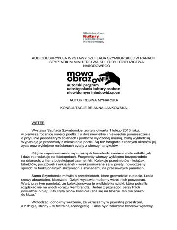 AUDIODESKRYPCJA WYSTAWY SZUFLADA SZYMBORSKIEJ W RAMACH STYPENDIUM MINITERSTWA KULTURY I DZIEDZICTWA NARODOWEGO AUTOR REGINA MYNARSKA KONSULTACJE DR ANNA JANKOWSKA. WSTĘP Wystawa Szuflada Szymborskiej została otwarta 1 lutego 2013 roku, w pierwszą rocznicę śmierci poetki. To dwa niewielkie i niewysokie pomieszczenia o przytulnie jasnoszarych ścianach i podłodze wyłożonej miękką, żółtą wykładziną. Wypełniają je przedmioty z mieszkania poetki. Są też fotografie z różnych okresów jej życia oraz wyklejone na ścianach cytaty z wierszy i artykułów. Zdjęcia zaprezentowane są w różnych formatach: zarówno małe odbitki, jak i duże reprodukcje na fototapetach. Fragmenty wierszy wyklejono bezpośrednio na ścianach, z liter z połyskującej czarnej folii. Kolekcje przedmiotów - książek, bibelotów, pocztówek i wyklejanek - wyeksponowane są w prosty, nowoczesny sposób: w funkcjonalnych skrzyniach z szufladami, na przesuwnych panelach. Sama Szymborska mówiła o przedmiotach, które gromadziła: rupiecie. Lubiła rzeczy absurdalne, kiczowate. Dzięki wystawie możemy wśród nich poszperać. Warto przy tym pamiętać, że kolekcjonowała je wielbicielka sztuki, która potrafiła rozpłakać się na widok obrazu Rembrandta. Jeden z przyjaciół, Jerzy Pilch powiedział o niej: „Kto czyta ojców kościoła i zna się na filozofii, ten ma prawo do kiczu.” Wchodząc, odnosimy wrażenie, że wkraczamy w prywatną przestrzeń, a z drugiej strony – w teatralną scenografię. Takie było założenie twórców wystawy. Ukazać świat Szymborskiej, „niefotogeniczny” – jak sama mawiała – warsztat poety, nie naruszając jego intymności. Spośród mebli z mieszkania noblistki umieszczono tu komodę, a także kanapę, stolik na kawę. Nie znajdziemy natomiast biurka, które wydaje się oczywiste w przypadku poetki. O tym, dlaczego tak się stało, opowiada wieloletni sekretarz Szymborskiej, Michał Rusinek: Ona nie miała gabinetu, to znaczy nie miała biurka, przy którym pracowała. Pisała zawsze w łóżku. Ale postawić w muzeum łóżko? Bez przesady… Zofia Gołubiew, dyrektor Muzeum Narodowego w Krakowie powiedziała, że: „ Szuflada Szymborskiej to miejsce nie będące ani rekonstrukcją jej mieszkania, ani izbą pamięci, a raczej wnętrzem urządzonym w bliskim Poetce nieco surrealnym duchu.”. Nasuwa się tu analogia dotycząca tego nurtu w sztuce. Twórca surrealizmu - Salvador Dali - malował często postacie, które w miejscu klatki piersiowej mają na wpół poodsuwane szufladki. Ponoć zainspirował go angielski idiom oznaczający komodę: “chest of drawers" - „klatka piersiowa z szufladami”. Wejście Jeszcze zanim wejdziemy na wystawę, powitają nas dwa elementy zapowiadające jej klimat. Znajdują się one na ścianach, po obu stronach szerokich drzwi. Na lewo od nich – tytuł Szuflada Szymborskiej oraz grafika w stylu retro przedstawiająca dłoń. Jej palec wskazuje kierunek wejścia. Na prawo od drzwi wyklejony na ścianie fragment wypowiedzi poetki z książki Anny Bikont i Joanny Szczęsnej pod tytułem „Pamiątkowe rupiecie”: „O widzę, że pani też docenia szufladę – ucieszyła się poetka. Dla mnie to jeden z najważniejszych wynalazków ludzkości. Pomnik by trzeba wystawić anonimowemu wynalazcy szuflady.” Pomiędzy niektórymi słowami cytatu umieszczono na wypukłych kasetonach sześć fotograficznych portretów poetki. Pochodzą one z różnych okresów życia: nastoletniego, wczesnej młodości i w pełni dojrzałości. 1. Drzewo genealogiczne Drzewo genealogiczne Wisławy Szymborskiej umieszczone jest bezpośrednio na ścianie. Zajmuje obszar wysoki na 2 metry, szeroki na 3. Ma nowoczesną, uproszczoną formę graficzną. Stanowi ją kompozycja, na którą składają się: wystające ze ściany, podświetlone od środka kostki z mlecznego szkła z naklejonymi czarno-białymi zdjęciami, naklejone na ścianie podpisy z imionami, nazwiskami, latami życia oraz pionowe linie w kolorze czerwonym, fioletowym, granatowym i zielonym. Linie prowadzą od rodziców do dzieci. Czarno-białe zdjęcia to wizerunki przodków noblistki. Są to pozowane portrety, starannie wykonywane w ówczesnych studiach fotograficznych. Niekiedy przedstawiają całą rodzinę, czasem – małżonków lub pojedyncze osoby. Panowie ubrani są w ciemne surduty, białe koszule ze sztywnymi kołnierzykami. Panie mają włosy ułożone w misterne fale lub koki, ubrane są w eleganckie suknie. Drzewo prezentuje 5 pokoleń. Zaczyna się na samym dole, tuż przy podłodze, od imion i nazwisk praprapradziadków Szymborskiej od strony matki. To Józef Rottermund, żyjący w latach 1720-1775 i Marianna Stojowska. Na samej górze drzewa genealogicznego znajduje się kaseton z fotografią Wisławy oraz jej siostry Nawoi. Wisława ma około 3 lata, a Nawoja 8. Przedstawia dziewczynki w ujęciu do ramion. Nawoja ma jasne oczy. Blond włosy gładko zaczesane i na czubku głowy spięte dużą kokardą. Ubrana jest w ciemną bluzkę. Wisława ma płowe włoski ścięte „na pazia”: po bokach sięgają do uszu, krótka grzywka jest równa jak od linijki. Na czubku głowy wpięta duża kokarda. Ma ciemne oczy. Jest w jasnej bluzeczce. Na lewo od zdjęcia napis: Nawoja Szymborska 1917-1997, na prawo – Wisława Szymborska 1923-2012. Hipotezę dziedziczenia talentu literackiego po rodzinie ojca tak przedstawia Michał Rusinek. Warto zwrócić uwagę przede wszystkim na dziadka pani Wisławy, Antoniego Szymborskiego, sfotografowanego tutaj z żoną, Stanisławą Psarską. Prawdopodobnie to właśnie po nim Szymborska odziedziczyła talent pisarski. Antoni Szymborski swoje podróże po całym świecie opisał w książce pod tytułem „Burzliwe fortuny obroty”. Dzięki jego wnuczce została wydana w 2003 roku. 2. Skrzynie z pocztówkami Na ścianie na wysokości ud wiszą dwie identyczne skrzynie z jasnej sklejki. Każda z nich ma ponad metr długo